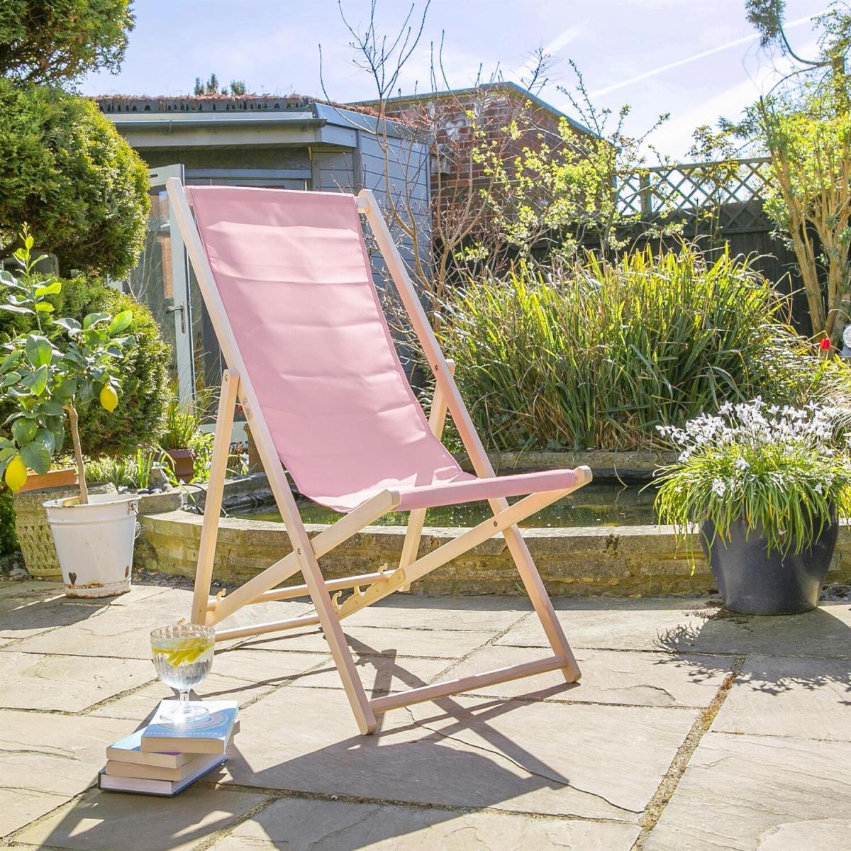 This light pink wooden folding sun lounger adds a charming, relaxed vibe to any outdoor space. I love how its soft hue can complement both minimalistic and more vibrant garden schemes, making it versatile for different styles. It works particularly well in relaxed, coastal, or rustic settings, where natural materials and pastel accents create a cohesive look. Practical styling tips include pairing it with neutral or patterned cushions for extra comfort, and placing it amidst lush greenery or decorative outdoor textiles to make it a focal point. Its foldable design also makes it perfect for easy storage when not in use, seamlessly blending functionality with style.