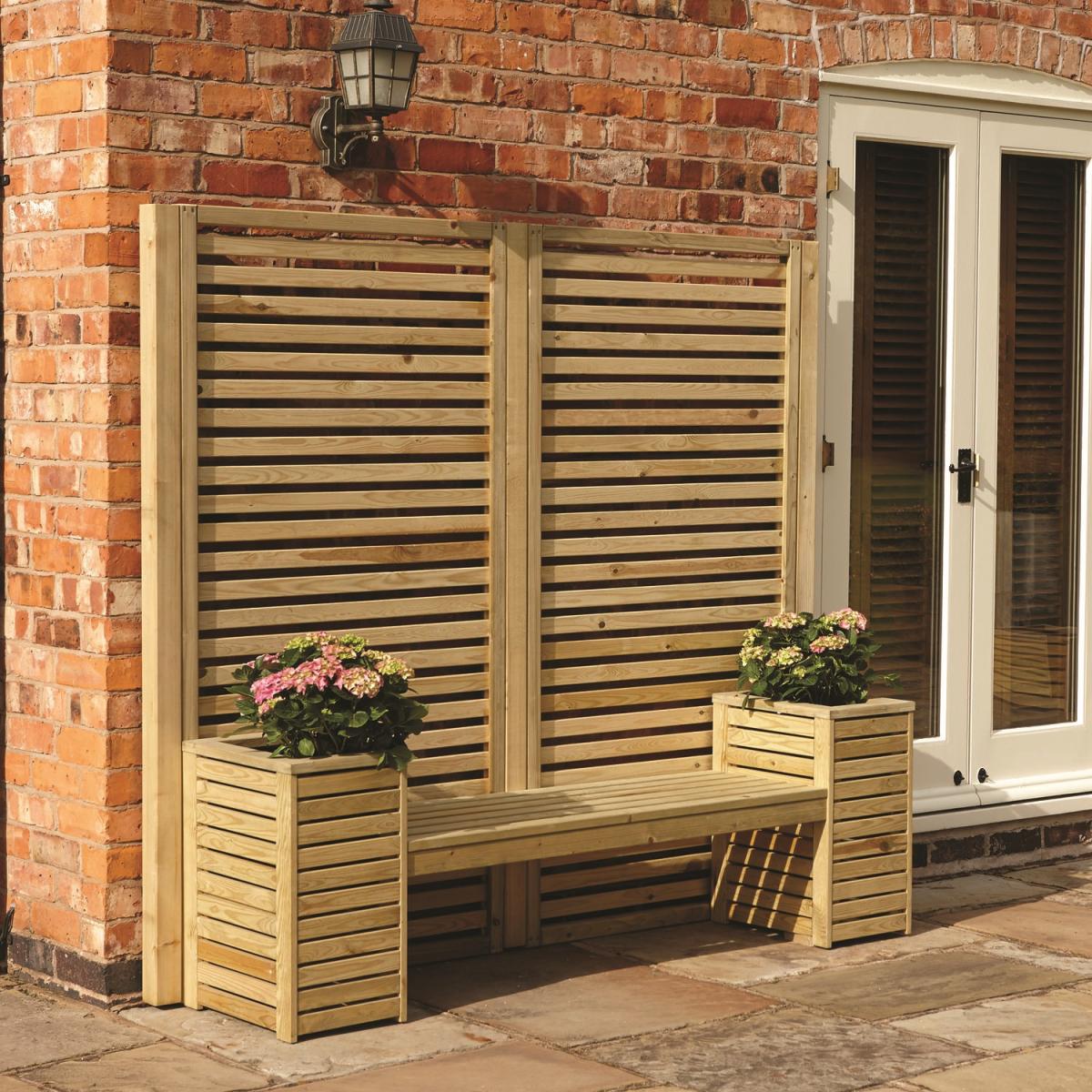 Dimensions. H183 x W201 x D67 cm Please note We are unable to deliver to Ireland. Features. Natural timber finish. Made from quality FSC softwood2 Horizontal screens2 Pre-assembled planters. Planter liners included. Bench seat3 Pots included. Pressure treated to protect against rot.
