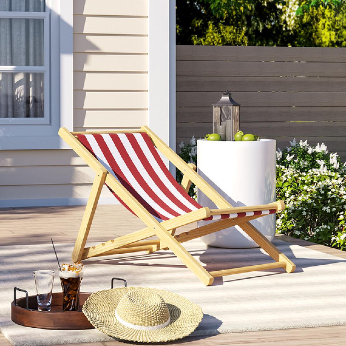 Wooden Garden Chair Beach Seaside Deckchair Foldable Striped Sun-lounger - Red