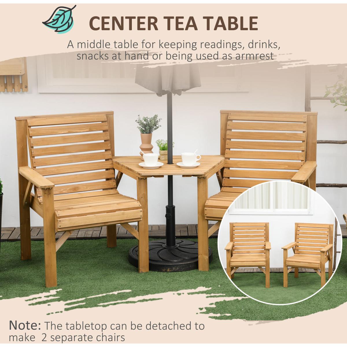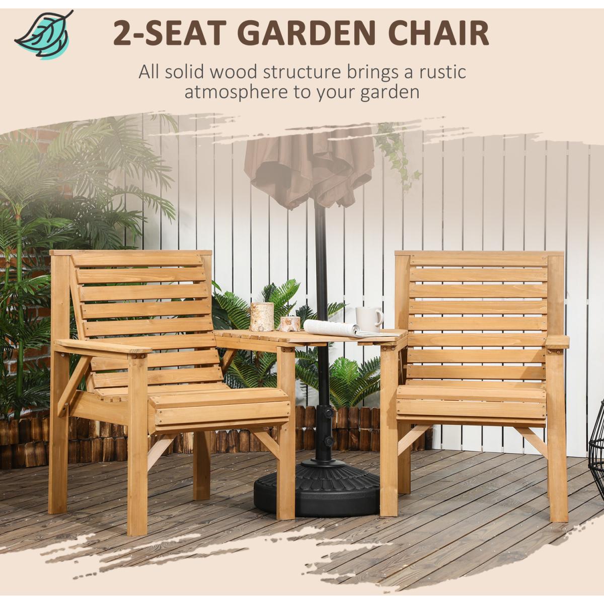 Get the most out of the warm weather, with a friend, thanks to Outsunny. This garden seat forges two seats and a table together into one design - enjoy outdoor time with company. Made from fir wood for a strong structure, with a paint coating to protect the wood. The middle table creates a handy resting spot, with a centre hole to hold a parasol - keeping you safely shaded in the sun. A slanted back and armrests complete this piece to give your body support as you rest.