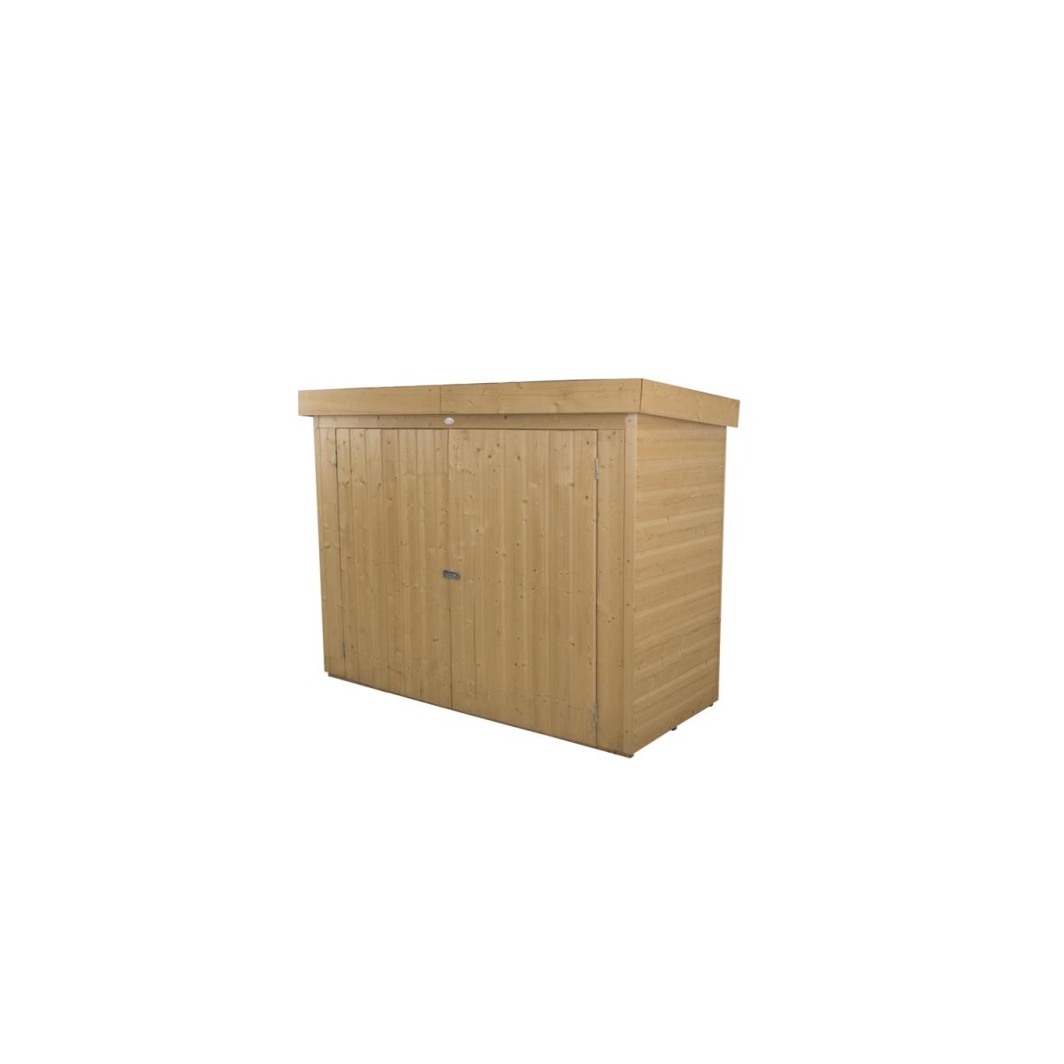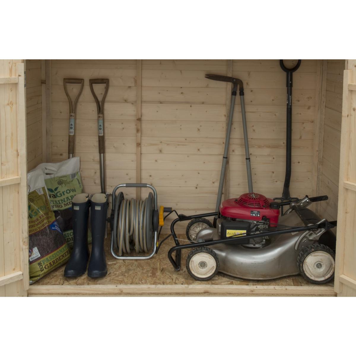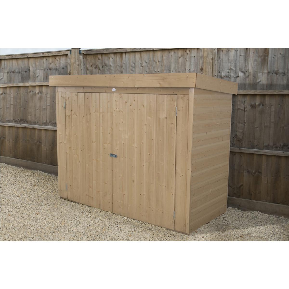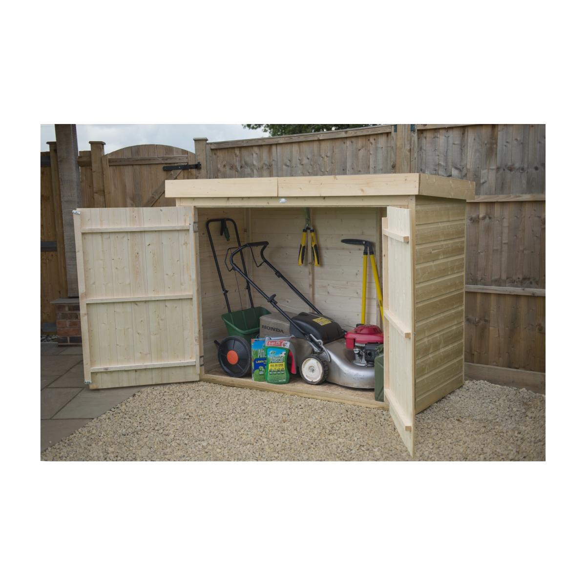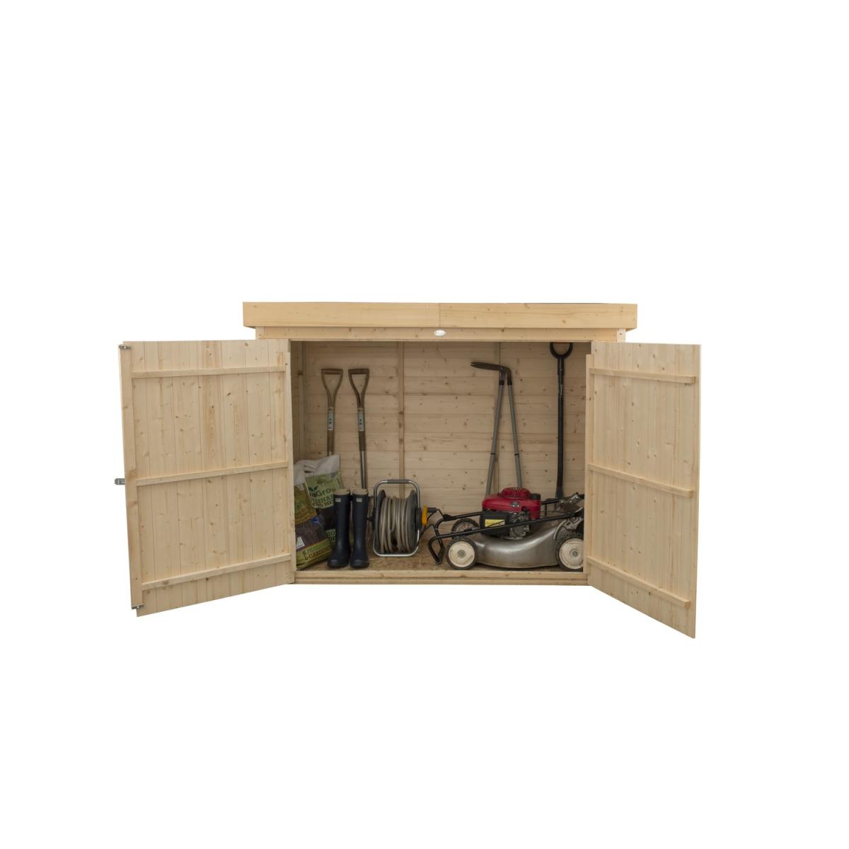 If you are looking for a stylish alternative to a shed, the Shiplap Large Outdoor Store from Forest Garden is a practical and great looking solution. With a generous 2000 capacity it is ideal for storing larger garden equipment, furniture and barbeques. Large double doors also mean it is perfect for use as a mower store or bike store. This robust, high quality outdoor store is manufactured using smooth-planed, pressure treated, shiplap tongue & groove boards and will look good in any garden or outdoor space. This subtle yet practical unit is also mounted on pressure treated bearers to prevent damage from standing water. The pressure treated store has a 15 year guarantee against fungal decay. Additional smooth-planed decorative barge boards all-round give an attractive finish. The doors can be closed using turn buttons provided and locked secure with the use of a padlock on the plate hasp and staple latch. The clever design also means the high quality, green mineral felted Pent roof can be assembled sloping back or forward depending on preference. Also available with Apex roof.