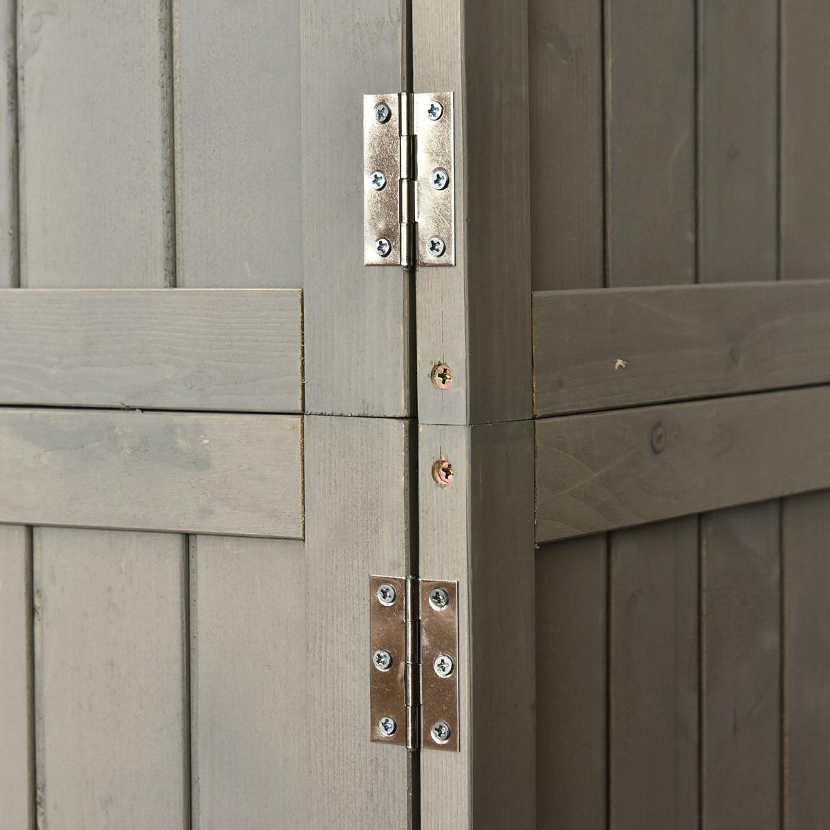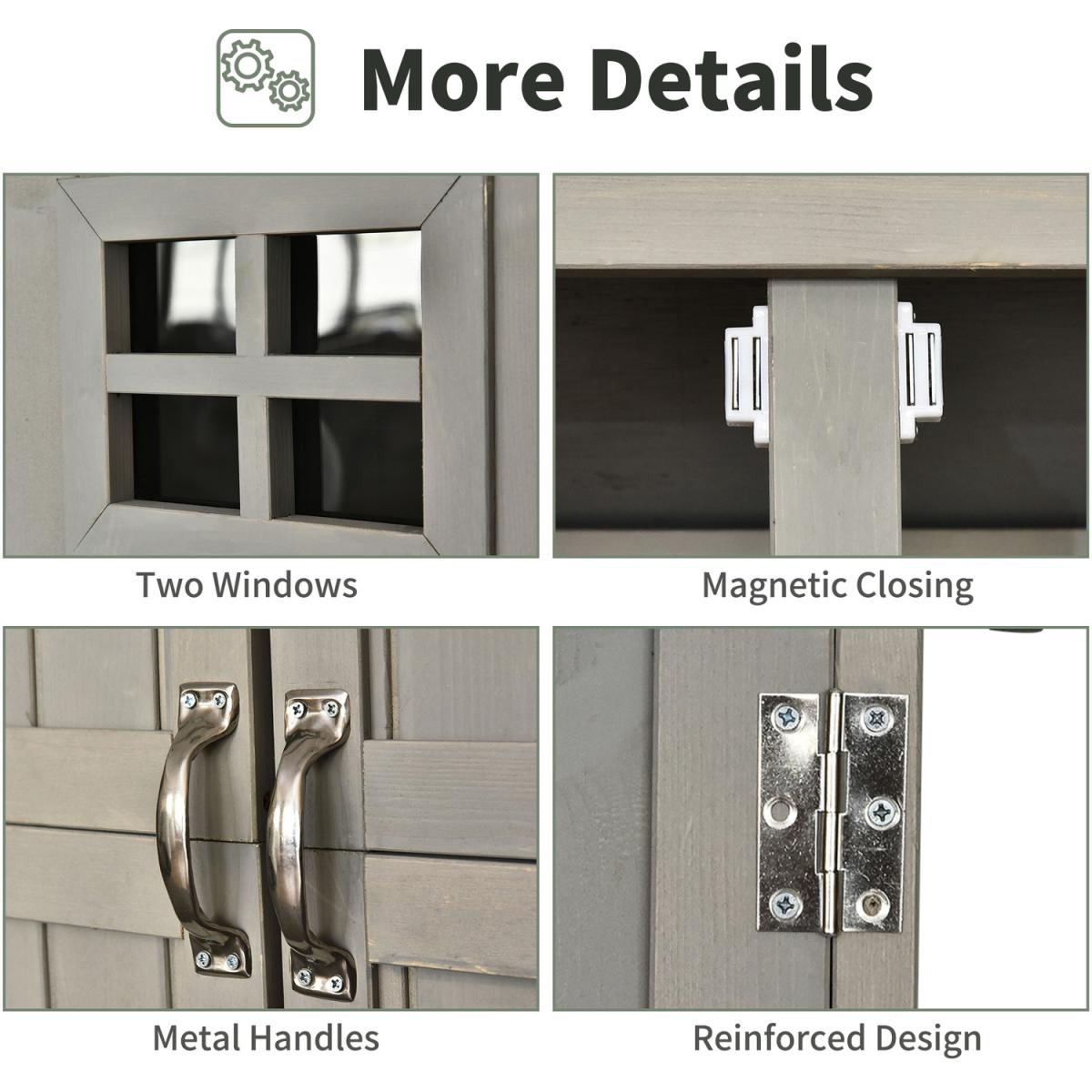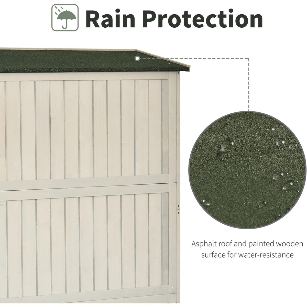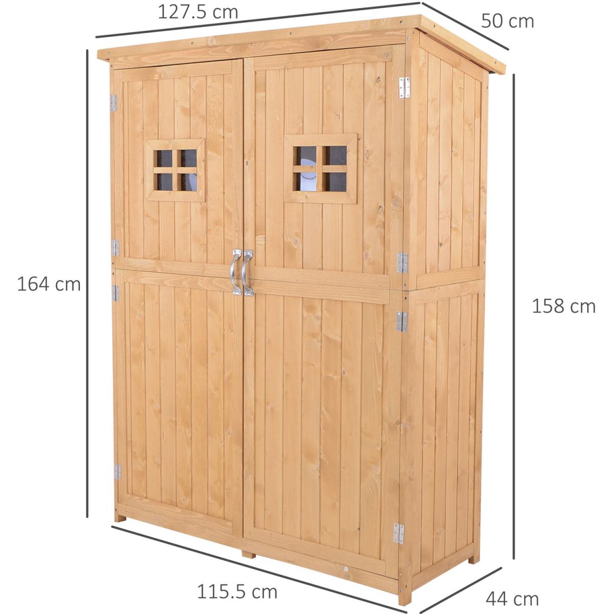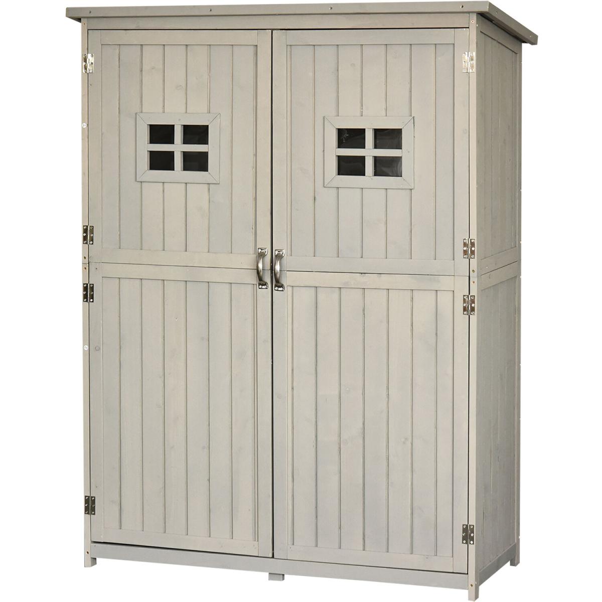 Give your gardening tools and outdoor essentials the perfect storage and organisation place with this outdoor shed from Outsunny. Made from solid fir wood for enduring reliability and strength, with a light grey waterproof top coat to protect against the mild elements, the tool cabinet features three shelves on the right and the other half is kept shelf-free, leaving plenty of space to store small and larger sized items alike. With two windows on the front and asphalt on the tilted roof to prevent water from seeping through, this vertical storage shed is finished feet for stability and a magnetic closure for easy opening and closing. A stylish solution to all your garden storage needs.