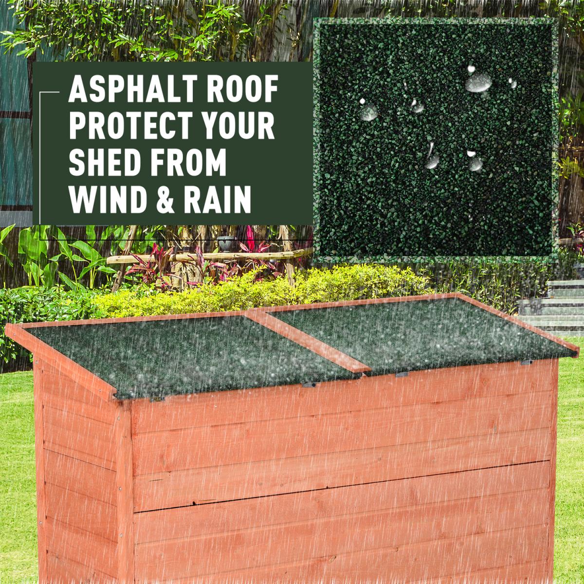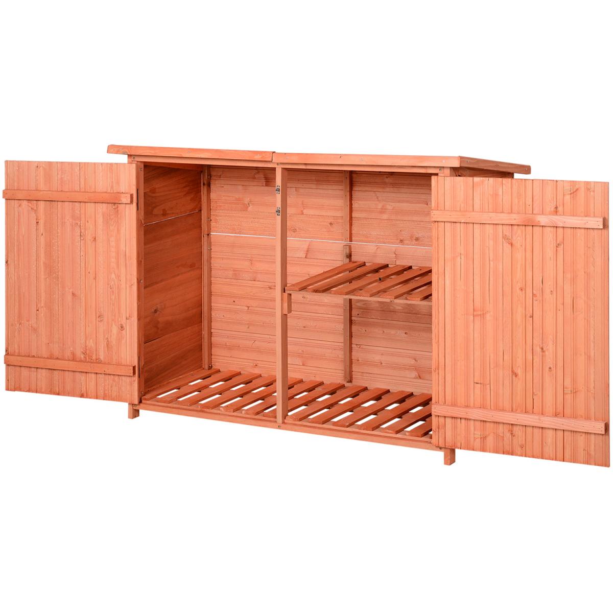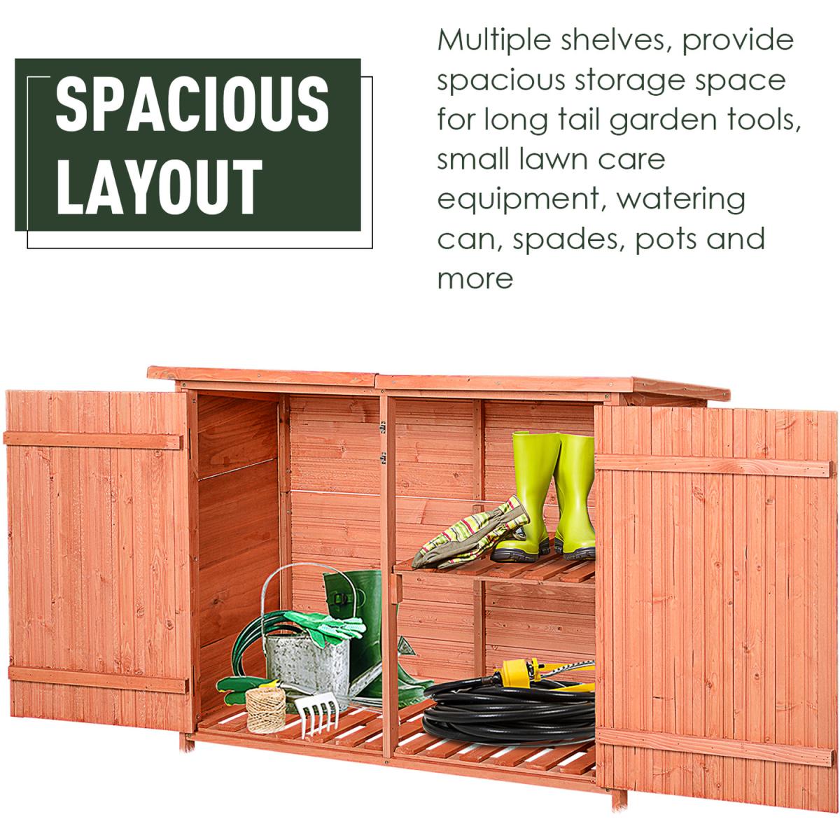 Give your garden tools and equipment their very own shelter with an outdoor shed from Outsunny. Using thick fir wood for solid and reliable strength, a storage shed is made into a low and wide design, allowing it to fit into shorter spots without comprising on storage space, with a waterproof paint topcoat to ensure it is able to provide reliable use outdoors all-year-round. Inside, two shelves are placed on the right for the organisation, with an open space on the left for keeping larger items stored and a slatted bottom so water and liquid don't build up and damage the wood. With two bolt locks for security and two wide opening doors, the vertical storage shed is finished with a sloped asphalt-covered roof to keep the inside dry.