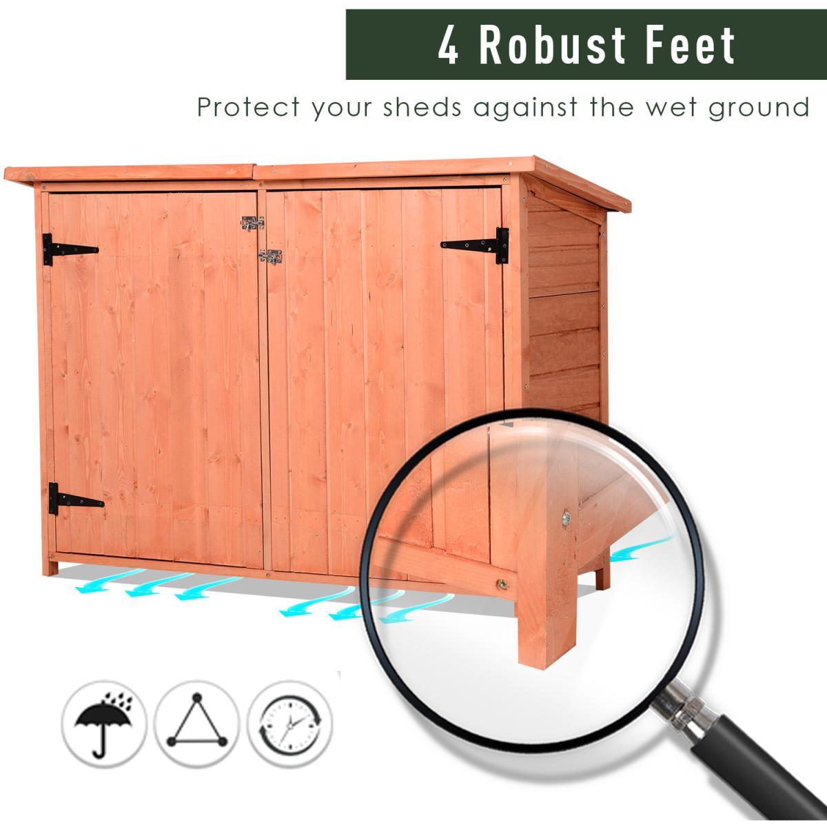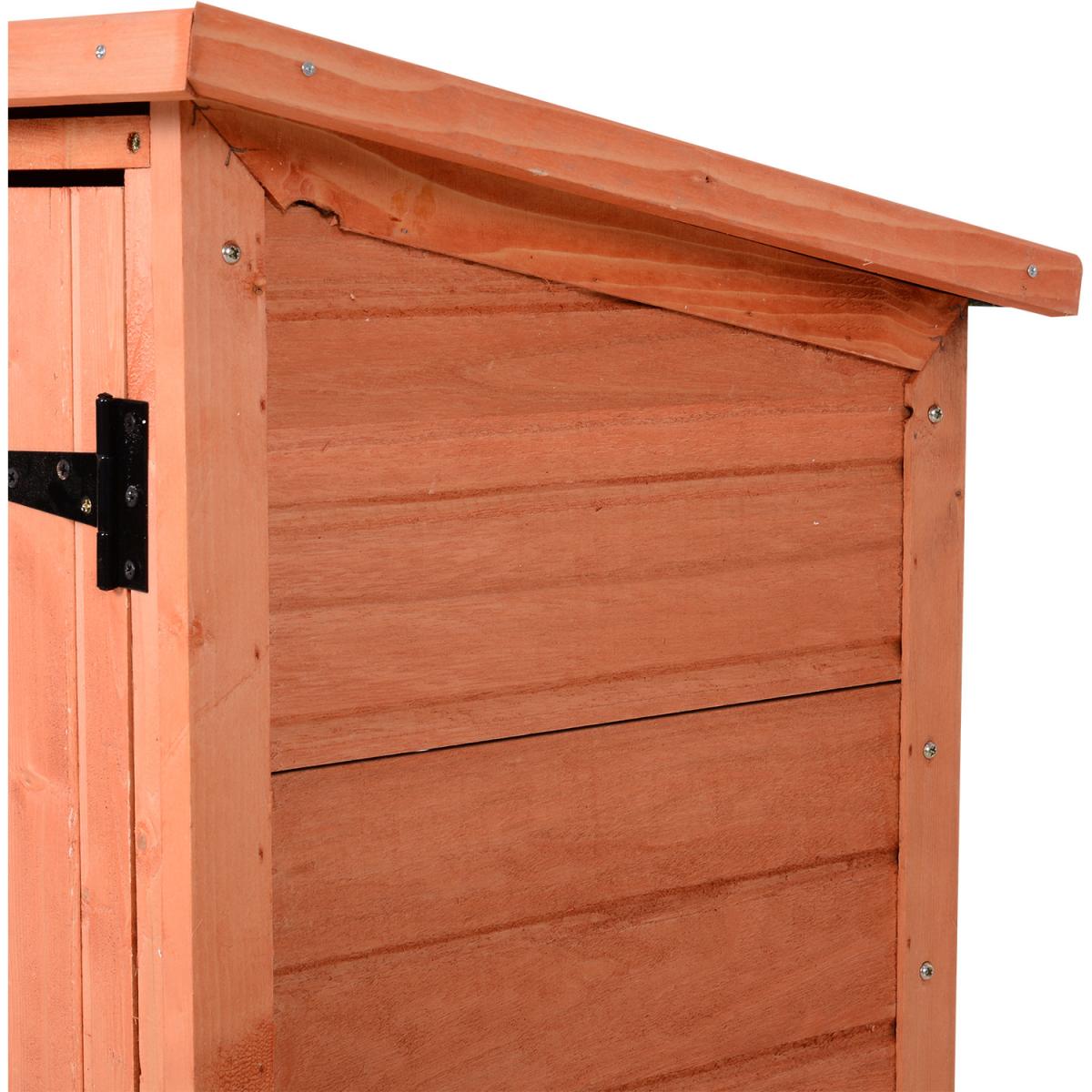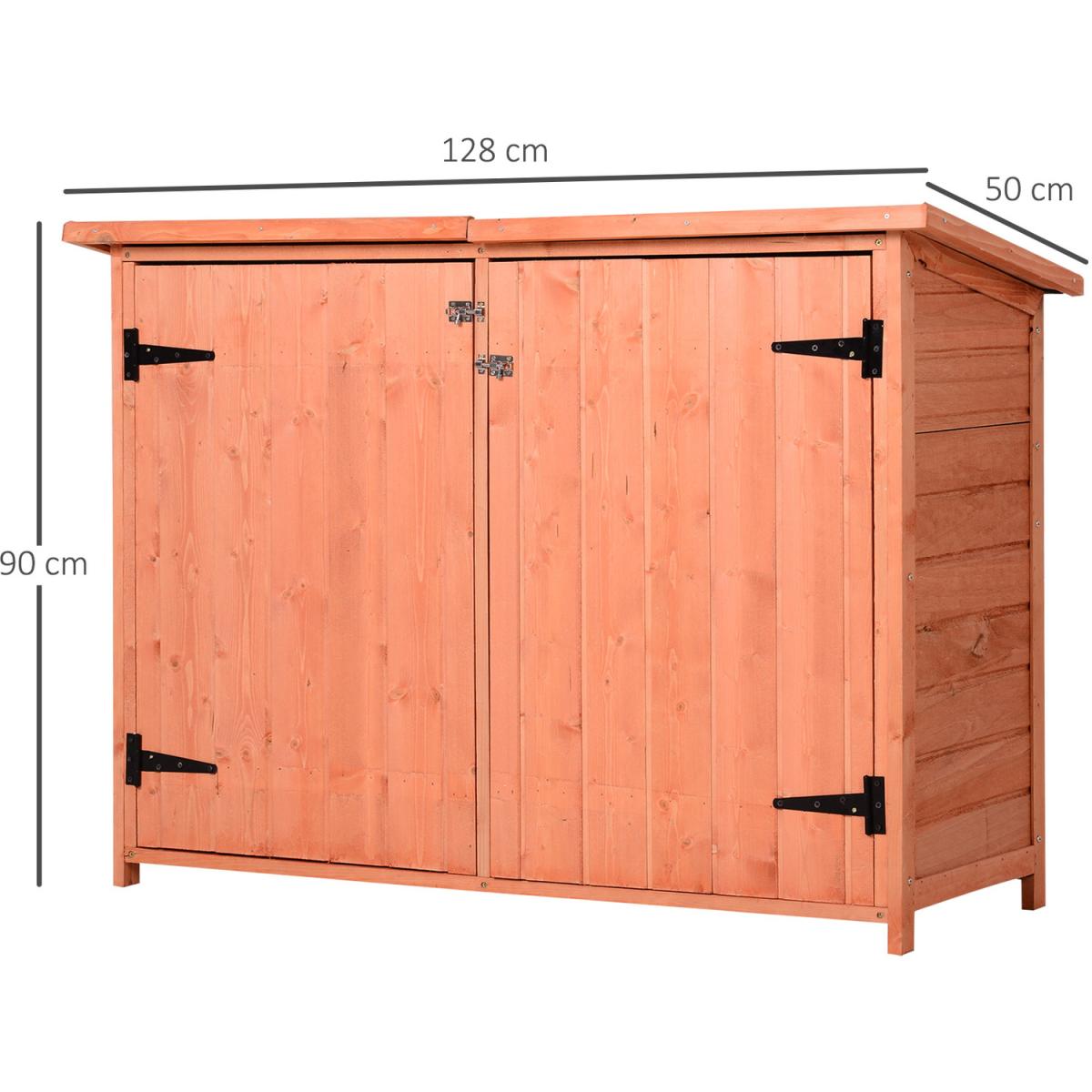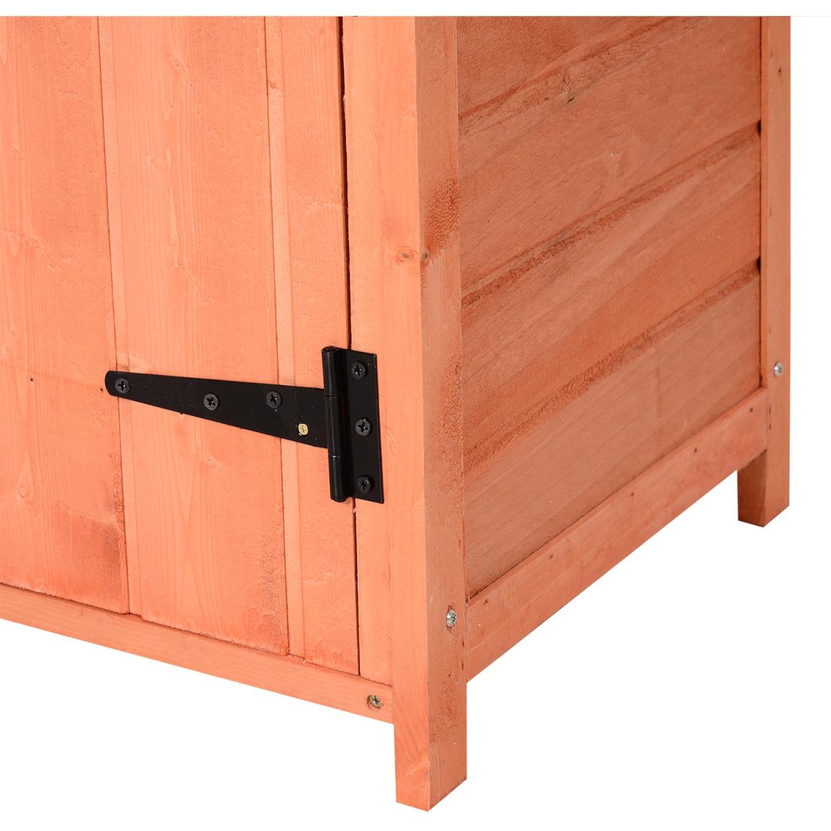 Give your garden tools and equipment their very own shelter with an outdoor shed from Outsunny. Using thick fir wood for solid and reliable strength, a storage shed is made into a low and wide design, allowing it to fit into shorter spots without comprising on storage space, with a waterproof paint topcoat to ensure it is able to provide reliable use outdoors all-year-round. Inside, two shelves are placed on the right for the organisation, with an open space on the left for keeping larger items stored and a slatted bottom so water and liquid don't build up and damage the wood. With two bolt locks for security and two wide opening doors, the vertical storage shed is finished with a sloped asphalt-covered roof to keep the inside dry.