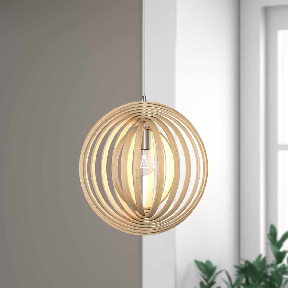 Features we love Handmade globe pendant light in natural wood Moveable rings can be placed in any arrangement. Looks great in any living room bedroom or dining roomE2. 7 and LED bulb compatible bulbs sold separately Sphere is 40cm in diameter with an adjustable cable All about me. Add pattern and texture to your living room bedroom or kitchen with this Scandi-inspired pendant. It would look great as a singular statement piece over a bed or dining table or buy a couple to create a focal point over your breakfast bar. Need to know. Shade dimensions. H40 x W40 x D40cm Total dimensions. H120 x W40 x D40cm Weight. 0.81kg Fixture design. Ceiling pendant Number of lights. 1 Bulb type. E27 Colour. Brown Finish. Wood Material. Iron and wood LED compatible. Yes Bulb included. No Fixings supplied. Yes.