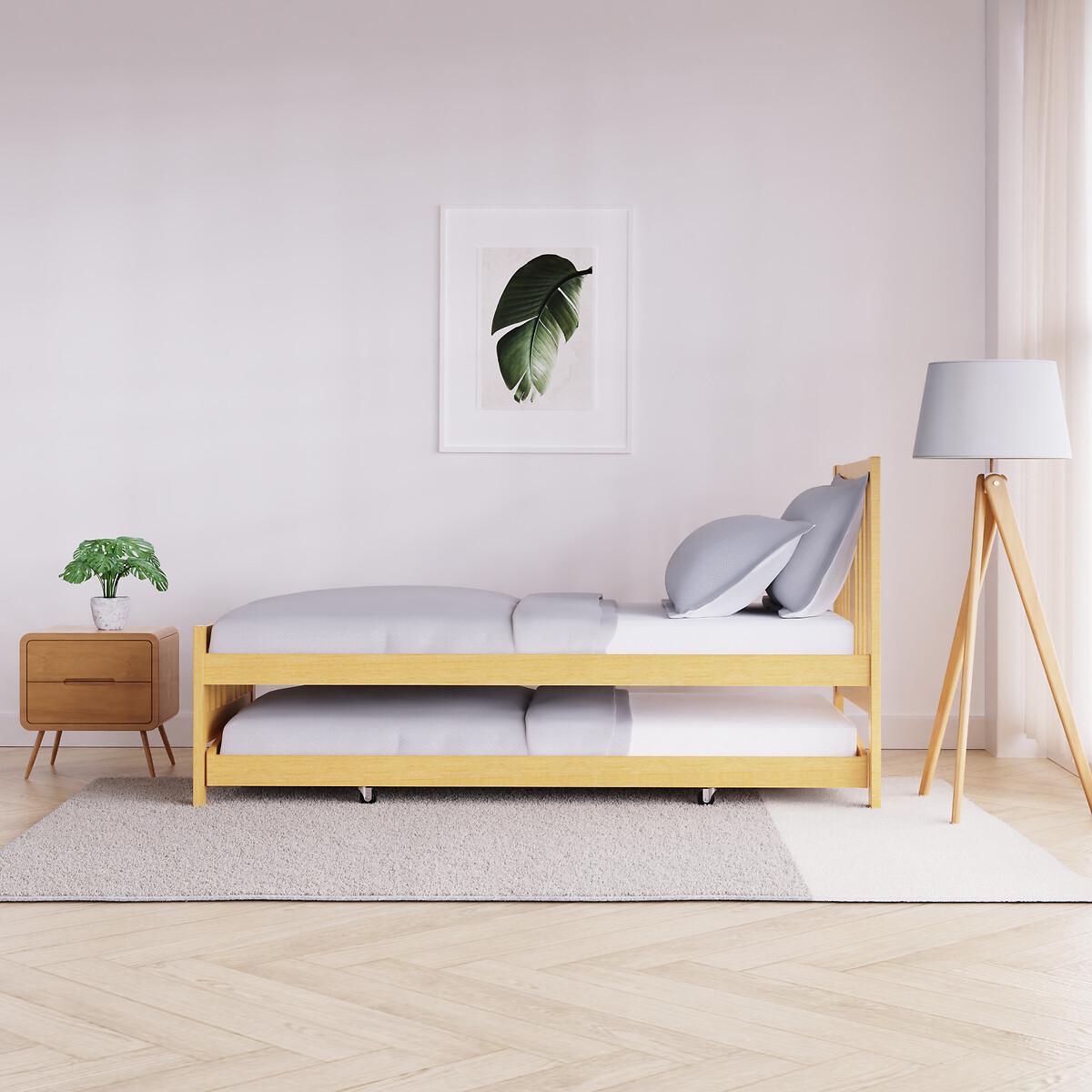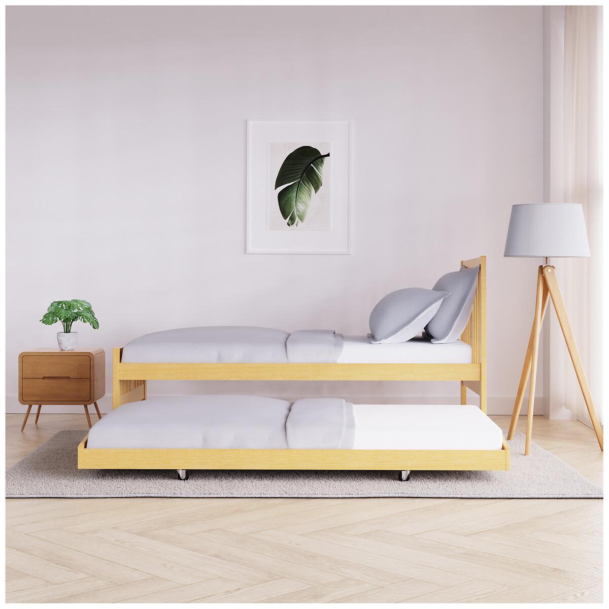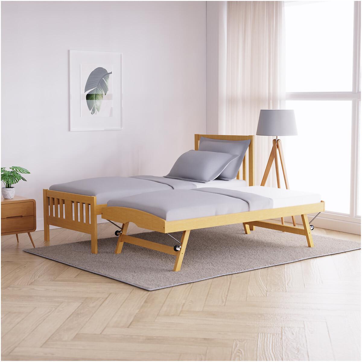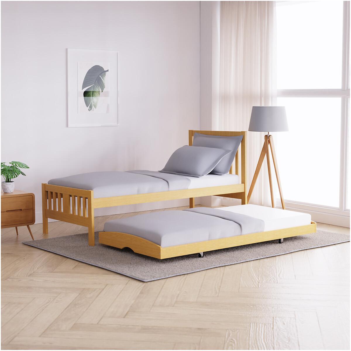 The natural oak wood finish gives this guest bed a beautiful and timeless appearance, with the added convenience of a pull-out trundle bed to fit any room. Product Details. Natural Oak Wood Pull Out Trundle Bed (Single Size)Supplied With Slatted Base Mattress Not Included. Assembly Required. Product Dimensions. Single: 197 cm x 97 cm x 102 cm , Weight - 44 KGParcel Dimensions. Single: Parcel 1 Packaged Dimensions - 109.5 cm x 108 cm x 9 cm, Weight 20 kg Parcel 2 Packaged Dimensions - 203.5 cm x 22 cm x 12.5 cm, Weight 17 kg Parcel 3 Packaged Dimensions - 203.5 cm x 29 cm x 14.5 cm, Weight 13 kg. This product will be dispatched by one of our trusted suppliers. You’ll be contacted by their selected courier about your delivery. Please note: this product cannot be delivered to all Offshore Islands, Northern Ireland or Republic of Ireland. KYOTO01