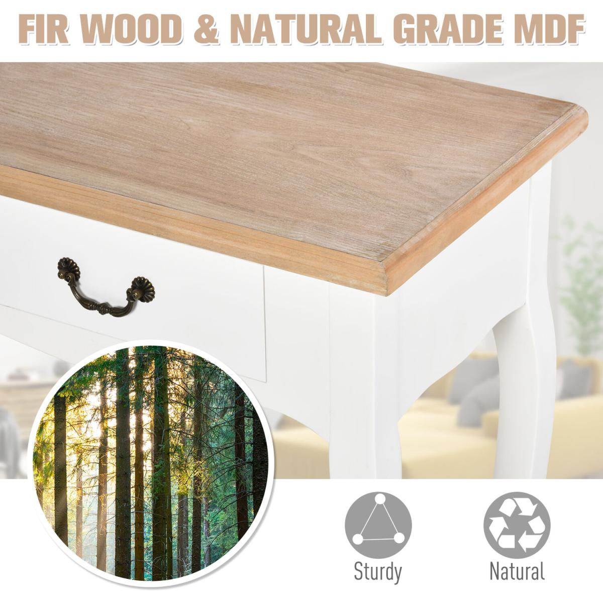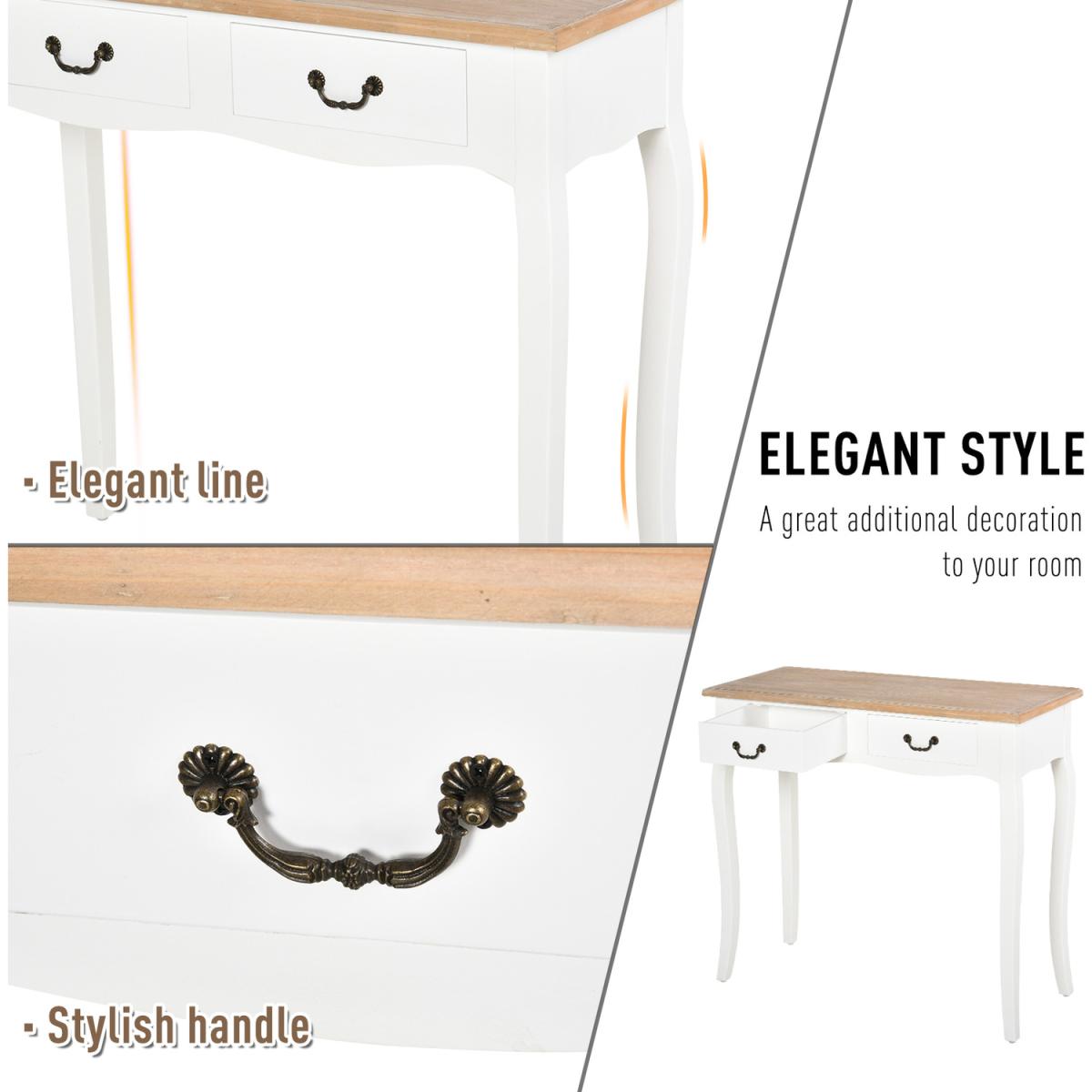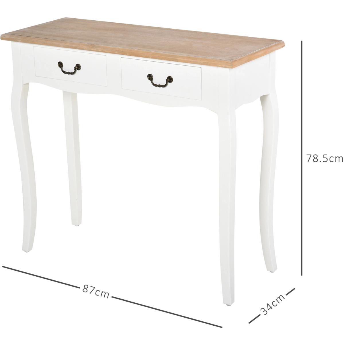 Let this console table lead the way for a homely vintage look this season. Also suitable as a side table in the bedroom, lounge and hallway. There are two drawers for convenient storage, both with faded-metal handles for extra authenticity. Structure made from MDF, this engineered wood is tough and sturdy, coated with white paint for a fresh look. Finished with an oak-wood effect top and slightly curved wooden legs for a steady touch of intrigue.