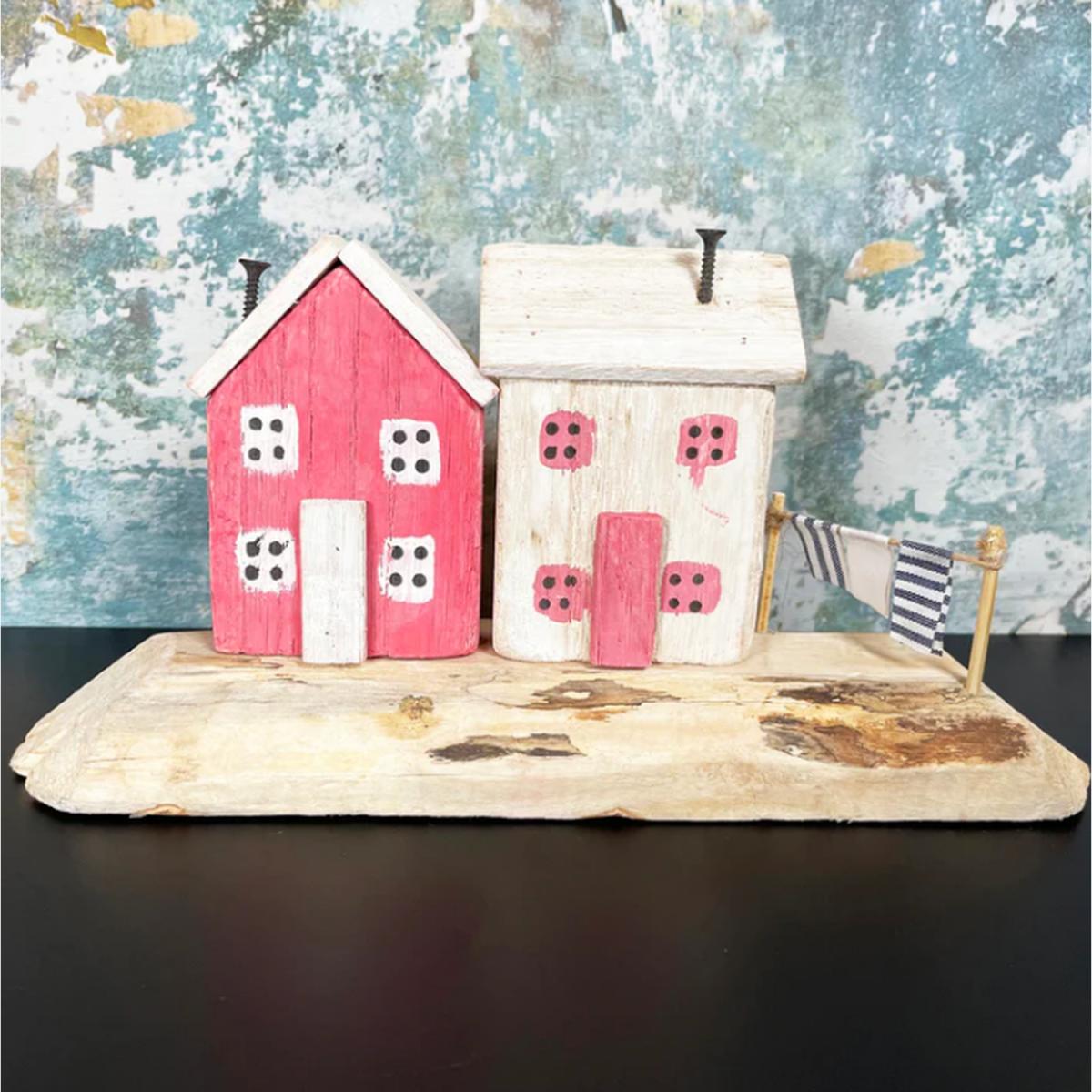 Wooden Harbour Cottages On Wooden Base 30cm - Pink