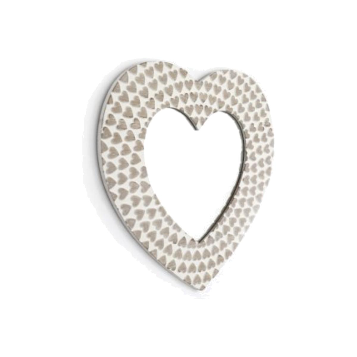 A chic wooden mirror with antique mini wooden hearts details. Complete with a white washed finish.