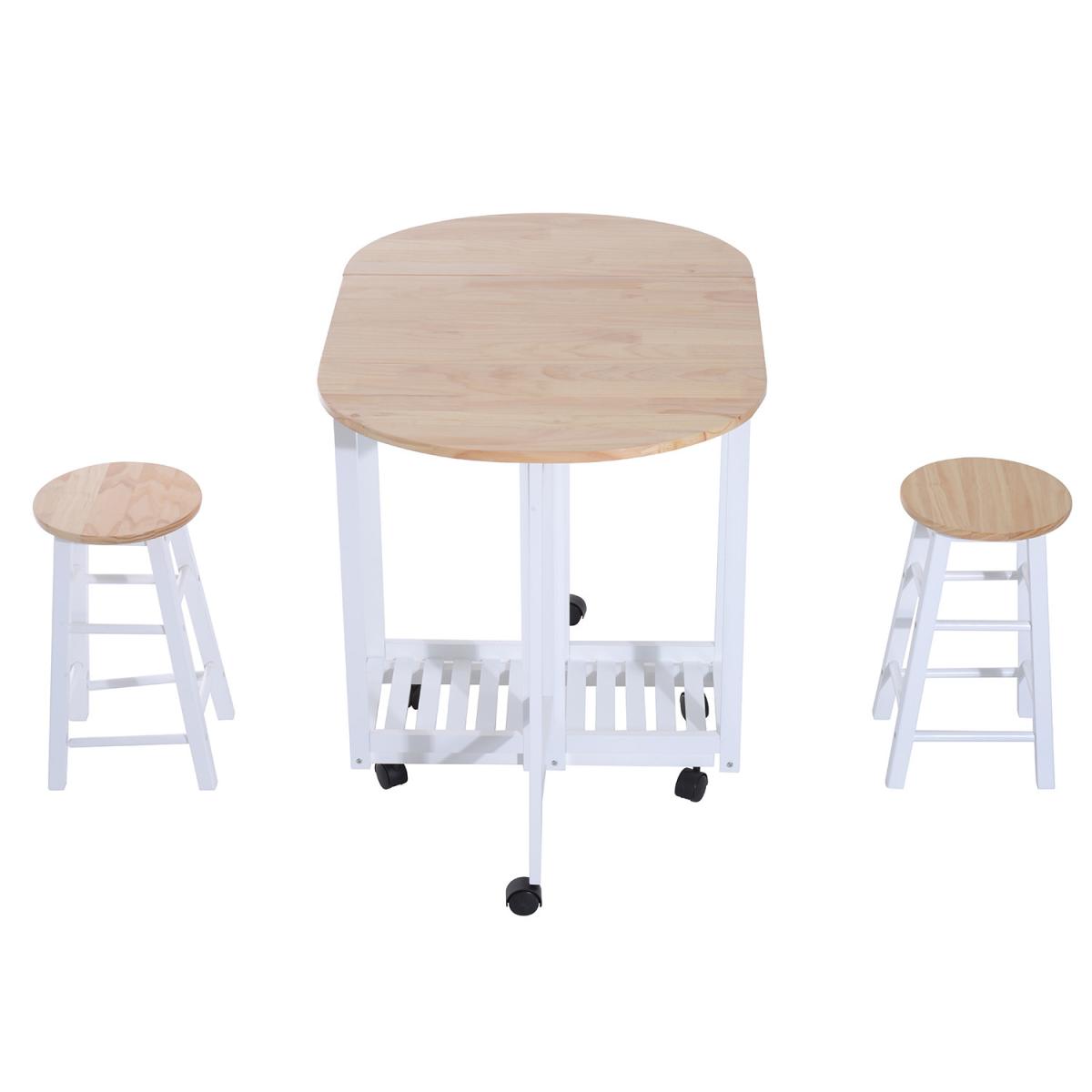 This HOMCOM multifunction trolley can be used as an extra work area or as a folding table, it comes complete with two stools for sitting, it make a great item to have when space is limited. The table side fold down when not in use or if extra seating is required just lift up the table sides and secure by moving out the wooden support. The stools can be easily be stored under the table when not in use and is very accessible when required. The whole table sits on wheels for easy movement and placing. This would be a great item to have in any home.