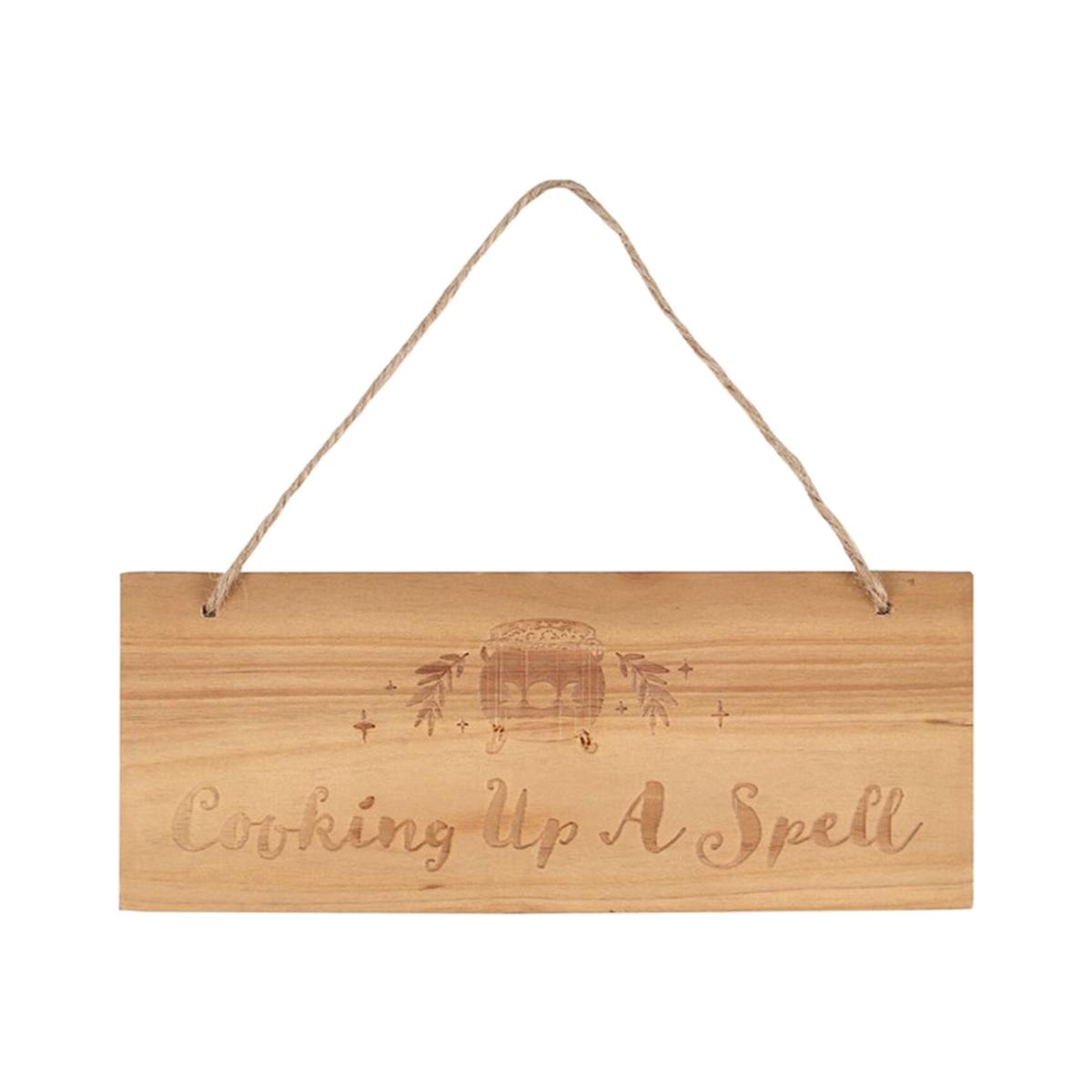 Wooden hanging sign engraved with the wording 'Cooking up a Spell' along with a cauldron design. A great gift idea for anyone who likes to work their magic in the kitchen.