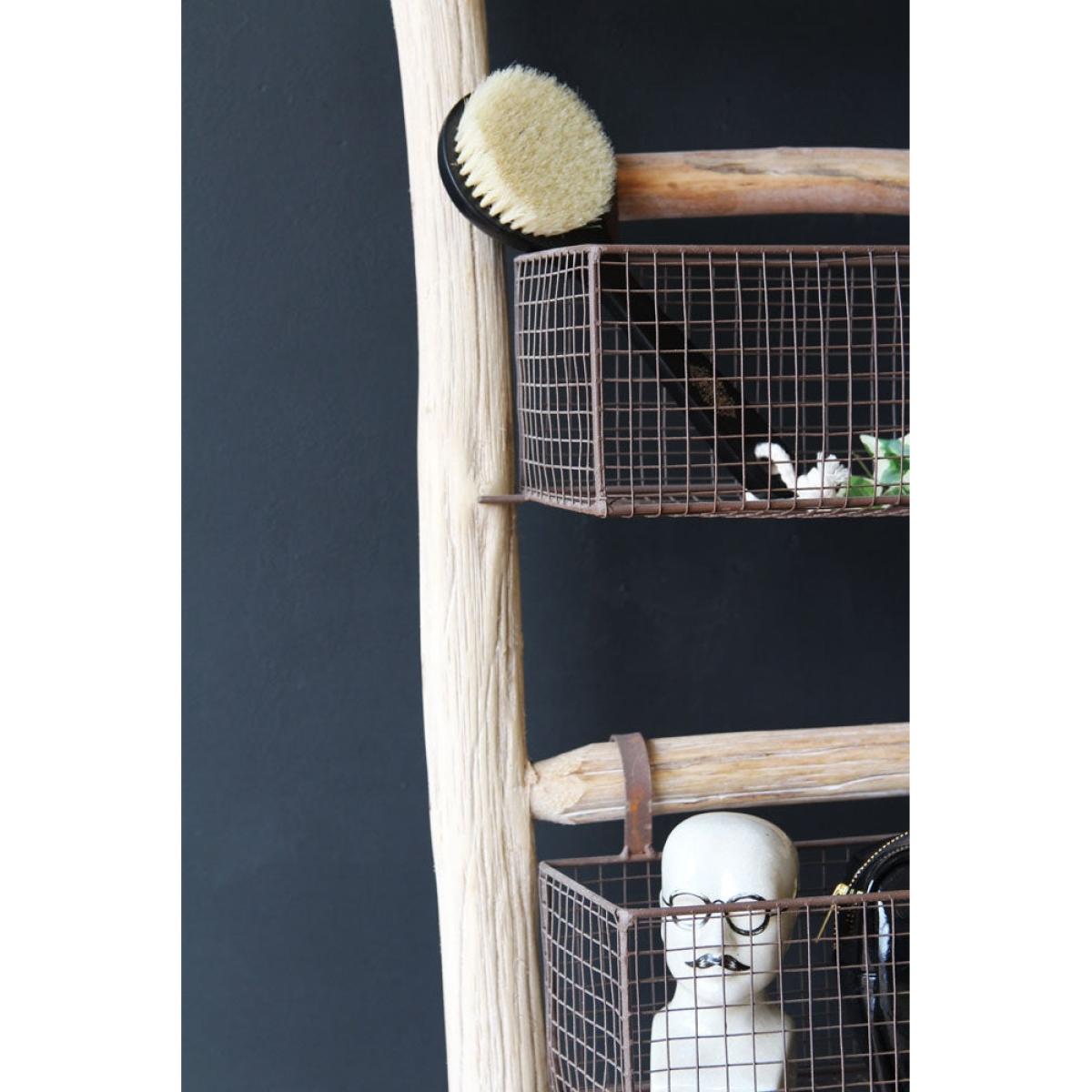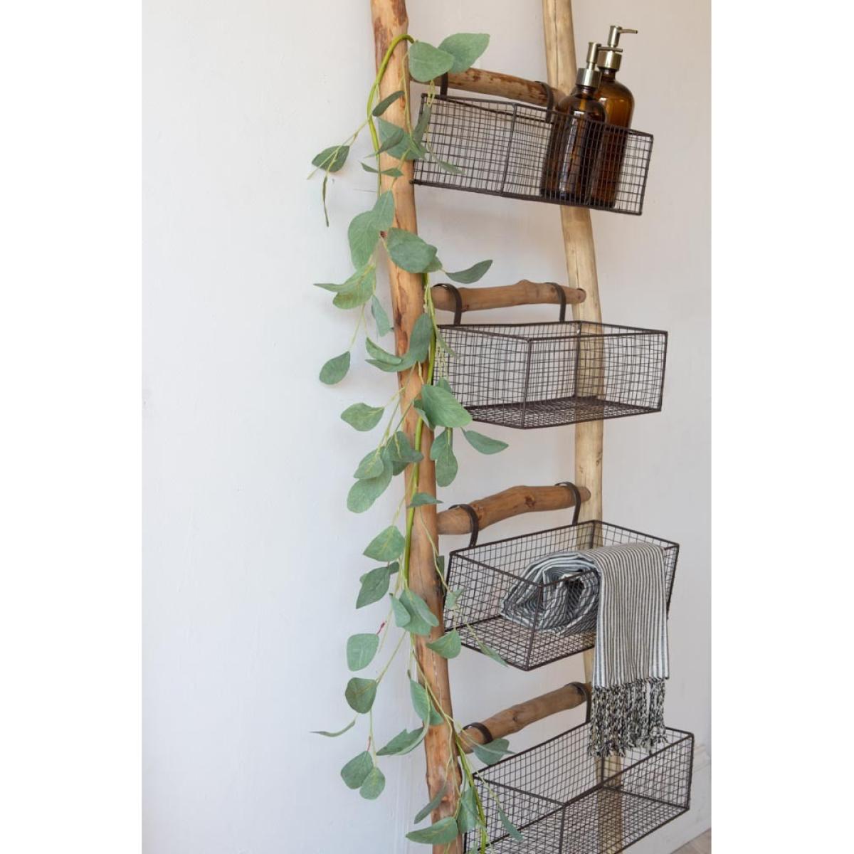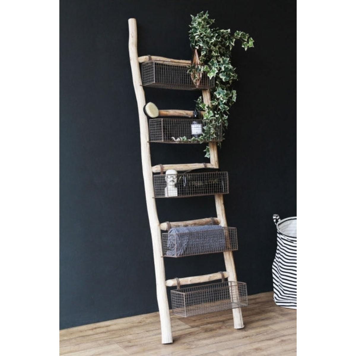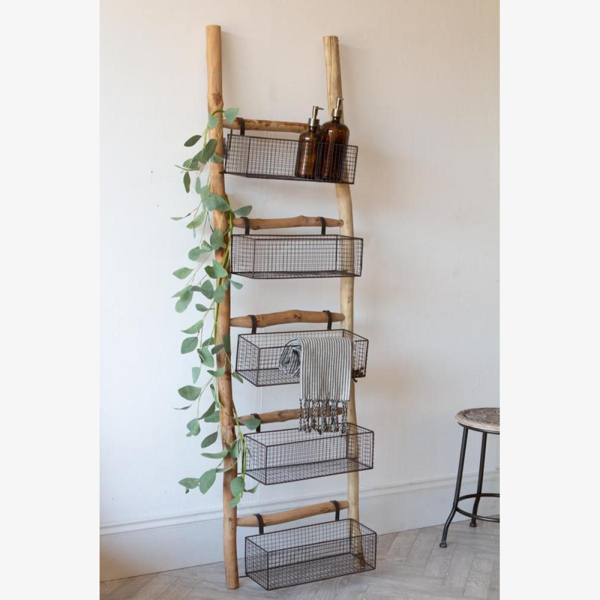 About The Wooden Ladder With 5 Baskets Shelves There is nothing to say that you couldn't display this Wooden Ladder With 5 Basket Shelves in a bedroom or any room that you wanted. But we think that it is particularly suited to the bathroom to keep all your toiletries and lotions and potions stored away in an exceptionally stylish unit. Why We Think You'll Love The Wooden Ladder With Baskets The main frame of the ladder is made from wood and looks like tree branches which then contrasts authentically with the iron baskets set on the ladder rungs. Shelf units can be a bit plain and boring but this ladder shelf is a great alternative to standard storage solutions and will be a great feature to your interior design.