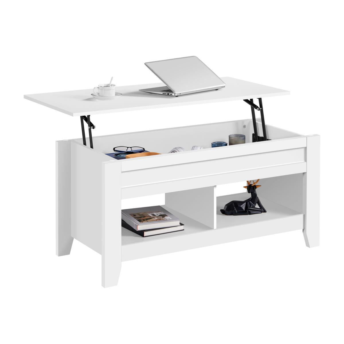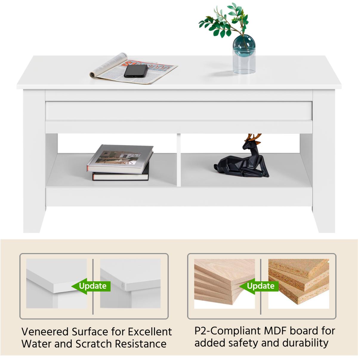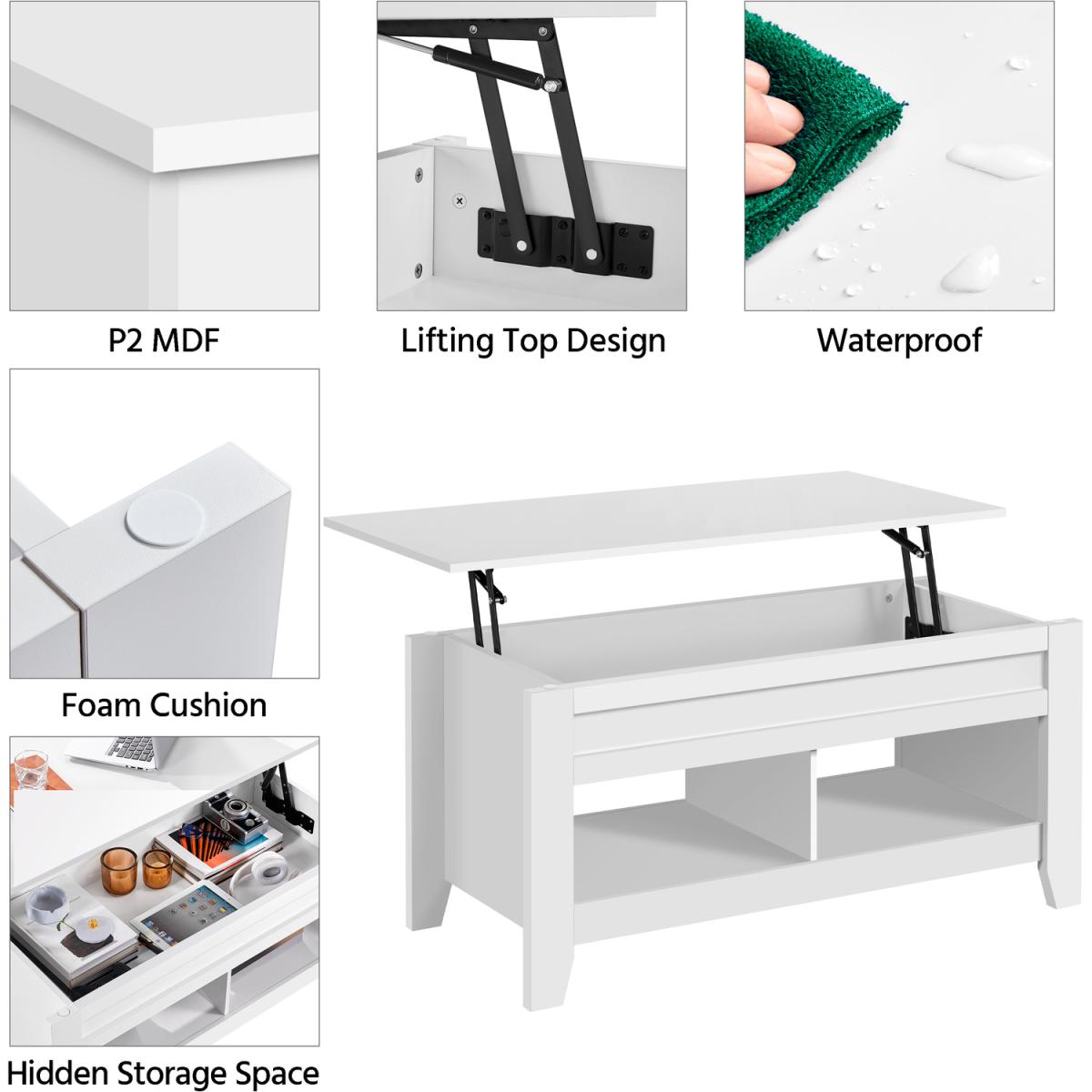 Double up the style and functions in your living room with this lift-top coffee table. It features a sizable hidden storage compartment under the top and a lift-up tabletop with customizable heights of 49 cm and 62 cm. Constructed from E1-compliant MDF and water- and scratch-resistant laminated surface, this lift-top living room table features high strength and is easy to maintain. The large storage space and versatile lift-top design make this coffee table a must-have for small living rooms, lofts, great rooms, condos, family rooms or dens. Simple assembly is required.