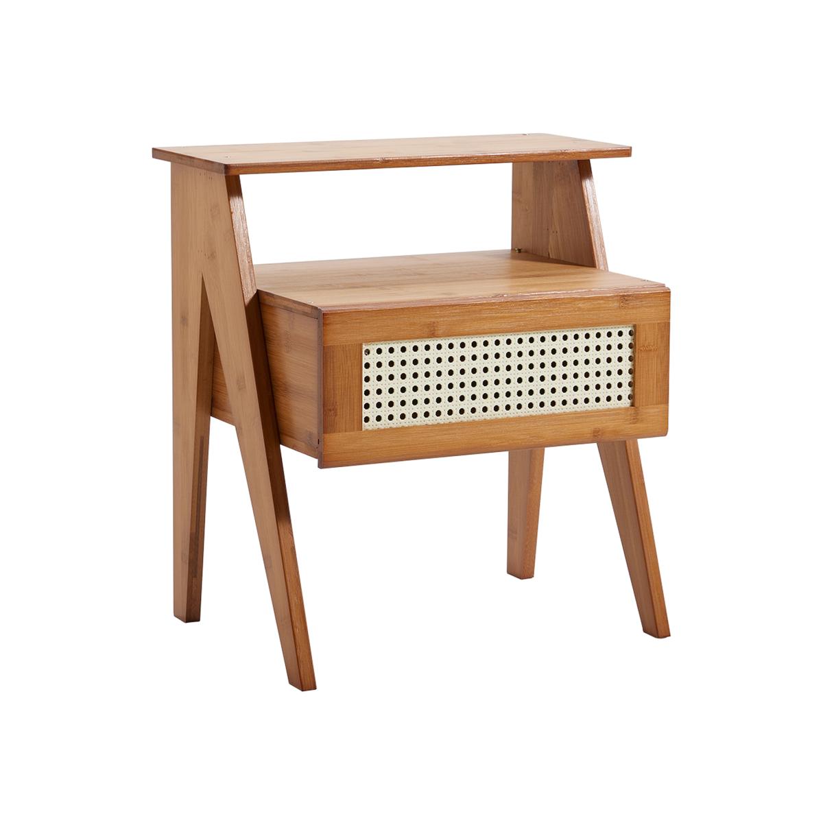 Crafted from premium natural wood, this contemporary nightstand combines durability with a timeless, elegant design. Its warm, rich hue complements the sleek frame, featuring a drawer with a chic plastic rattan front and a convenient top shelf. The drawer offers ample space for storing personal items like books, glasses, or other essentials, while the open shelf is perfect for displaying decorative pieces, alarm clocks, or a touch of style. With its blend of practicality and modern charm, this nightstand is a perfect addition to any bedroom.
