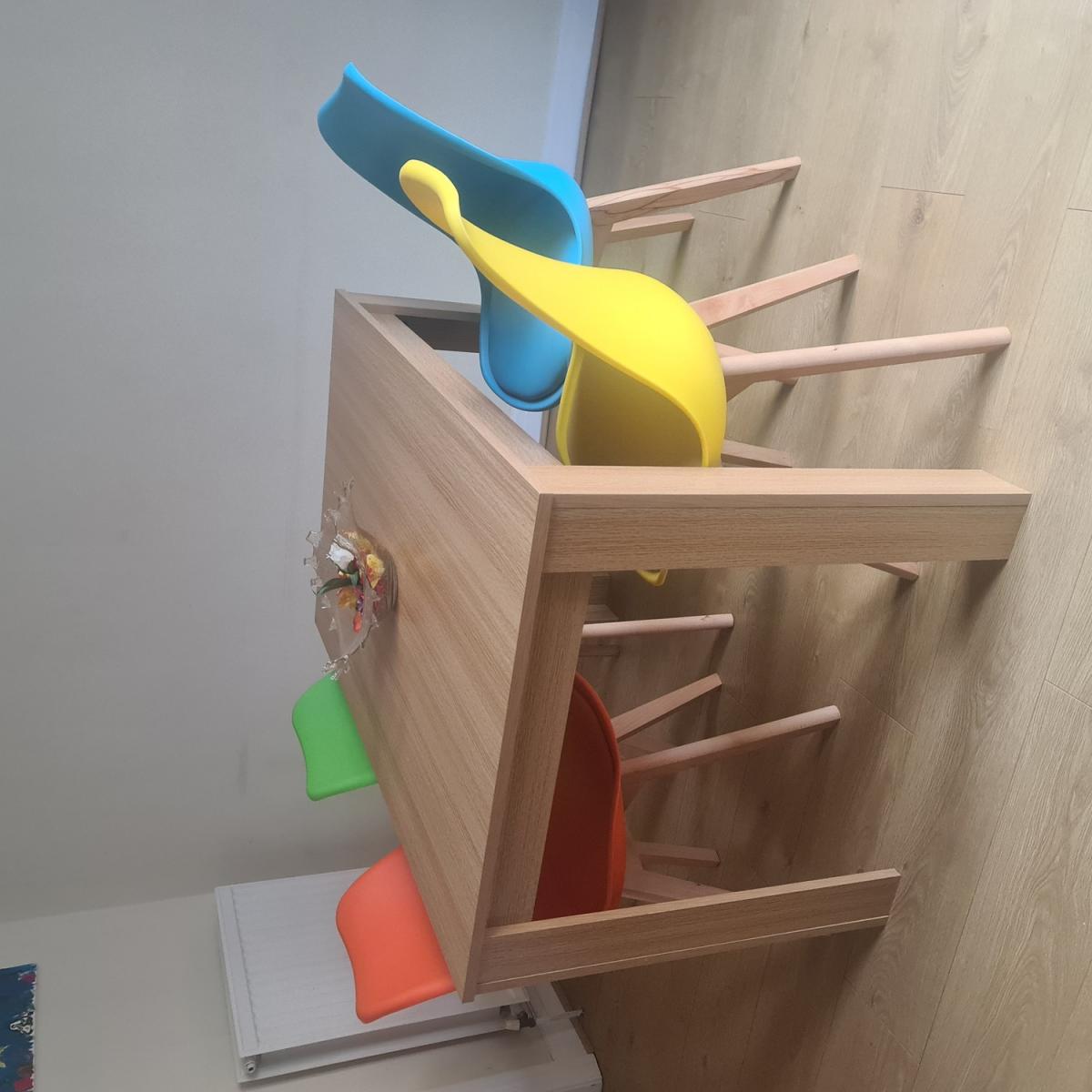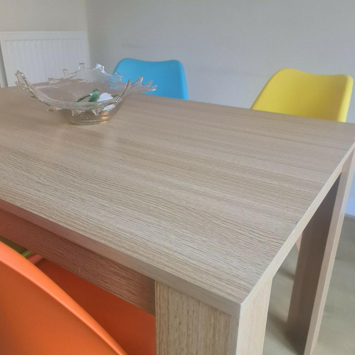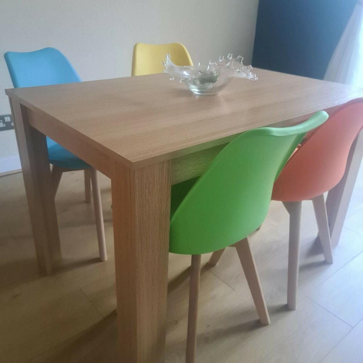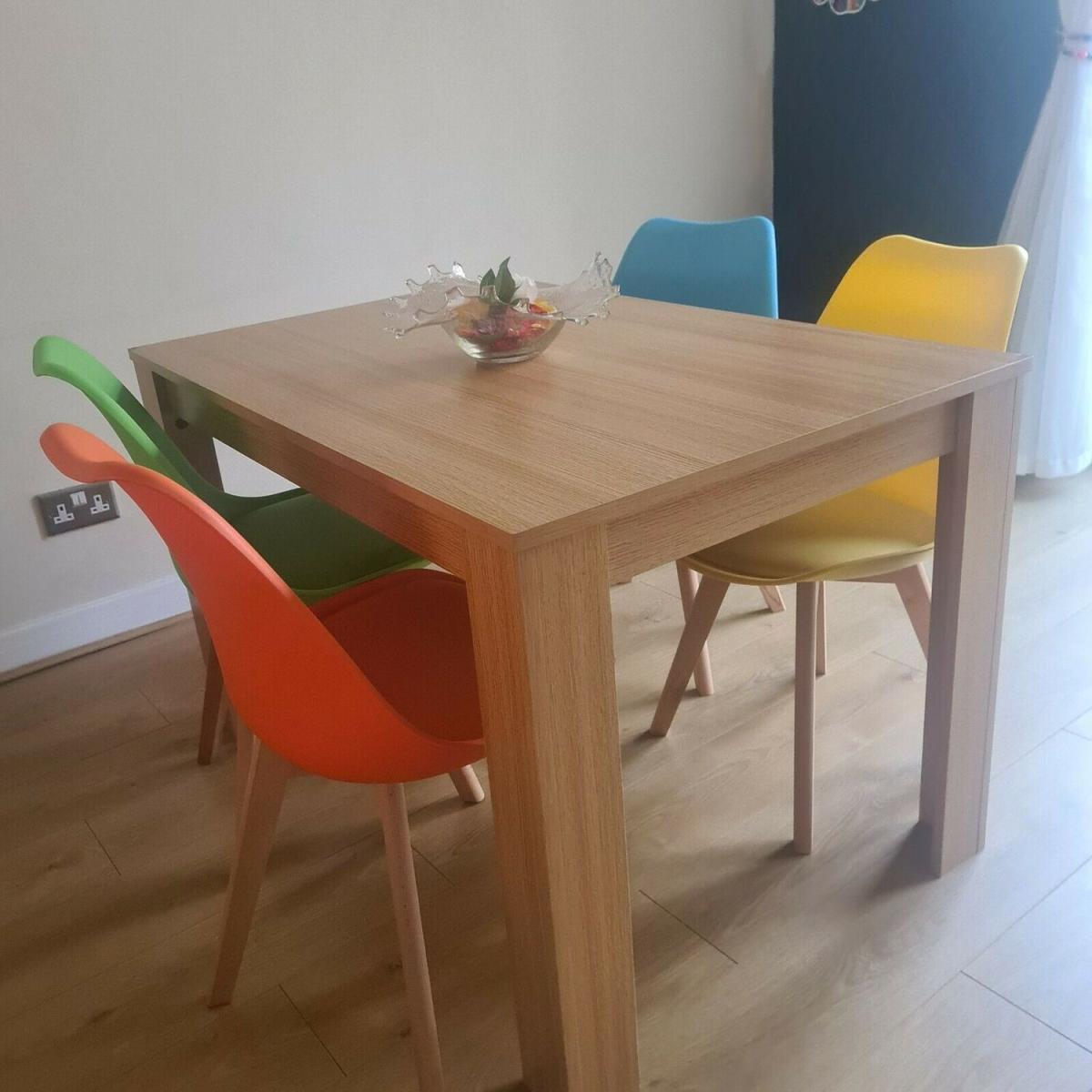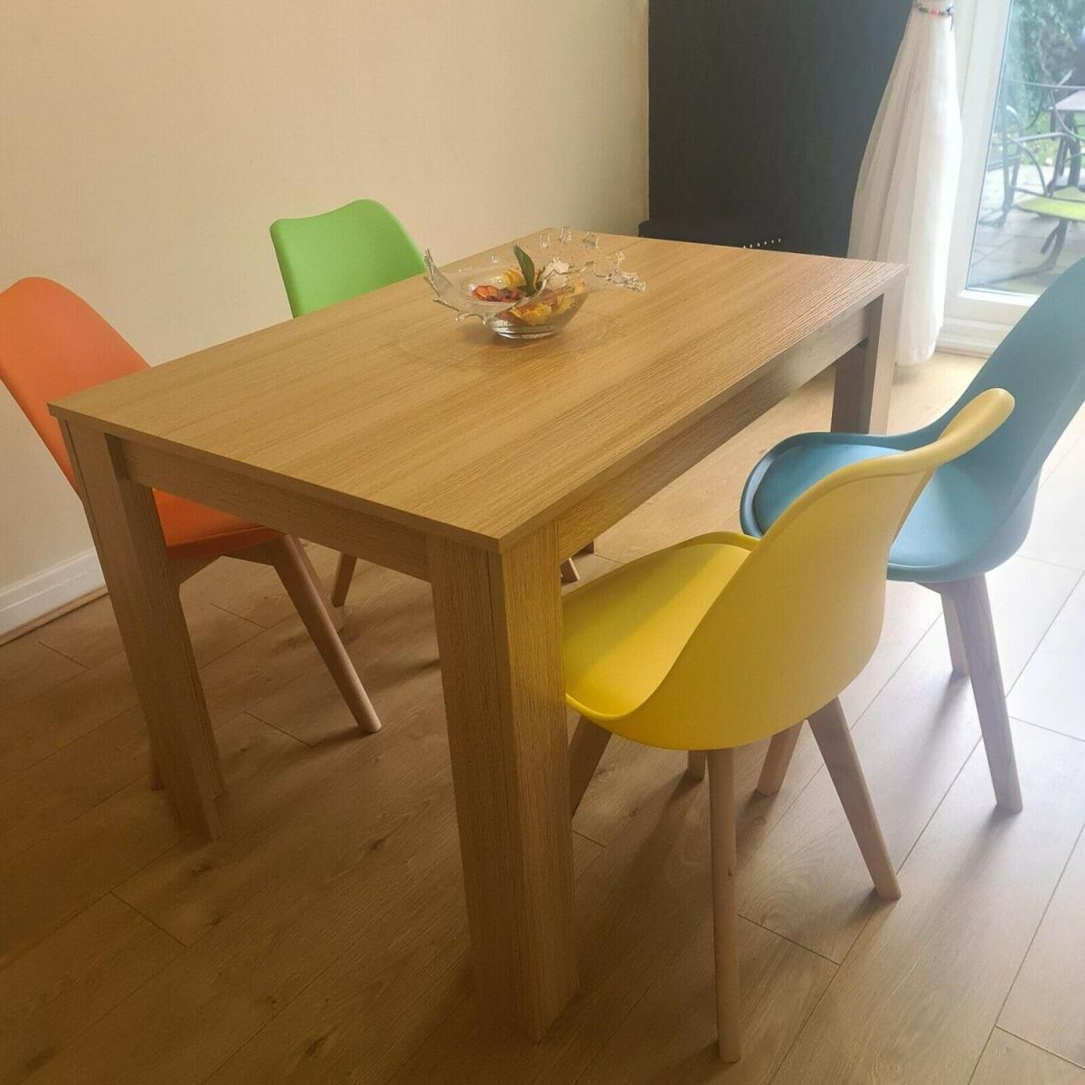 Kosy Koala Modern oak kitchen dining table and 4 padded colourful chairs. Available in a beautiful range of colours to suit your home. Transform your dining room or kitchen with this stunning modern table and colourful chairs. A great addition to your dining room or kitchen that is both modern and eye-catching. The chairs are of a classic design, the plastic curved so sophisticatedly and it has a cushioned seat for that extra comfort. This amazing set is available to order as a set with a collection of different colours. This gorgeous table and chairs come in a range of colours to compliment your dining room.