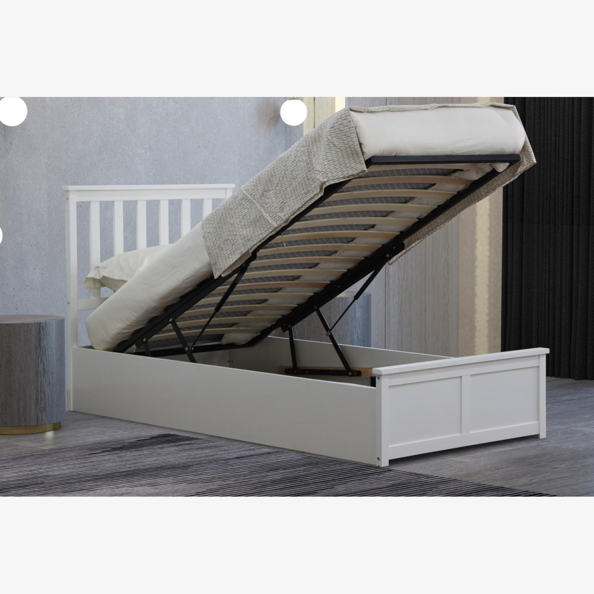 This solid wooden ottoman storage bed is perfect for creating extra space in your bedroom. With a huge under-bed storage compartment featuring easy dual gas lift access, this bed makes a classic and practical addition to any bedroom. The contemporary design and neutral white colour are bang on trend and sure to effortlessly fit in with your bedroom interiors. Your bed has been specially designed to provide even more under-bed storage space. The bed base is 30cm deep which allows you to fit even more items under your bed. The under-bed storage compartment is perfect to fit duvets, clothes, pillows and any other items you need to store away. The bed comes with a fabric base which means your items will not directly touch the floor, keeping them clean and safe. This ottoman storage bed frame features solid sprung wooden slats providing added support and extra comfort to help you get the best night's sleep possible. The perfect base for your mattress to help you drift off to sleep that much faster. This ottoman bed set is finished in hardwearing, high-quality hardwood. It has a strong steel internal frame and centre support legs. The quality construction of this bed results in a sturdy, durable frame making sure you have a comfortable place to sleep for years to come.