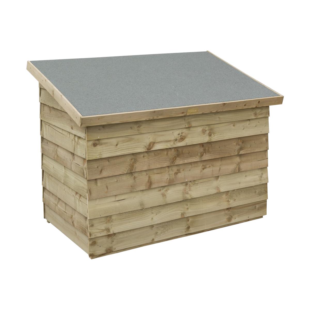 Dimensions H92cm x W120cm x D72cm. The Overlap Patio Chest is the perfect storage solution for all your garden needs the storage box is pressure treated against rot with a lifting lid and lid stay. Please note We are unable to deliver to Ireland. Features. 8mm overlap cladding. Lifting lid with lid stay. Solid board floor and roof. Pressure treated against rot. Natural timber finish. Mineral roofing felt. Assembly required. View Assembly Instructions »..