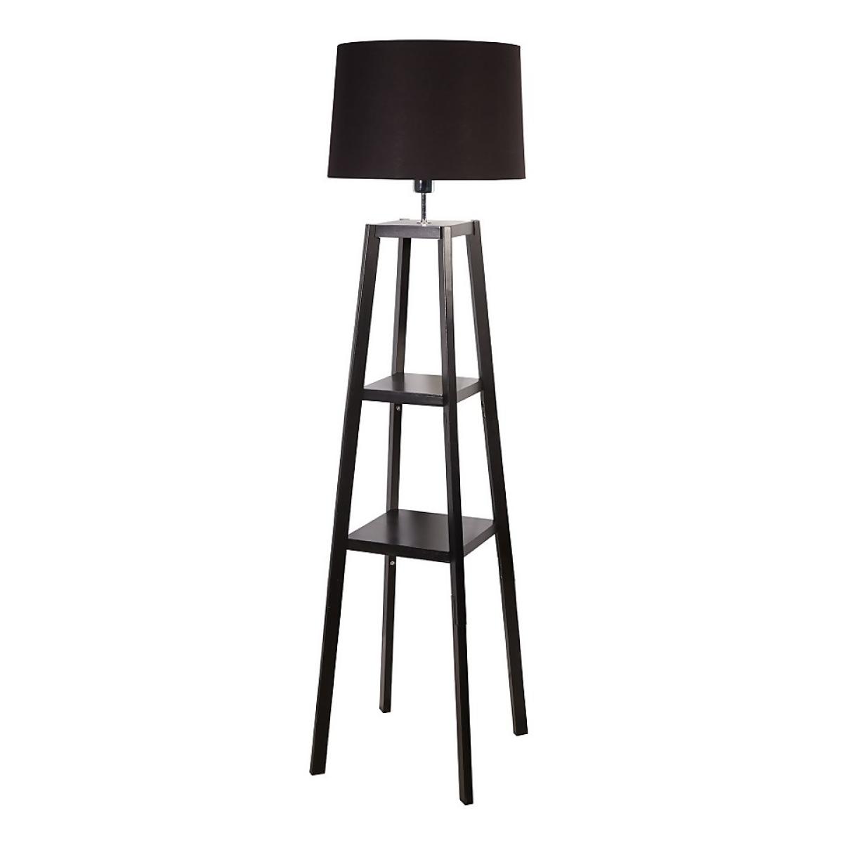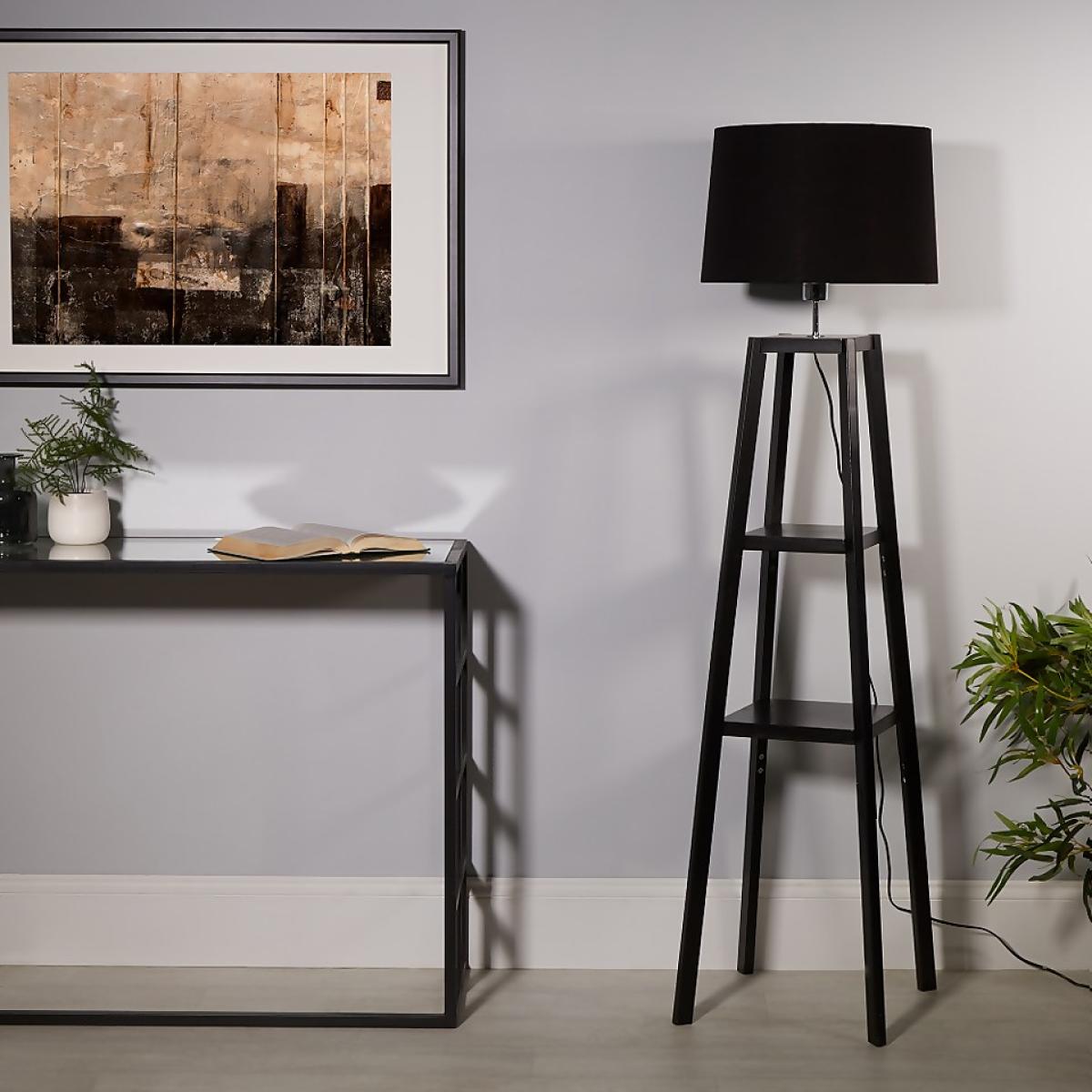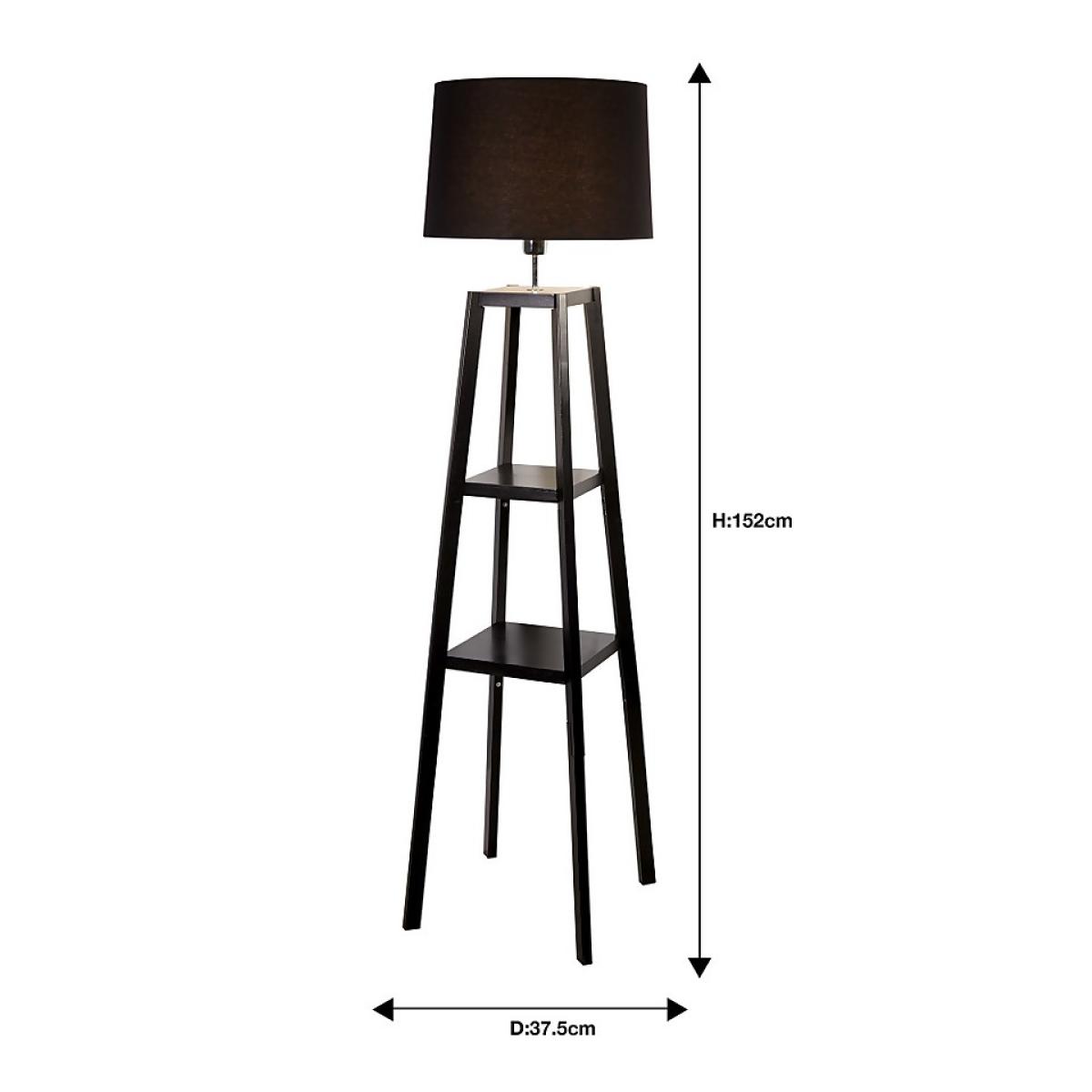 Fusing functionality and style, this floor lamp will add a warm glow to any room, whilst also showcasing a place to display decorative items or plants (not included). The 4 legged base has 2 shelves for display, and is topped with a contrast black fabric drum shade, creating a stylish floor lamp, ideal for any living space or entrance way.