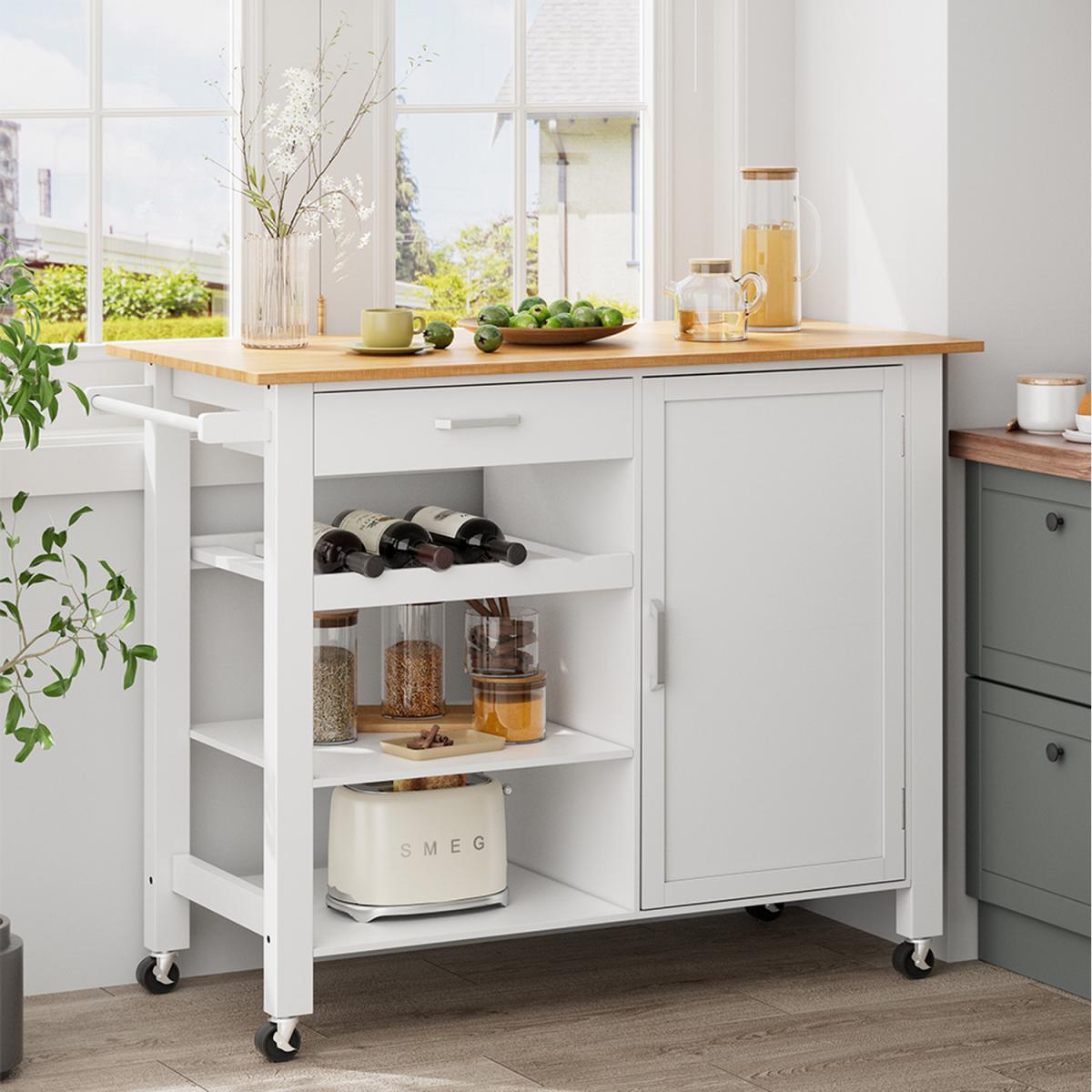 Wooden Rolling Kitchen Trolley with Drawer and Cabinet - White