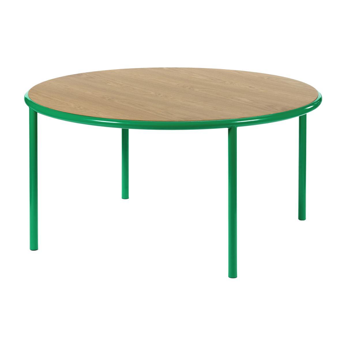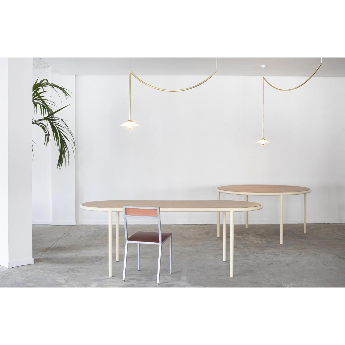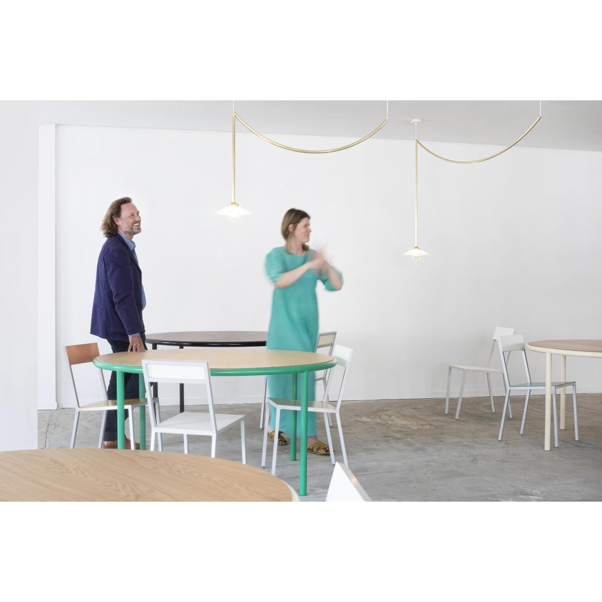 The Wooden table collection is a nod to the 90s refectory tables still found in schools. These tables display a mixture of joyful intensity and remarkable sobriety. The table’s frame and legs are made of steel tubes with soft, rounded profiles. The wooden top is milled to fit perfectly into the frame, creating a subtle interplay between solid steel and warm wood. Like all Muller Van Severen's creations, Wooden tables combine rigorous lines with bright, daring colours. Different moods can be created with the choice of different colours (red, green, creamy white and black), shapes (oval, circle, rectangular) and types of wood (oak, walnut, birch). Known as Muller Van Severen, the Flemish design duo Fien Muller and Hannes Van Severen work at the intersection of art and design. They are among the most prominent creators of the moment. From galleries to museums, not to mention collectors, design enthusiasts and design houses, everyone loves their minimalist, colourful furniture, timeless and joyful. In less than a decade, Muller Van Severen has become a key player in design, to the point of winning numerous awards and increasing collaborations with prestigious museums (Pompidou Centre, Vitra museum, etc. ). They created the Wooden table series to celebrate the 5th anniversary of Belgian label Valérie Objects with whom they collaborate closely.