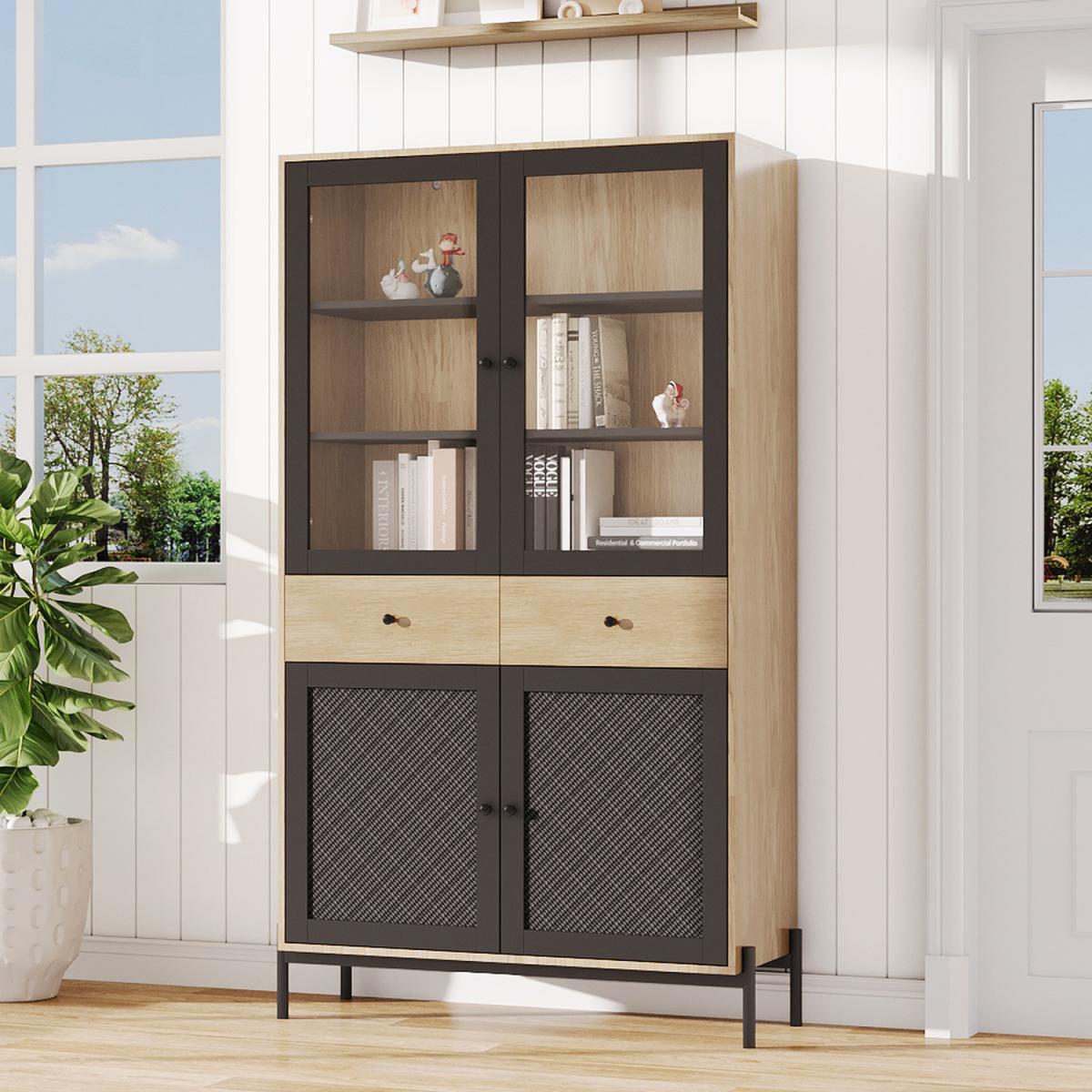 Enhance your layout with this unique sideboard. It provides versatile storage, including a three-tier transparent cabinet perfect for showcasing collections, sculptures, and glassware. With two drawers and a cabinet featuring a woven straw door, your essentials are always within reach. Tall and spacious, this sideboard is a striking addition to your living area.