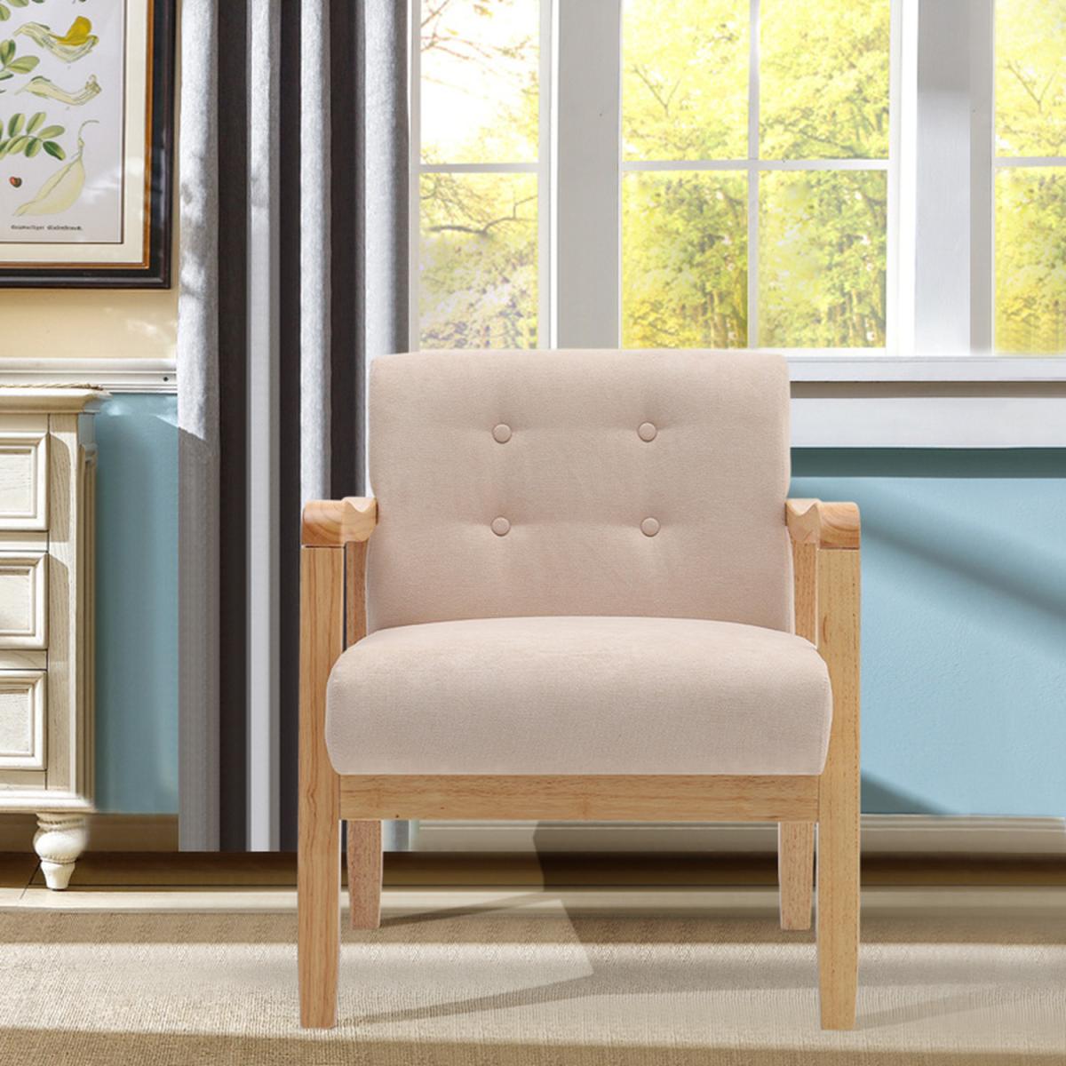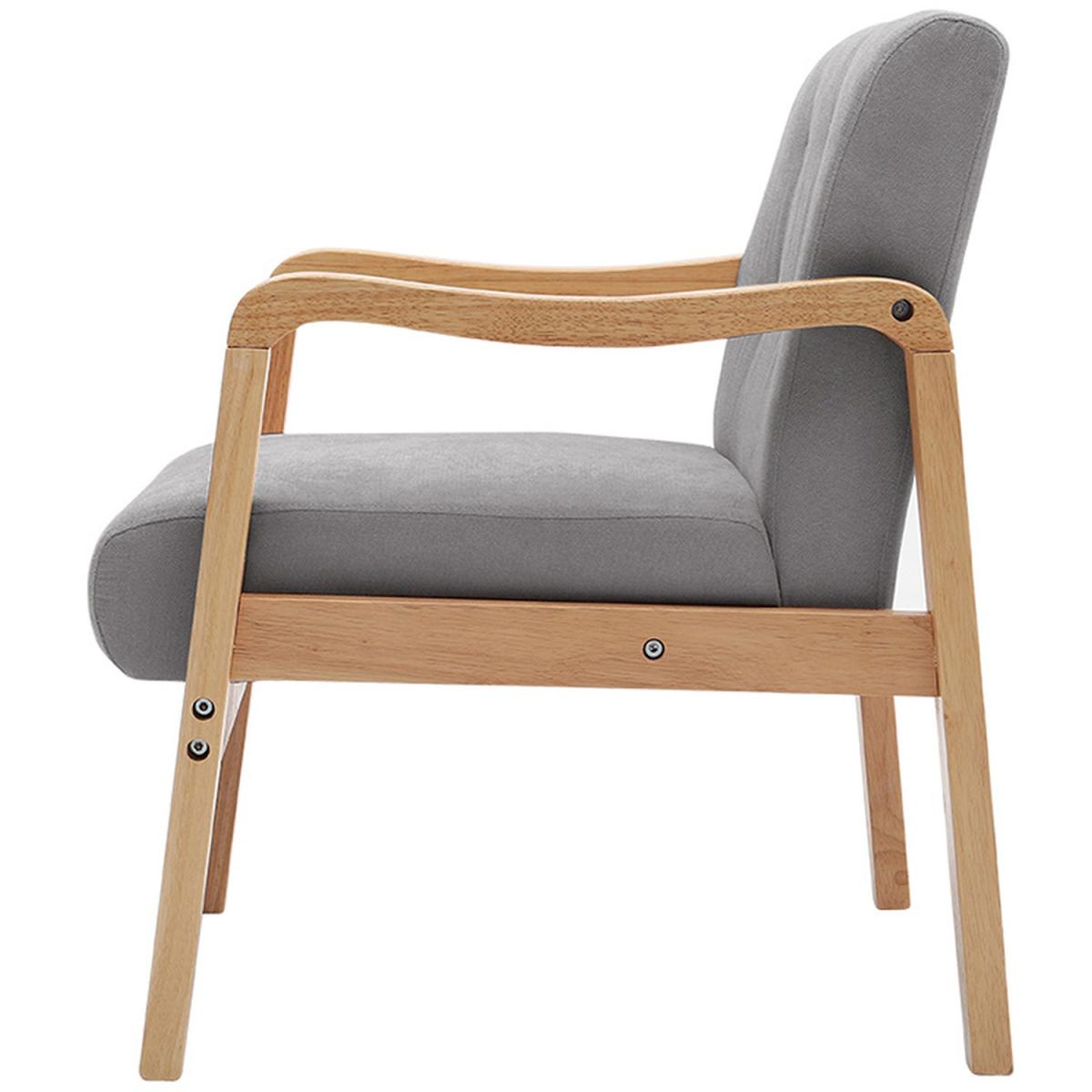 Constructed by a solid wood frame, the armchair is stable and durable, padded by thick sponge and breathable grey linen, comfortable enough. It features a unique open-framed arm design, complete with wooden accent bolt covers for an authentic retro finish. With a perfect lying angle, the lounge chair makes the backrest fit your back perfectly. Featuring spacious seats, this accent chair allows you to lean your back in it and enjoy your leisure time comfortably. This elegant leisure chair is ideal for resting, watching TV and reading, also perfectly serves as a guest chair.