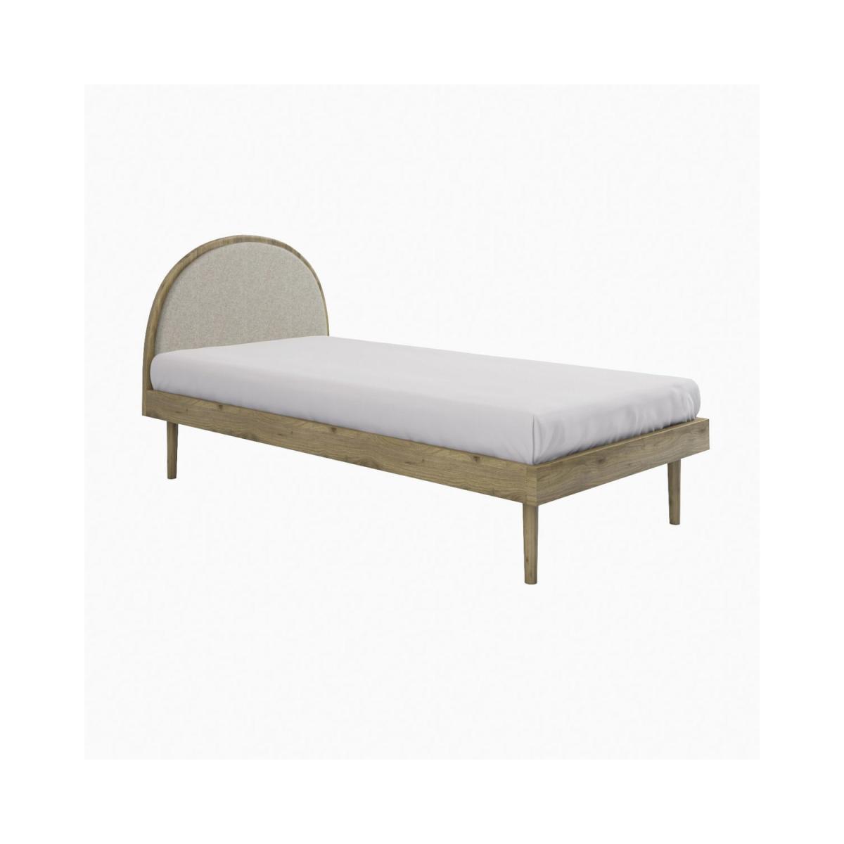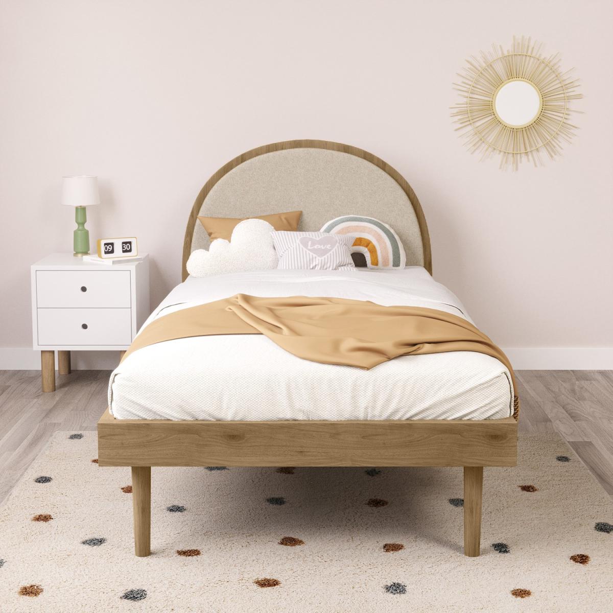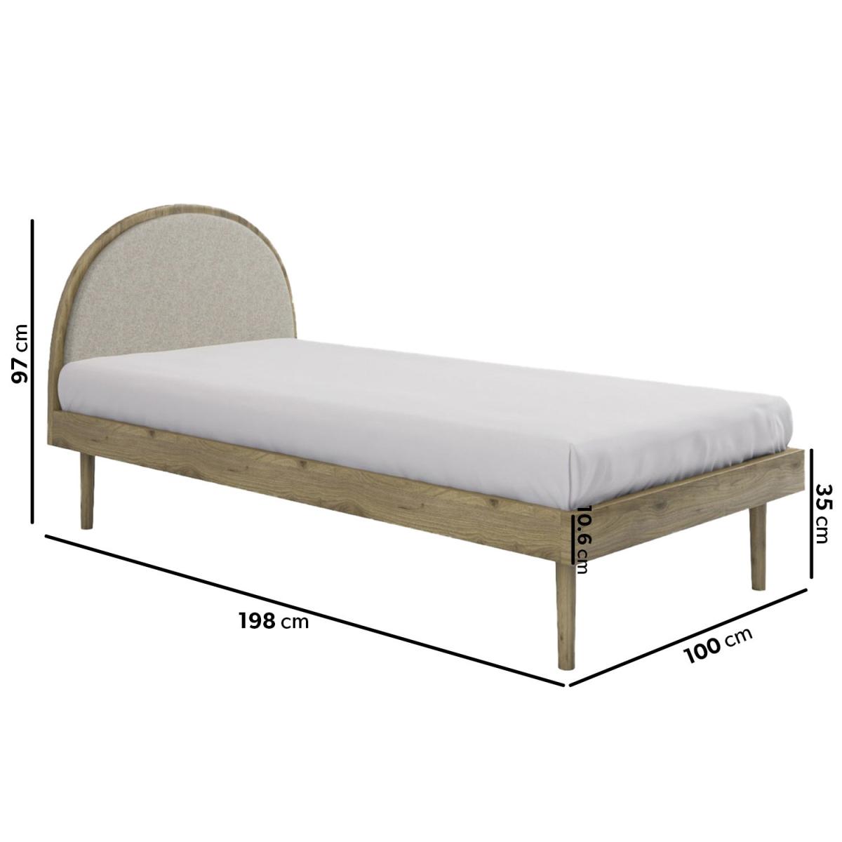 All about me The Cara bed is perfect for any kids' bedroom. With a stunning mango wood finish, the simple design effortlessly complements any modern or retro interior. The sturdy tapered legs are crafted from solid wood. Choose your perfect mattress from our popular package deals. Need to know Dimensions:W100 x D198 x H97 cm Weight: 34.47 kg Mattress size: Standard UK single (90 x 190 cm/3ft) Mattress included: No Max supported weight: 122 kg Colour: Beige and wood Finish: Upholstered and premium woodgrain foil base and headboard Material: Linen fabric, MDF and solid mango wood Assembly required: Yes Packaging dimensions (2 boxes):W206 x D31 x H14.5 cm, W116 x D81 x H8 cm