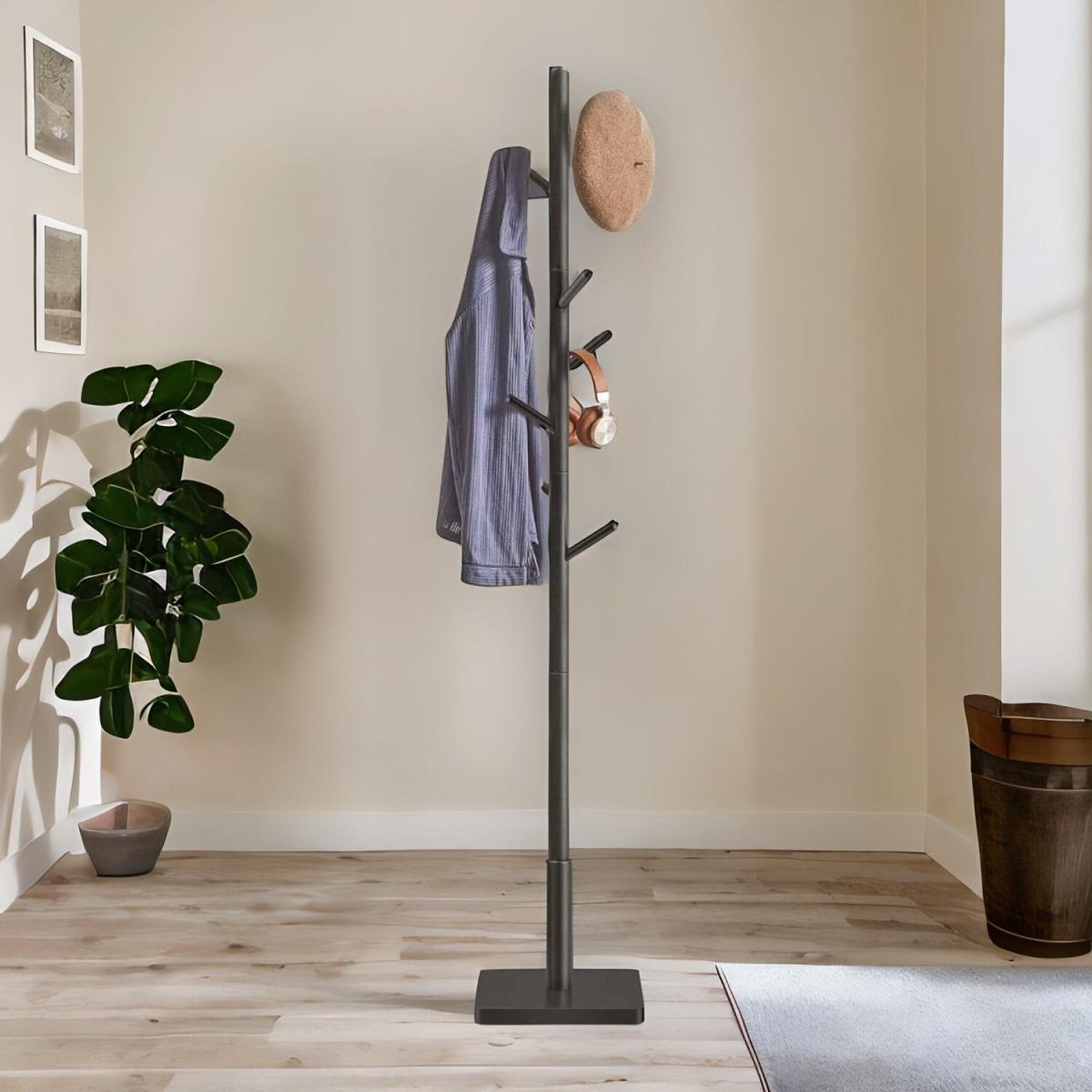 This coat rack is designed for easy assembly with built-in threaded parts that require no extra tools. Simply follow the clear instructions and twist the hooks into place to set it up quickly and hassle-free. Crafted from robust rubberwood and finished with a triple-layer paint coating, this freestanding coat tree boasts enduring quality. Its smooth surface ensures clothes remain unharmed while hanging. Featuring three adjustable height options, this coat rack caters to various user needs and preferences. It adapts effortlessly to accommodate every member of the family, enhancing usability and convenience. With a robust 4 cm diameter main pole securely attached to its branches and supported by a stable square base, this coat rack stands steady. It confidently holds up to 24 kg in total, with each hook supporting up to 3 kg. Its sleek and minimalist design allows this clothes stand to seamlessly blend into any environment. Beyond its functionality, it adds a touch of elegance to your hallway, bedroom, office, or reception room, enhancing the overall aesthetic appeal.