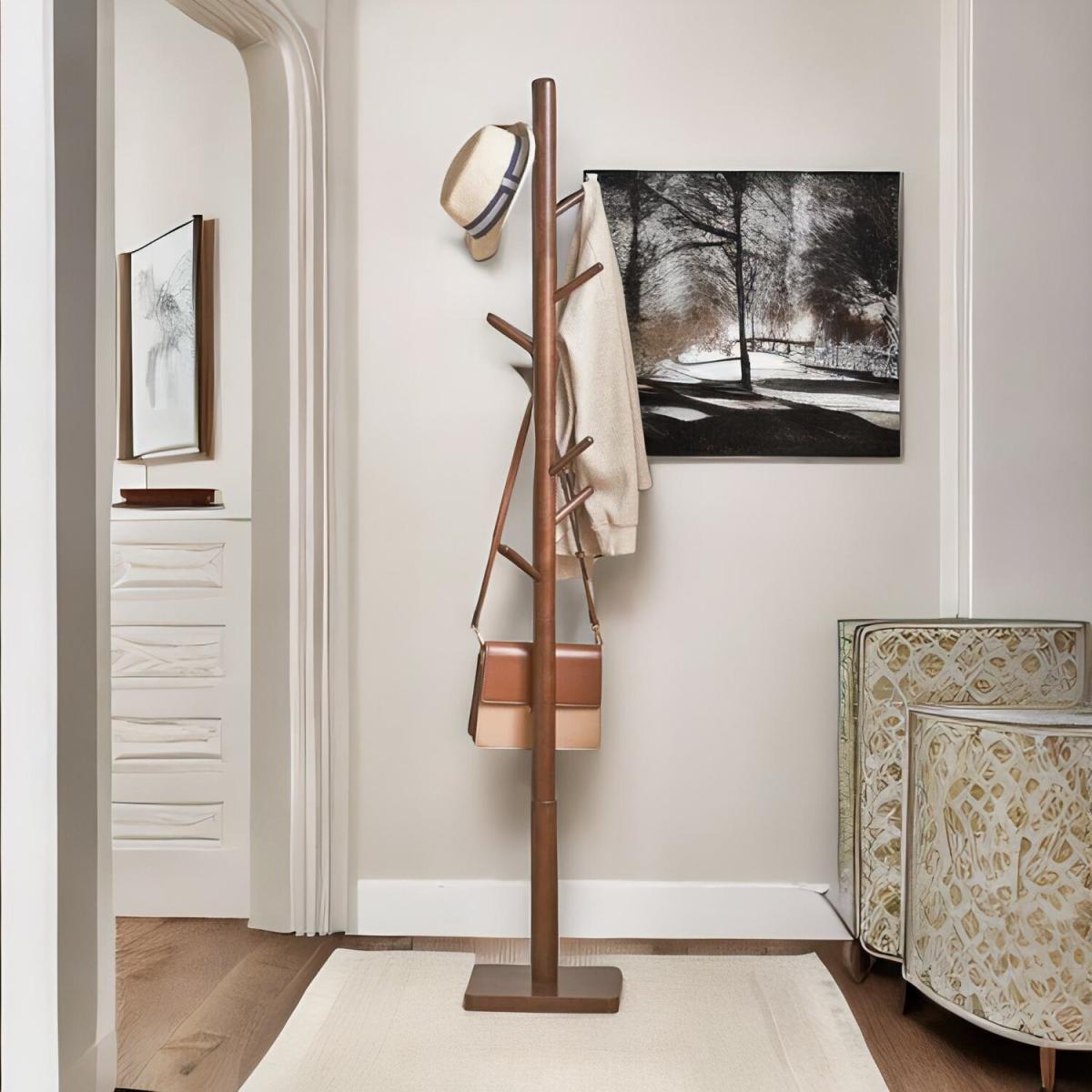 This coat rack is designed for easy assembly with built-in threaded parts that require no extra tools. Simply follow the clear instructions and twist the hooks into place to set it up quickly and hassle-free. Crafted from robust rubberwood and finished with a triple-layer paint coating, this freestanding coat tree boasts enduring quality. Its smooth surface ensures clothes remain unharmed while hanging. Featuring three adjustable height options, this coat rack caters to various user needs and preferences. It adapts effortlessly to accommodate every member of the family, enhancing usability and convenience. With a robust 4 cm diameter main pole securely attached to its branches and supported by a stable square base, this coat rack stands steady. It confidently holds up to 24 kg in total, with each hook supporting up to 3 kg. Its sleek and minimalist design allows this clothes stand to seamlessly blend into any environment. Beyond its functionality, it adds a touch of elegance to your hallway, bedroom, office, or reception room, enhancing the overall aesthetic appeal.