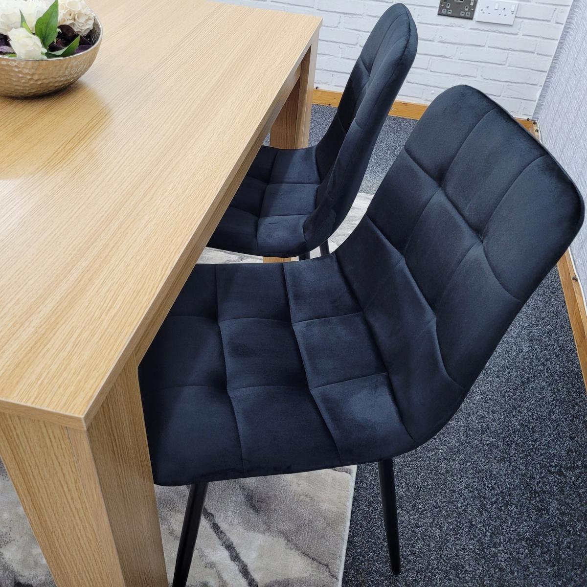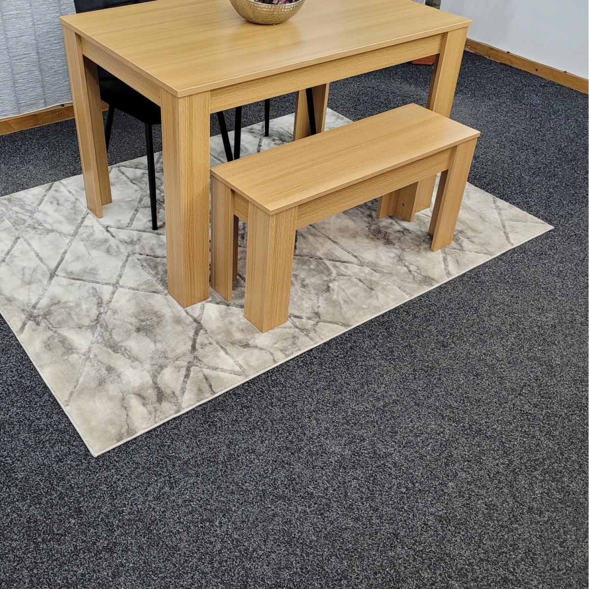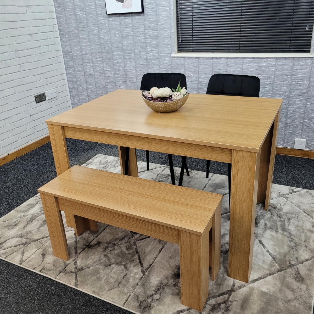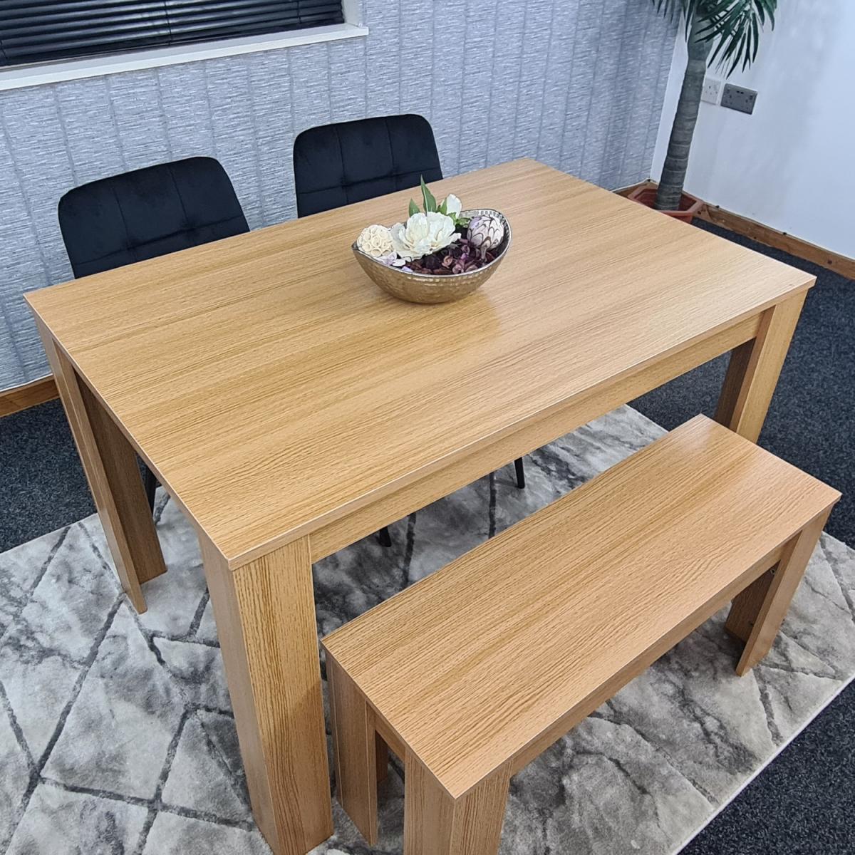 A Stunning wooden oak effect Dining Table set with 2 grey tufted velvet chairs and 1 bench. The table is made from wood and has a melamine laminated light oak effect, transforming your dining room and looks so spectacular and unique. The high-quality velvet chairs give a premium look and ultra-smooth feel. A slightly curved shape is more comfortable to sit on, and with lots of padding. Armless design to give a chic look and bring modern elegance to your home dining room. Flat packed, some home assembly required, All our chairs meet fire resistance standards fast delivery to all UK. All fittings and tools are included.