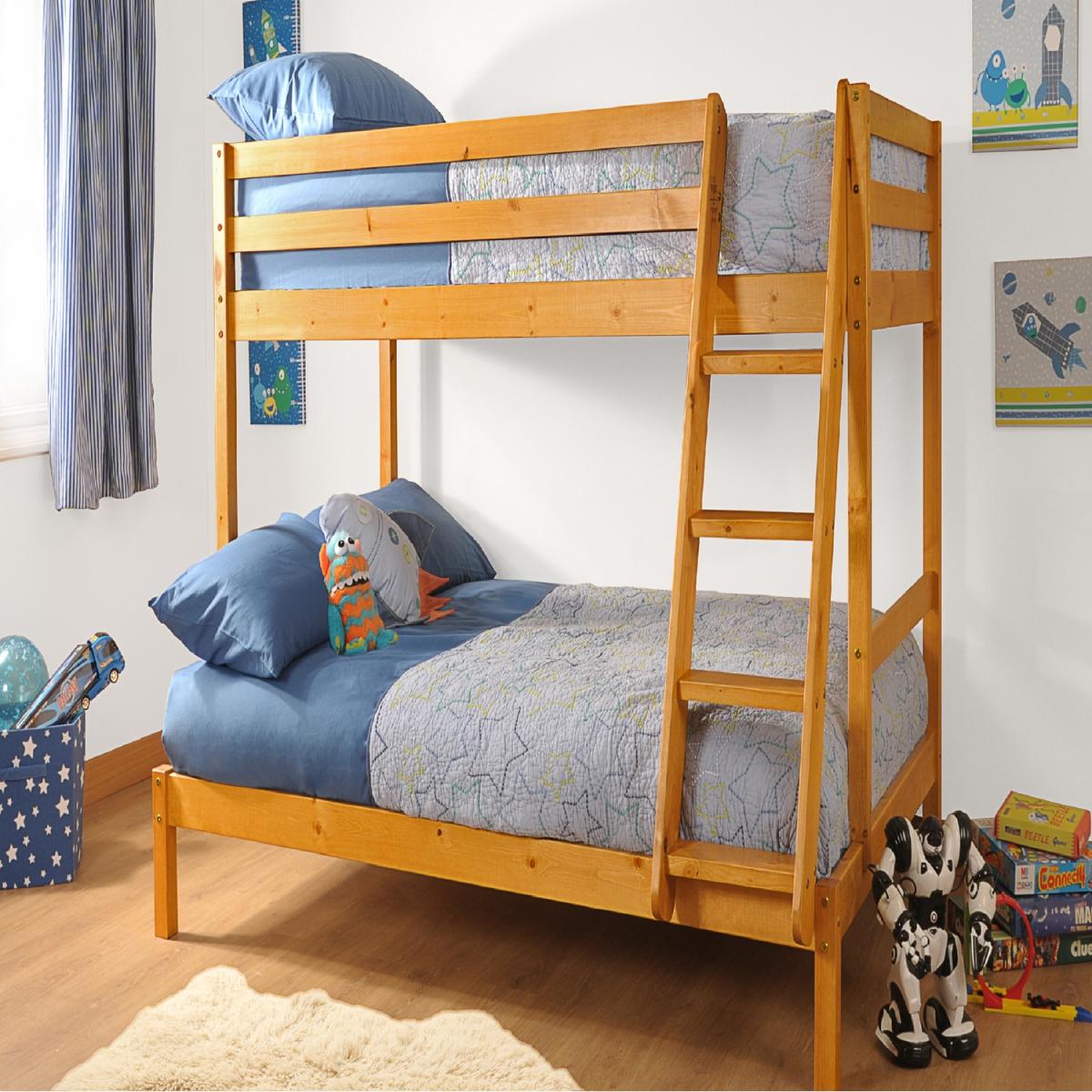 I’m a fan of this caramel-stained triple bunk because its clean lines and warm timber tone slot neatly into both Scandi-inspired and more eclectic playroom schemes. The solid pine frame feels sturdy enough for daily use, while its compact footprint makes it ideal for smaller bedrooms. To style it practically, layer simple cotton bedding in muted pastels or primary brights for a pop of colour that’s easy to swap as tastes change. Anchor the bed with a soft, patterned rug and tuck storage baskets or canvas boxes underneath the base bunk to keep toys or spare bedding out of sight. If you’re working with neutral walls, try a single accent wall in chalk-paint grey or sage green behind the bunk to add depth without overwhelming the room. A small wall-mounted shelf or floating desk at the foot of the ladder transforms the space into a tidy study-and-sleep zone.
