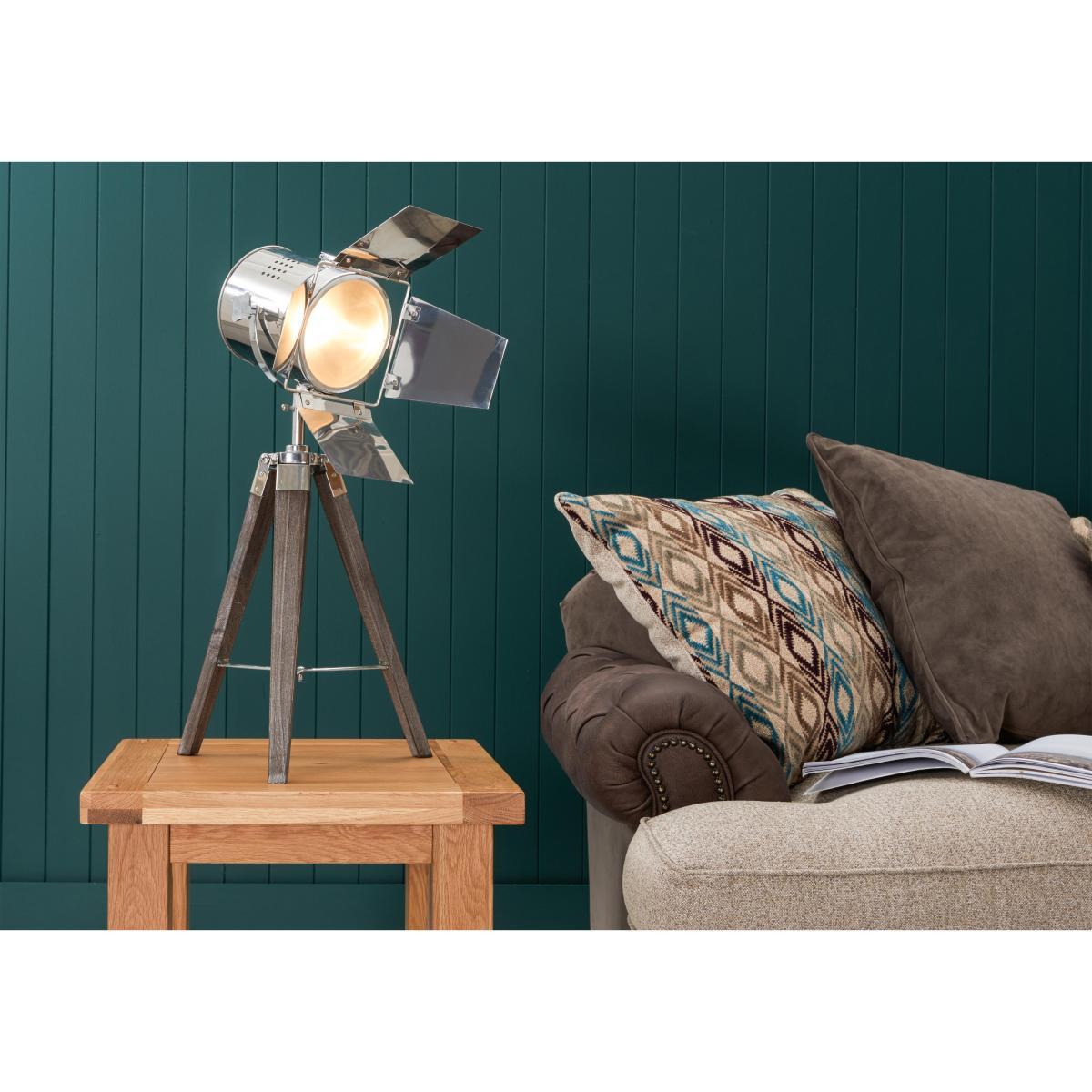 Lights, camera, action. If you are a bit of a film buff, youll love this witty table lamp, with moveable shutters, inspired by iconic film set lighting. Add some studio style to your home and direct it to wherever the action is. Complements the Wooden Tripod Film Floor Lamp. Dramatically- proportioned table lamp Inspired by iconic film set lighting Chrome- effect spot lamp is fully directional Authentic movable shutters allow for more or less light Sturdy wooden tripod base For movie goers and lovers of stylish accessories Dimensions Width: 39cm (15 inches) Depth: 39cm (15 inches) Height: 78cm (31 inches)