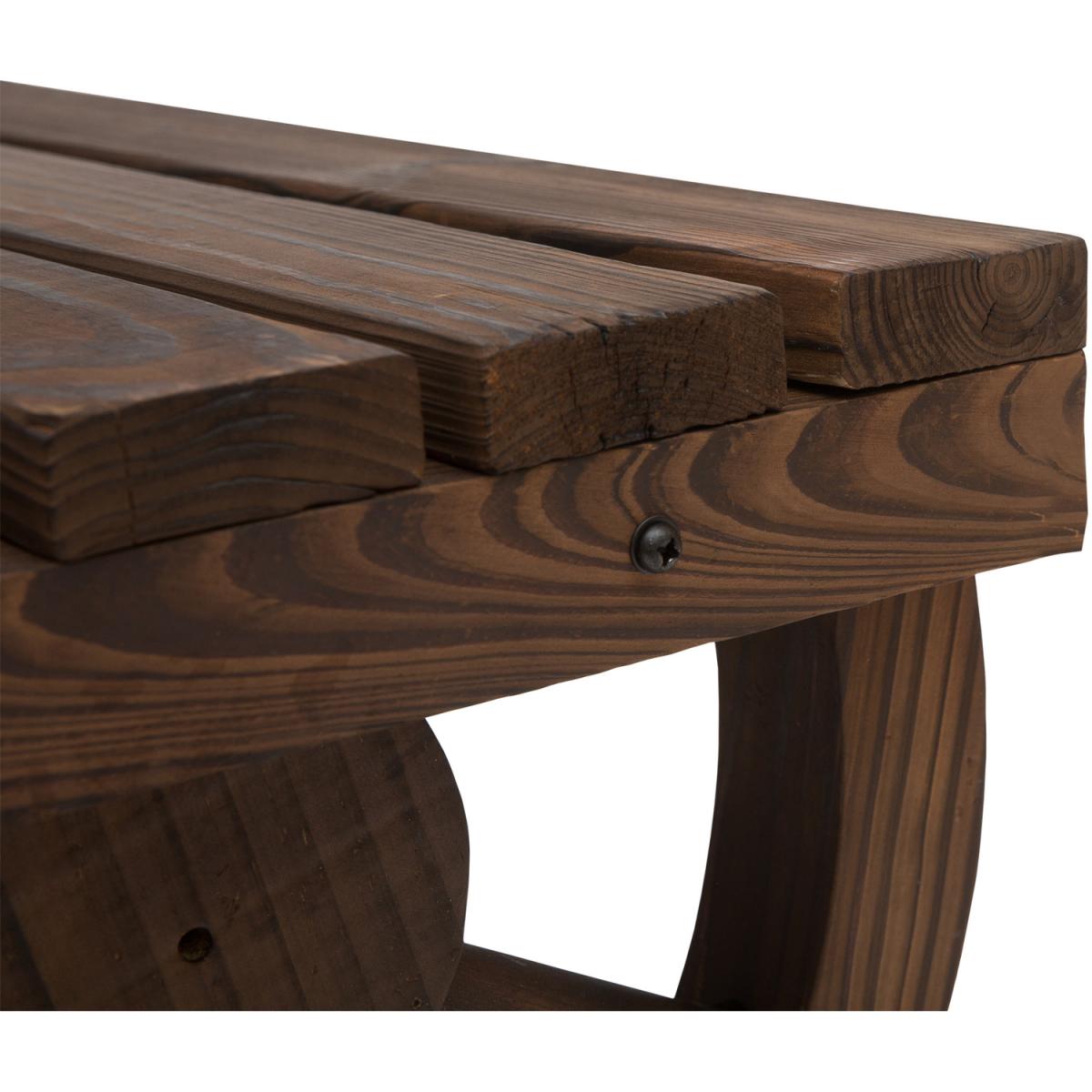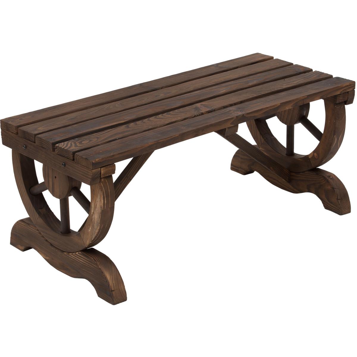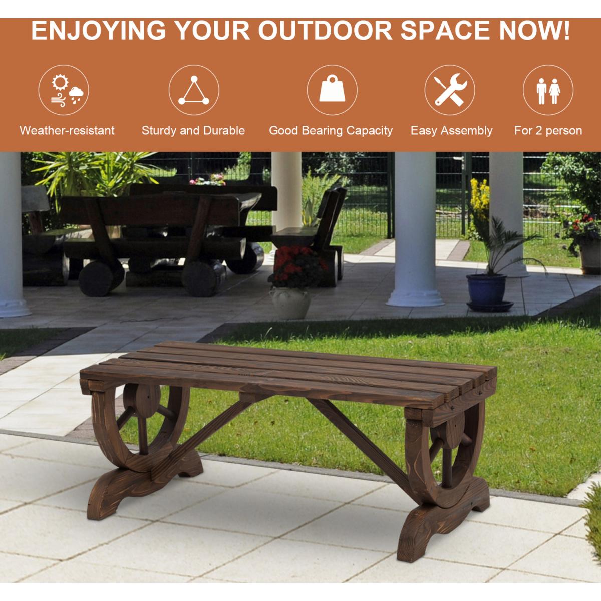 Bring this rustic-looking bench from Outsunny into your outdoors for a beautiful and charming focal point. Made from high-quality fir wood, this piece is solid and sturdy, comfortably seating two people with enough room to relax. Slatted all over to prevent water and liquid build it, it has a carbonized finish all over which helps protect it from weathering. A wagon wheel on each end for a unique focal point.