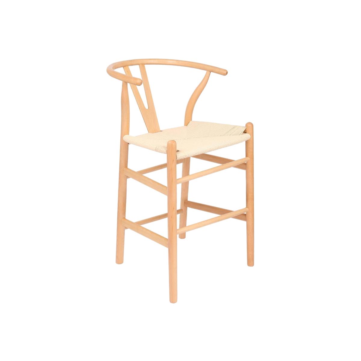 Add timeless Scandinavian elegance to your kitchen or bar with the Nicholas Winter Wooden Wishbone Bar Stool. Featuring a sculpted beechwood frame, iconic Y backrest, and hand-woven rope seat, it brings refined comfort and rustic charm to any space.