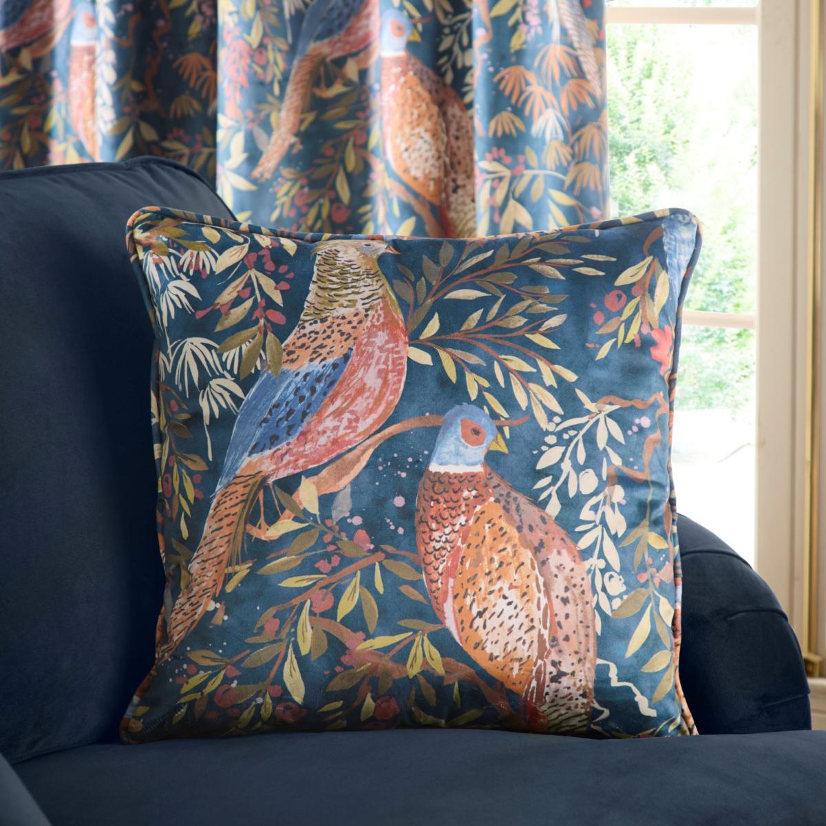 * Luxurious woodland pheasant print* Piped edge* Coordinating curtains available to purchase separately* Available in 2 colourways Bring nature and the woodland into your home with this timeless design. Printed on a stunning velour fabric which will add a touch of luxury to any room setting, this cushion is made from recycled polyester. Good things come to those who coordinate, so why not pair this cushion with the matching curtains available to purchase separately?