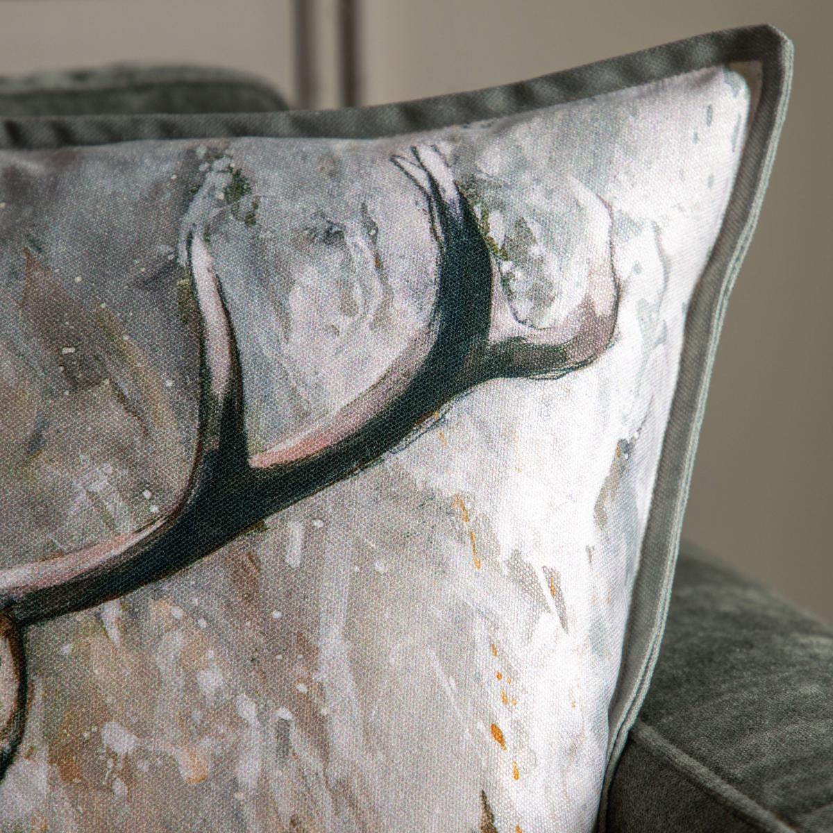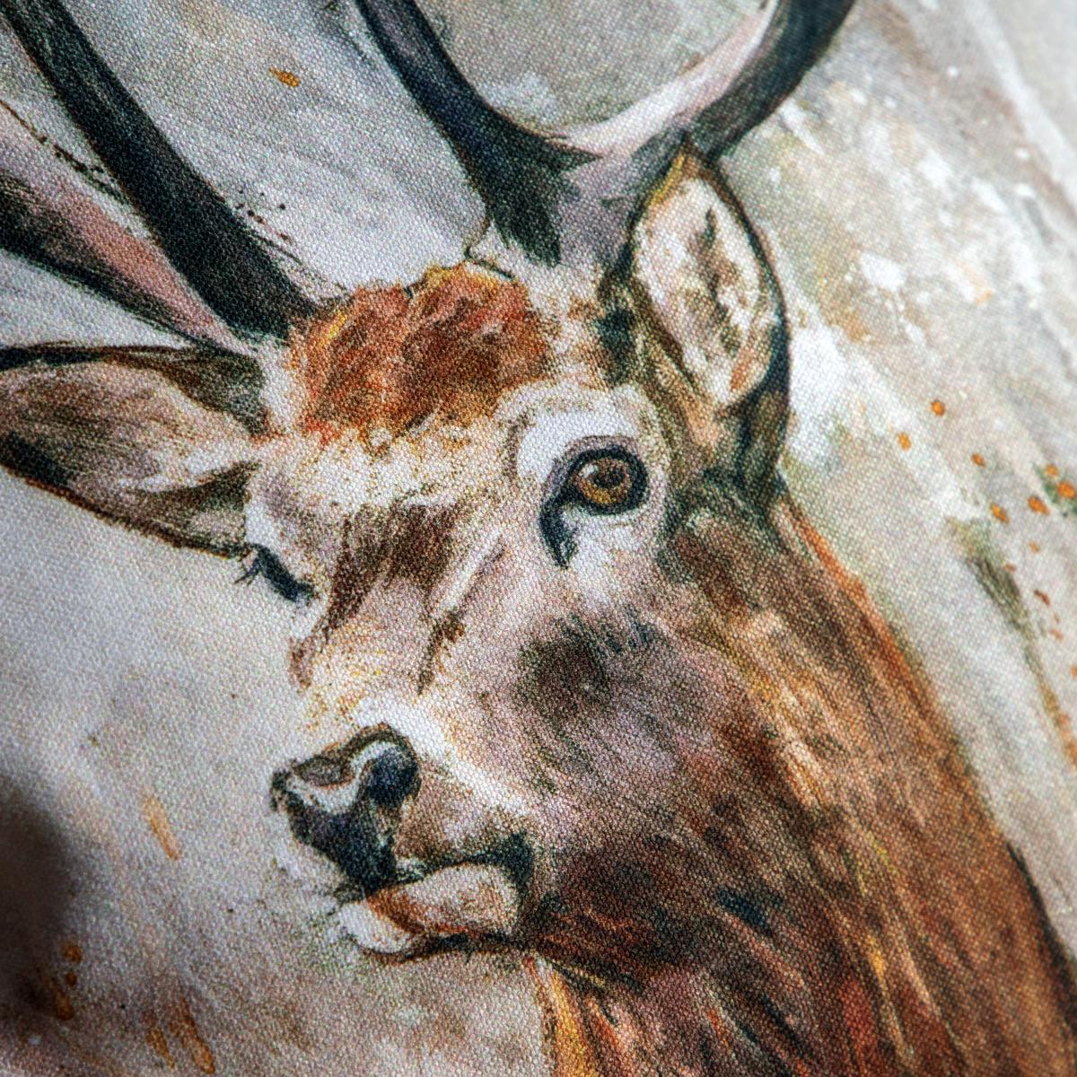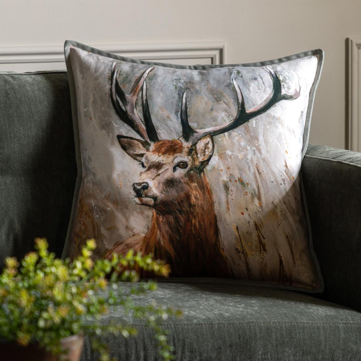 Beautiful cushion with elegant mini flange edge, completed with a watercolour stag design. Gives a country aesthetic to a living space. Beautiful cushion with elegant mini flange edge, completed with a watercolour stag design. Gives a country aesthetic to a living space.