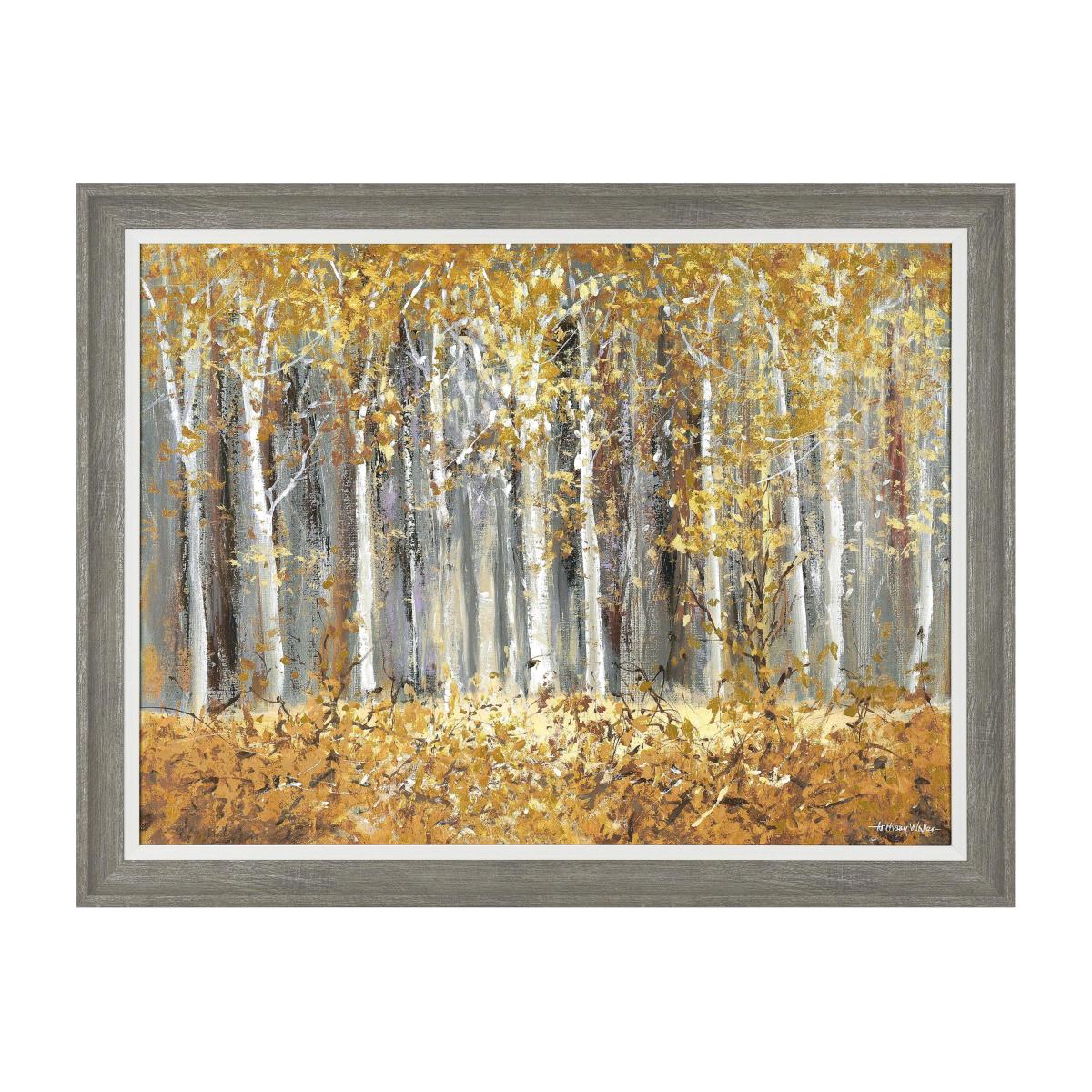 This luminous piece of framed art celebrates the natural beauty of autumn trees in a timeless impressionistic painterly style. Why you'll love it. Our Woodland Warmth framed art is a celebration of autumnal colour and form. Delightful impressionistic style. Depicts golden leaves cascading from the branches of slender silver birch trees. Modern metal- and wood-effect frame. By artist Anthony Waller. This piece of framed art is part of the Furniture Village home accessories collection. What you need to know. Image is reproduced on canvas. For indoor use only. Dimensions. Height: 70 cm (28 in). Width: 90 cm (36 in).