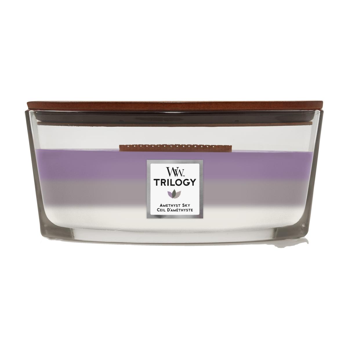 * Amethyst Sky Scented Candle* Ellipse design* Woodwick brand* 50 hours burn time* Includes wood style lid* Patented wooden wick creates a crackling sound Uplift your senses with Woodwick’s Amethyst Sky Scented Candle. The Ellipse candle features a natural wooden wick that fill your space with up to 50 hours of delightful aromas, featuring top layers of amethyst and amber, mid layers of suede and sandalwood and sit upon a base layer of smoked jasmine for a delightful concoction of fragrances. Creating a multi-sensory experience that adds a personal and elegant finish to your home is part of Woodwick’s design and their exclusive and patented Pluswick innovation creates the sound of crackling fire when burning. Once you’ve come to the end of your candle experience and it’s empty, why not give it a new lease of life by cleaning the empty jar and upcycling it for effective storage full of style and practicality?**Follow these simple steps for the best way to care for and enjoy your experience every time:**1. You will experience the best burn results when the candle remains lit for 3-4 hours. Make sure that the wax melts to the edge of the candle before extinguishing it. Allowing the wax to pool will discourage 'tunnelling' or leaving wax on the sides of the vessel.2. Keep the candle within sight and away from drafts. Always place the candle on a flat, heat-resistant surface, and make sure to keep the candles away from children, pets, flammable materials and other heat sources. Never move or handle the candle while it's burning or while the wax is hot.3. When there is approximately 1cm of wax remaining, it is time to stop using your candle. Extinguish the candle when 1cm or wax remains and recycle it according to your local recycling centre's guidance.