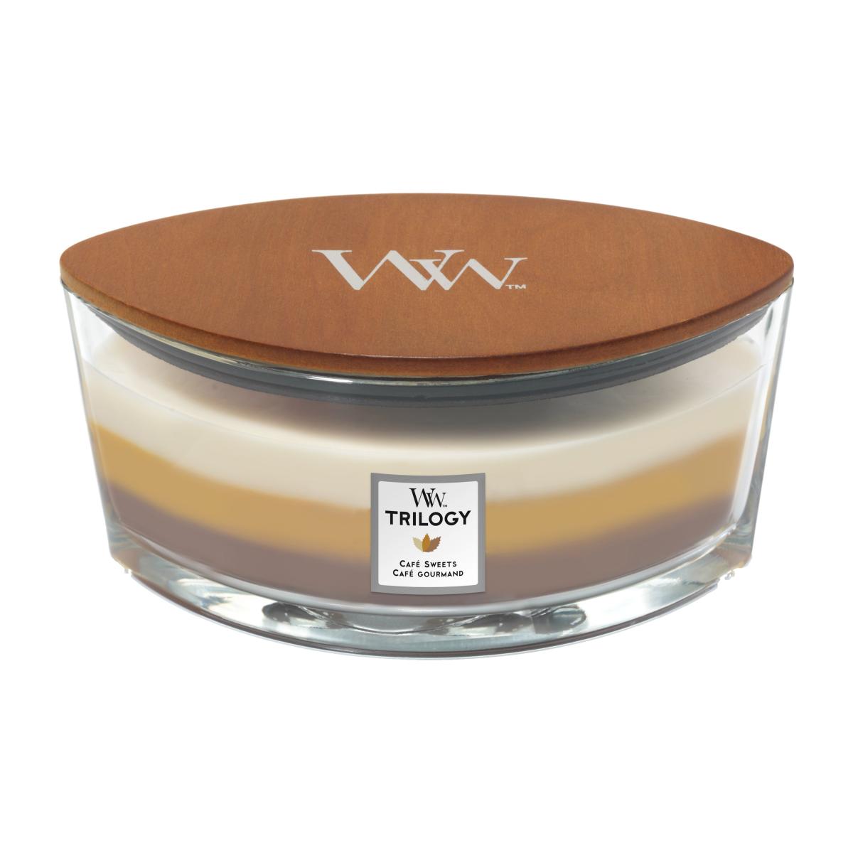 * Café Sweets Scented Candle* Ellipse trilogy design* Woodwick brand* 50 hours burn time* Includes wood style lid* Patented wooden wick creates a crackling sound Inhale the sweet aroma of a cafe sweets selection in the comfort of your home with Woodwick’s Scented Candle bringing a medley of smells to your space and creating a unique ambiance as the fragranced layers melt together. The Ellipse Trilogy candles feature natural wooden wicks that fill your space with up to 50 hours of delightful aromas, featuring top layers of vanilla bean, mid layers of caramel and sitting upon a base layer of biscotti for a concoction of delicious fragrances. Creating a multi-sensory experience that adds a personal and elegant finish to your home is part of Woodwick’s design and their exclusive and patented Pluswick innovation creates the sound of crackling fire when burning. Once you’ve come to the end of your candle experience and it’s empty, why not give it a new lease of life by cleaning the empty jar and upcycling it for effective storage full of style and practicality?**Follow these simple steps for the best way to care for and enjoy your experience every time:**1. You will experience the best burn results when the candle remains lit for 3-4 hours. Make sure that the wax melts to the edge of the candle before extinguishing it. Allowing the wax to pool will discourage 'tunnelling' or leaving wax on the sides of the vessel.2. Keep the candle within sight and away from drafts. Always place the candle on a flat, heat-resistant surface, and make sure to keep the candles away from children, pets, flammable materials and other heat sources. Never move or handle the candle while it's burning or while the wax is hot.3. When there is approximately 1cm of wax remaining, it is time to stop using your candle. Extinguish the candle when 1cm or wax remains and recycle it according to your local recycling centre's guidance.