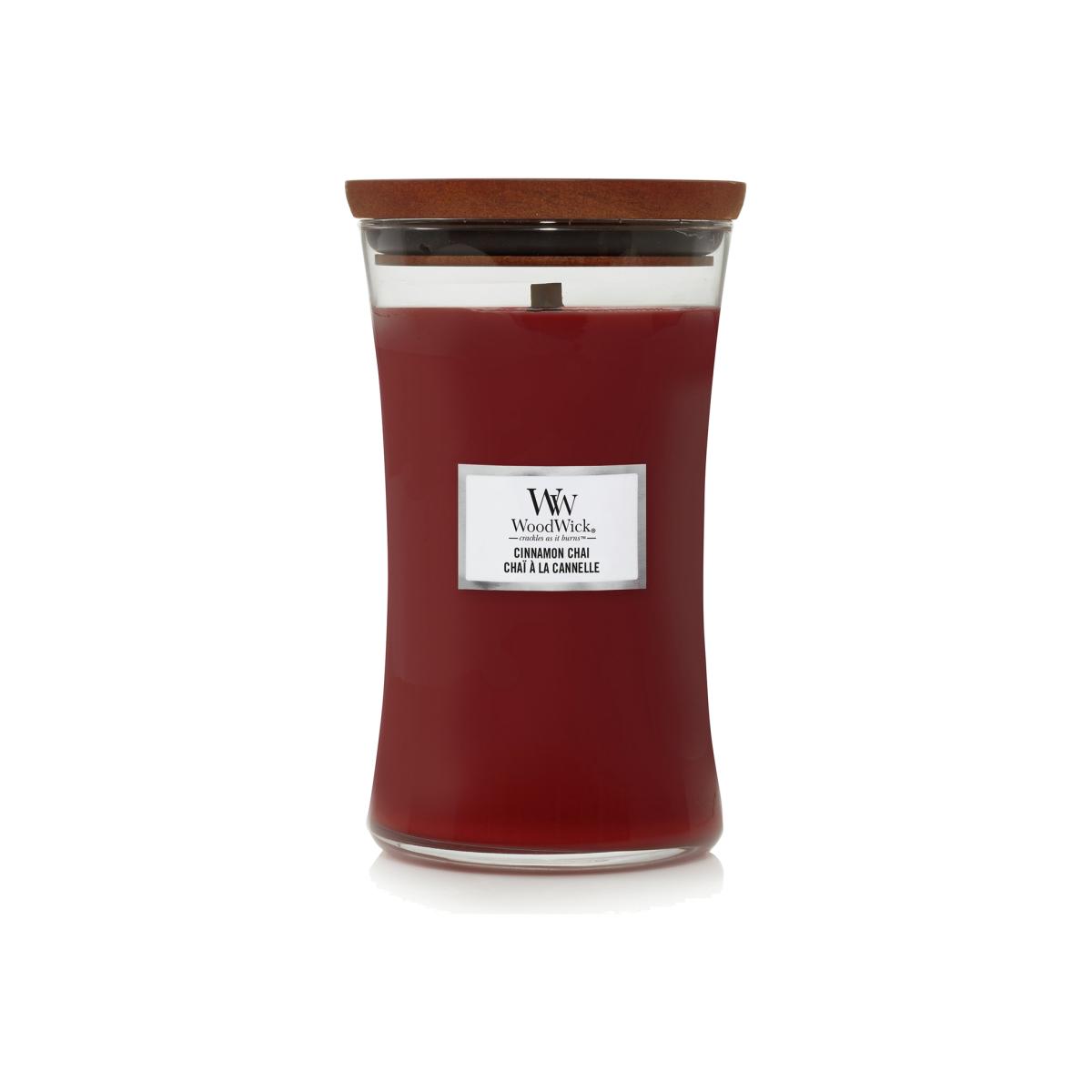 Large hourglass Woodwick candles fill your home with sophisticated scents and a soft crackle from a natural wooden wick that crackles as it burns. The distinctive crackle of woodwick candles is creaed by a patented pluswick innovation technology, designed to ensure a safe and consistent multi-sensory experience with faster fragrance and an optimal burn while fragrancing your home with the sound of a crackling fragrancing your home with the sound of a crackling fire. Relish the warm, intoxicating aroma of spicy cinnamon and rich vanilla notes. Cinnamon Chai scent. Soy wax.