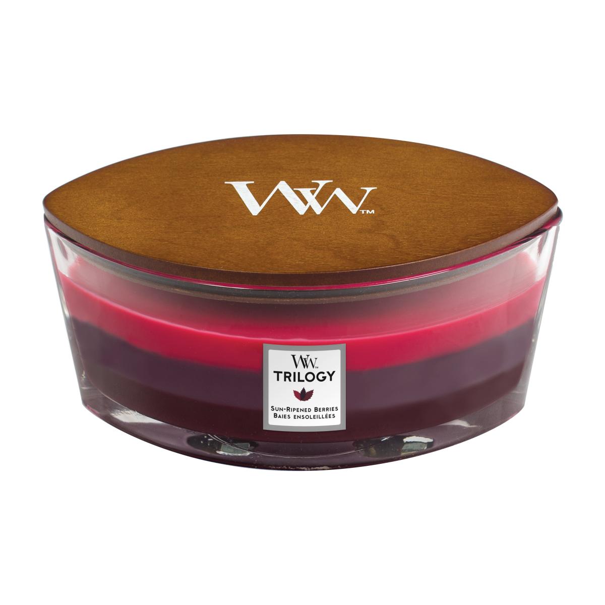 * Sun Ripened Berries Scented Candle* Ellipse design* Woodwick brand* 50 hours burn time* Includes wood style lid* Patented wooden wick creates a crackling sound Bring a burst of fruity sweetness to your space with Woodwick’s Sun Ripened Berries Scented Candle. The Ellipse candles feature natural wooden wicks that fill your space with up to 50 hours of delightful notes, featuring top layers of currant, mid layers of spiced blackberry and sit upon a base of black cherry. Creating a multi-sensory experience that adds a personal and elegant finish to your home is part of Woodwick’s design and their exclusive and patented Pluswick innovation creates the sound of crackling fire when burning. Once you’ve come to the end of your candle experience and it’s empty, why not give it a new lease of life by cleaning the empty jar and upcycling it for effective storage full of style and practicality?**Follow these simple steps for the best way to care for and enjoy your experience every time:**1. You will experience the best burn results when the candle remains lit for 3-4 hours. Make sure that the wax melts to the edge of the candle before extinguishing it. Allowing the wax to pool will discourage 'tunnelling' or leaving wax on the sides of the vessel.2. Keep the candle within sight and away from drafts. Always place the candle on a flat, heat-resistant surface, and make sure to keep the candles away from children, pets, flammable materials and other heat sources. Never move or handle the candle while it's burning or while the wax is hot.3. When there is approximately 1cm of wax remaining, it is time to stop using your candle. Extinguish the candle when 1cm or wax remains and recycle it according to your local recycling centre's guidance.