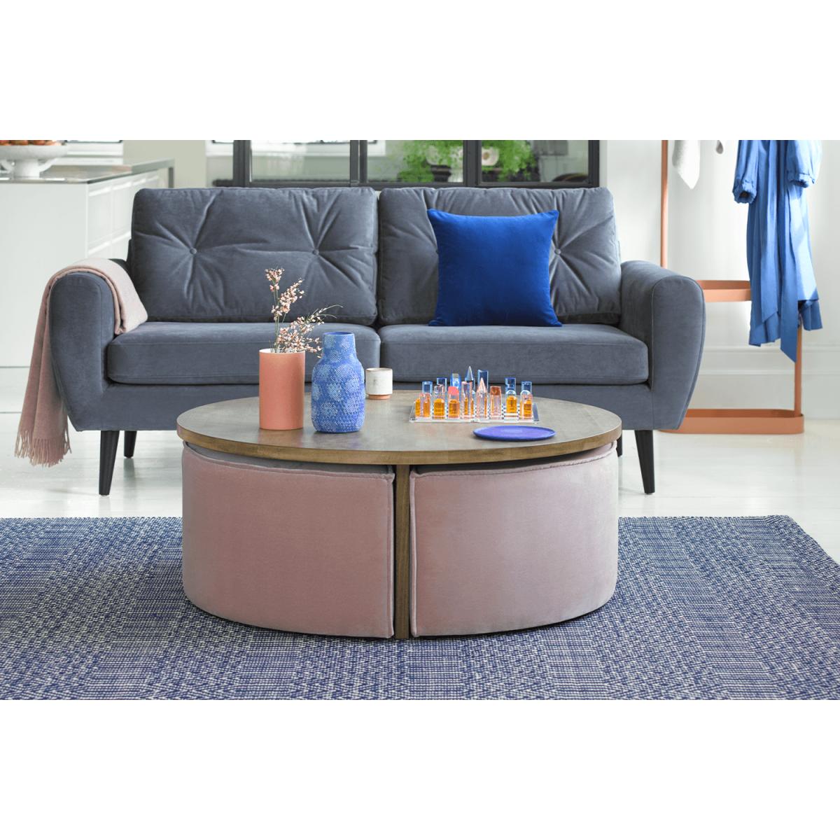 I love this set because it combines practical versatility with tactile appeal. The coffee table's round wooden top brings warmth and natural texture, ideal for both modern and eclectic interiors. The nesting stools in raven speckled chenille add an unexpected softness, making them perfect for casual seating or stacking when extra surface space is needed. It works particularly well in relaxed, contemporary spaces-think lounge areas, family rooms, or even a snug corner of a bedroom. For styling tips, consider pairing with textured cushions or a mix of organic and industrial elements to create a layered look. When not in use, nest the stools underneath the table to save space, or scatter them around as flexible seating options to keep the vibe informal and functional.