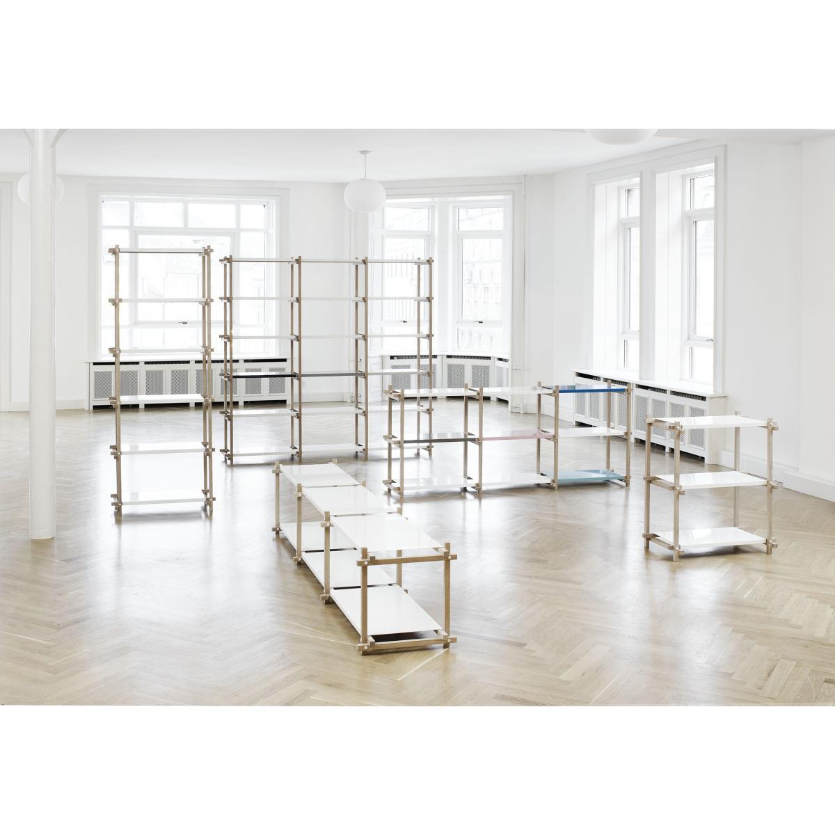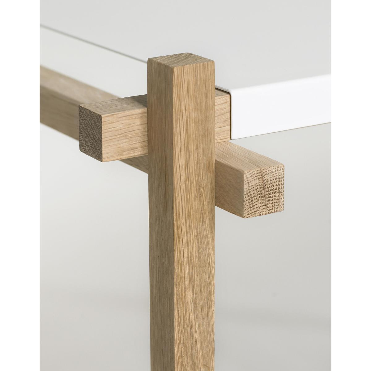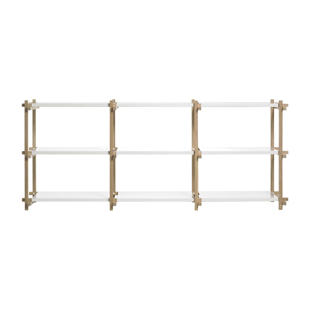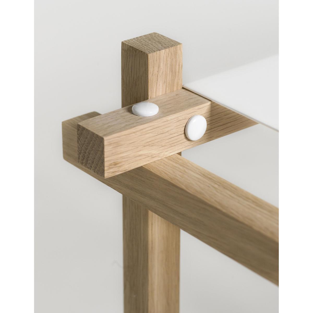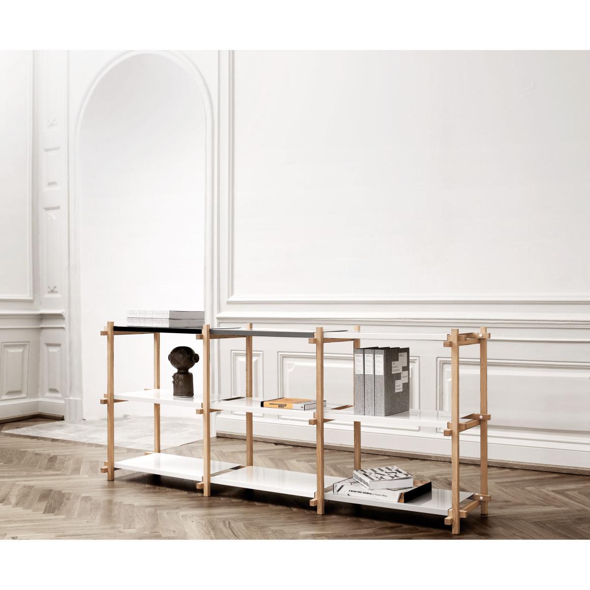 Woody is a modern interpretation of traditional ladder inspired shelving systems. With no apparent front and back it works well as a free standing piece of furniture as well as against a wall. One of the greatest strengths of the shelving system is the thorough simplicity which emanates from the idea that a shelving system should not be too visually dominant and should leave room for the items placed in it. Woody is created in the spirit of modernism. Nothing in the construction is hidden, all joints are visible and all parts are industrially manufactured. Simplifying and updating more traditional shelving systems has been a key element in the development of Woody which simply consists of oak sticks, bent steel and screws. At the same time great effort has been put into perfecting the joints in terms of form and strength. Solid oak is an incredibly strong material and it ages beautifully, so in spite of the lightness in its appearance, the structure is surprisingly strong and stable compared to other shelving systems of this type. The light soap treated oak provides Woody with a traditional Scandinavian expression, which is updated by the contrasting steel shelves. The shelves lie freely on the wooden frame.
