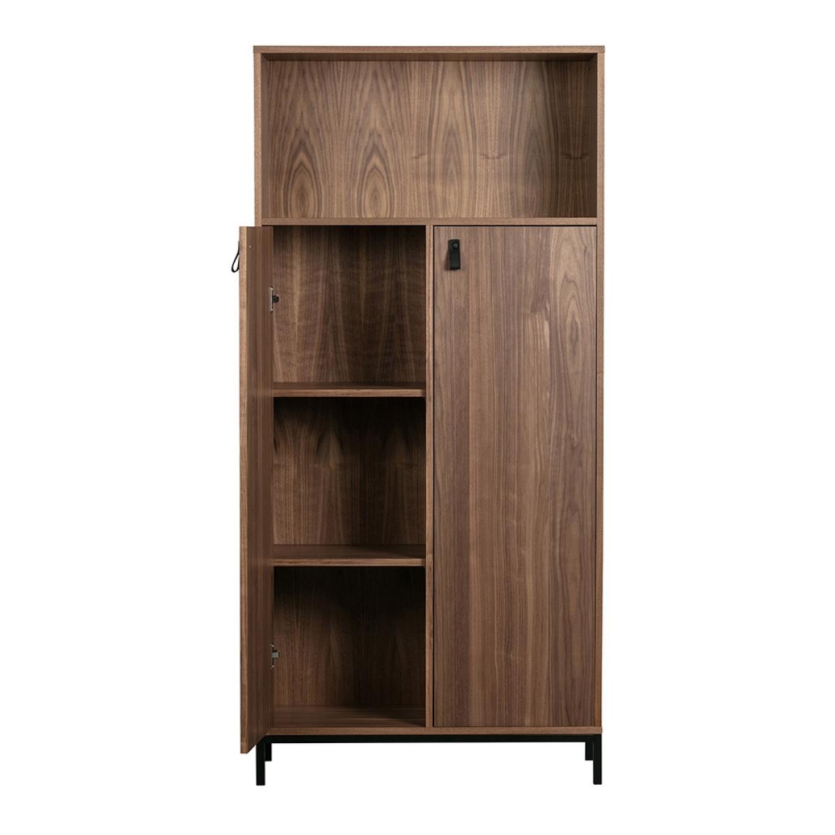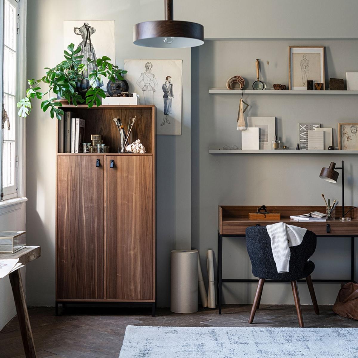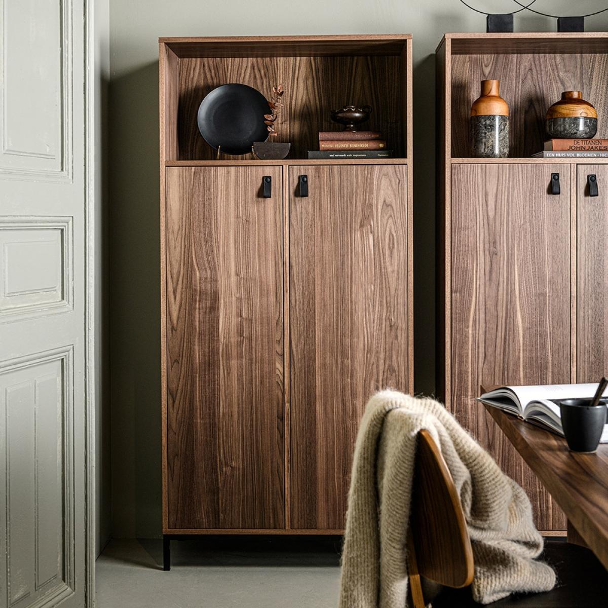 The ultimate cabinet for any book lover, the Woood Bookazine Bookcase is just what you need to home all those hardbacks! Not only a stylish storage solution but a practical one too; featuring double doors with 3 fixed shelves inside. You'll be in heaven with the amount of space this unit contains. Besides a place to display your favourite books, fill the top compartment with decorations, photo frames and pretty pansies for all to see! Crafted from walnut veneer in a brown finish paired with black metal legs; your space will be bursting full of industrial character!.