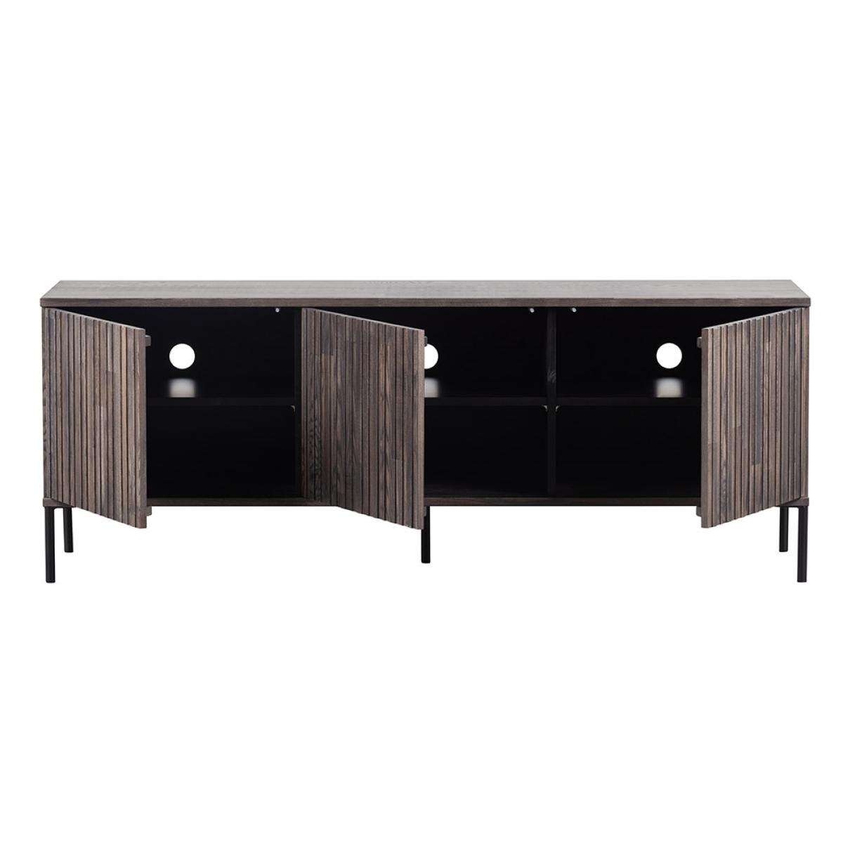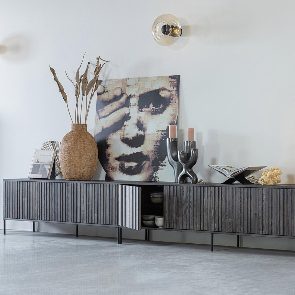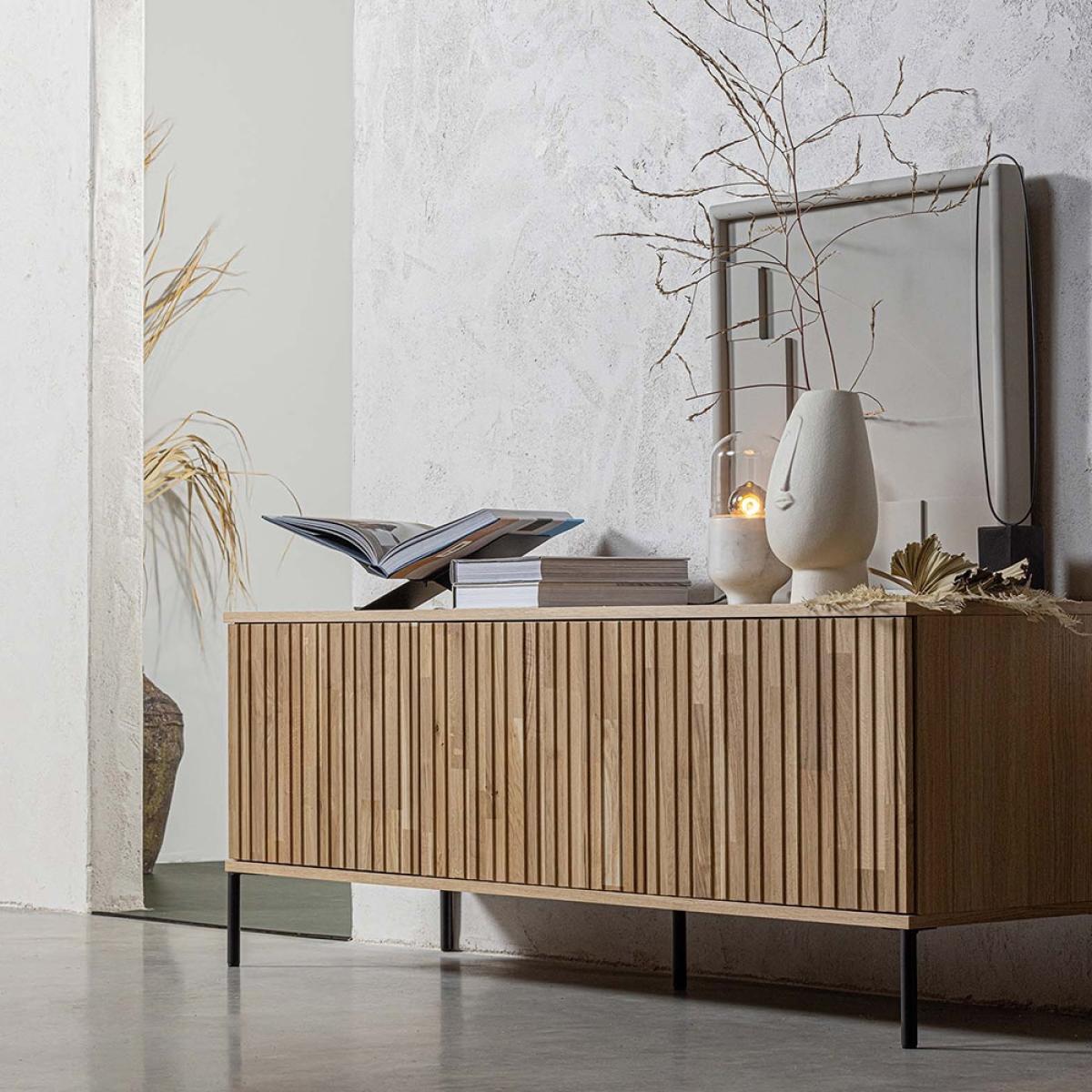 I love this media unit for its sleek, minimalist design which works well in contemporary and Scandinavian interiors. The combination of the black frame and natural wood finish makes it versatile enough to complement both warm and cool colour schemes. It’s a practical choice for those looking to keep their living space organised without sacrificing style. For styling tips, consider adding a few low-profile decorative objects, such as plants or books, on top to create visual interest without cluttering the surface. Inside, using baskets or storage boxes can help conceal electronics and accessories, keeping the clean lines intact. This piece is particularly ideal for larger living rooms or open-plan spaces where a bigger unit like this can anchor the room and provide ample storage.