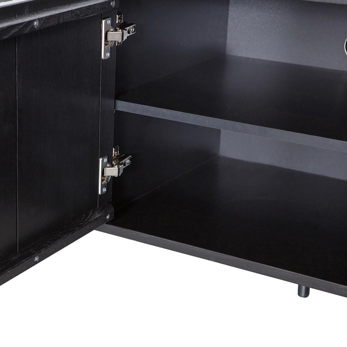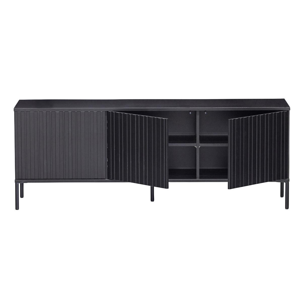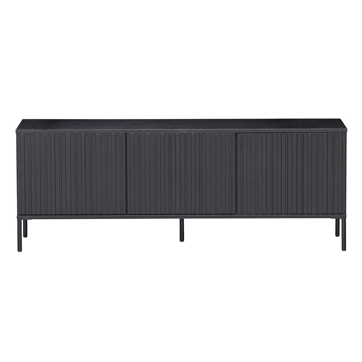 I love this media unit for its sleek, minimalist design which works well in contemporary and Scandinavian interiors. The combination of the black frame and natural wood finish makes it versatile enough to complement both warm and cool colour schemes. It’s a practical choice for those looking to keep their living space organised without sacrificing style. For styling tips, consider adding a few low-profile decorative objects, such as plants or books, on top to create visual interest without cluttering the surface. Inside, using baskets or storage boxes can help conceal electronics and accessories, keeping the clean lines intact. This piece is particularly ideal for larger living rooms or open-plan spaces where a bigger unit like this can anchor the room and provide ample storage.