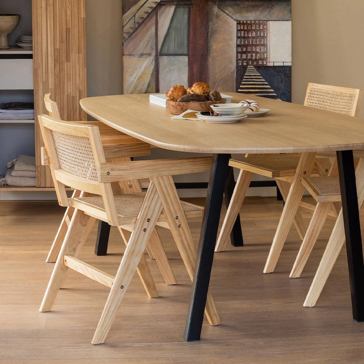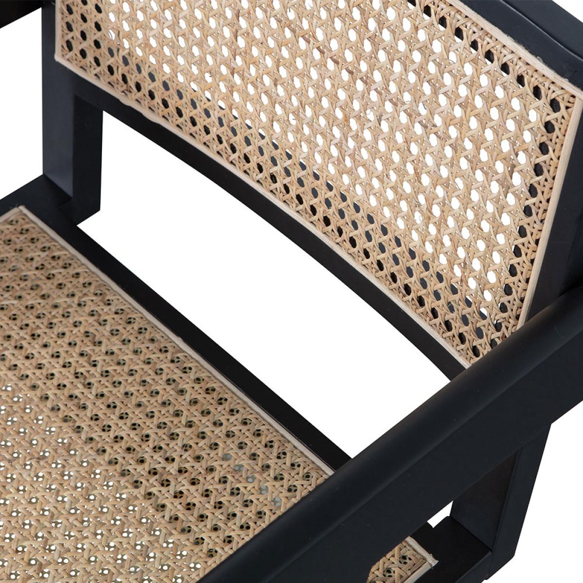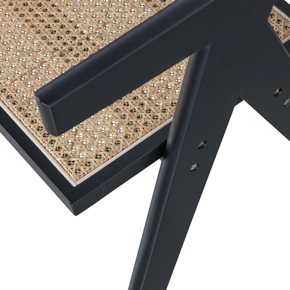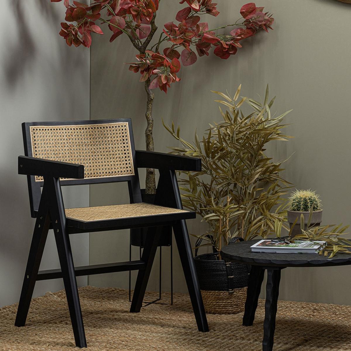 Taking inspiration from traditional Japanese styles, but with a Scandi spin - the Woood Gunn Dining Chair offers the best of both! This Japandi pairing couldn't be more perfect! Finished in black, the responsibly sourced pine wooden frame gives a bold base to contrast the woven rattan cane webbing seat and chair back. Relax for longer with the dining chair's gently angled back and armrests for added support. Style with a square dining table in the same shades or soften the straight lines with something circular! Or simply use as an accent chair! It's striking enough. That's for certain!.