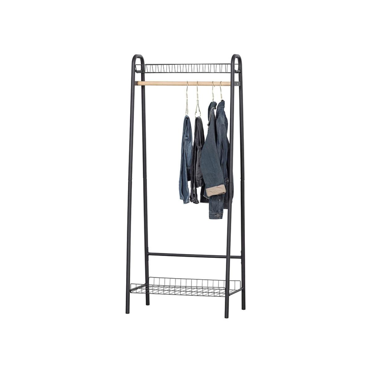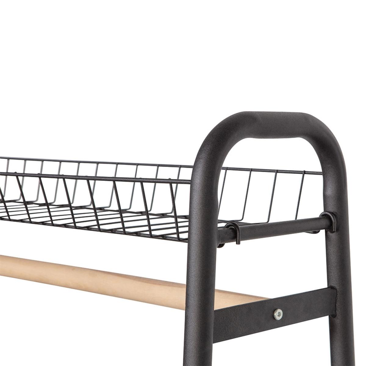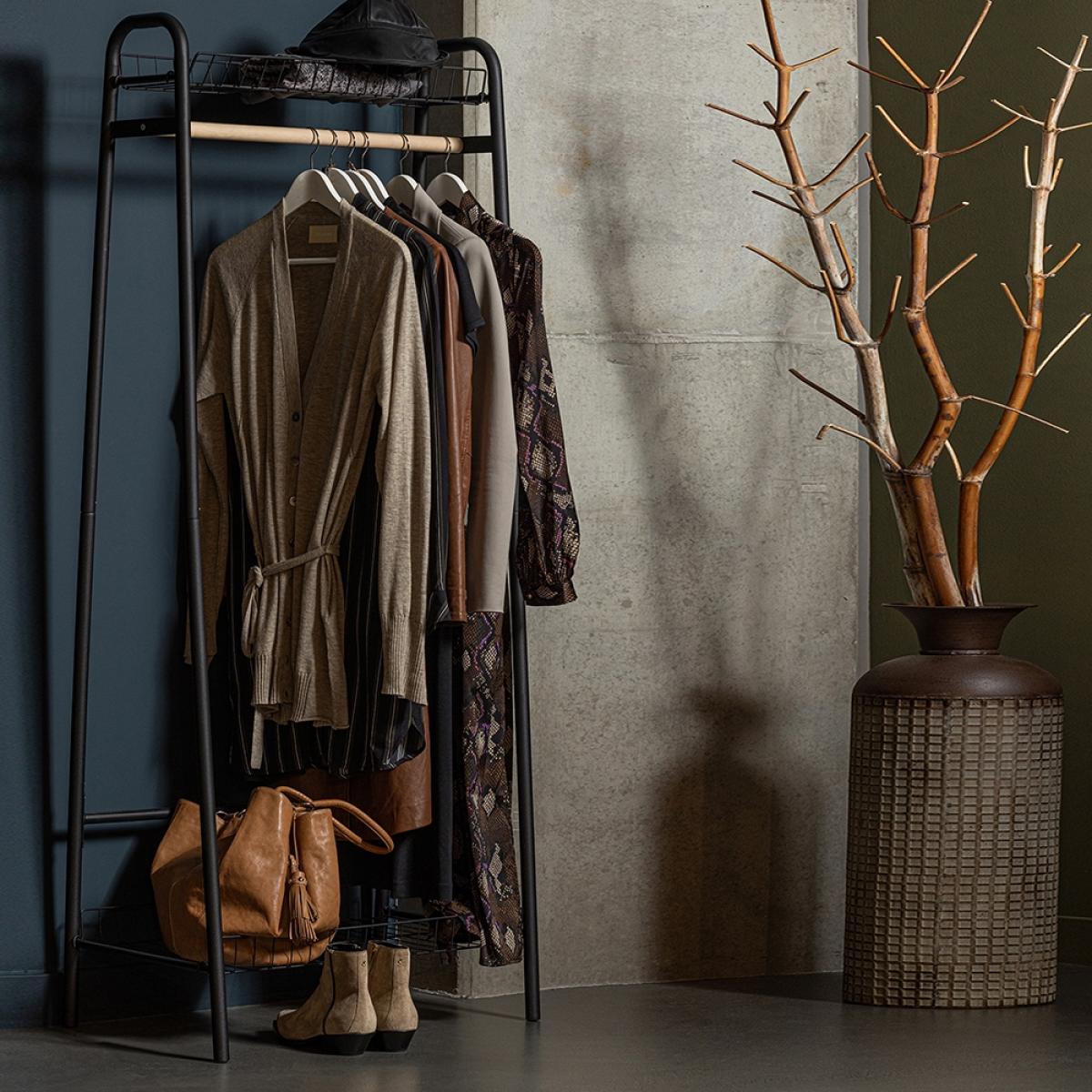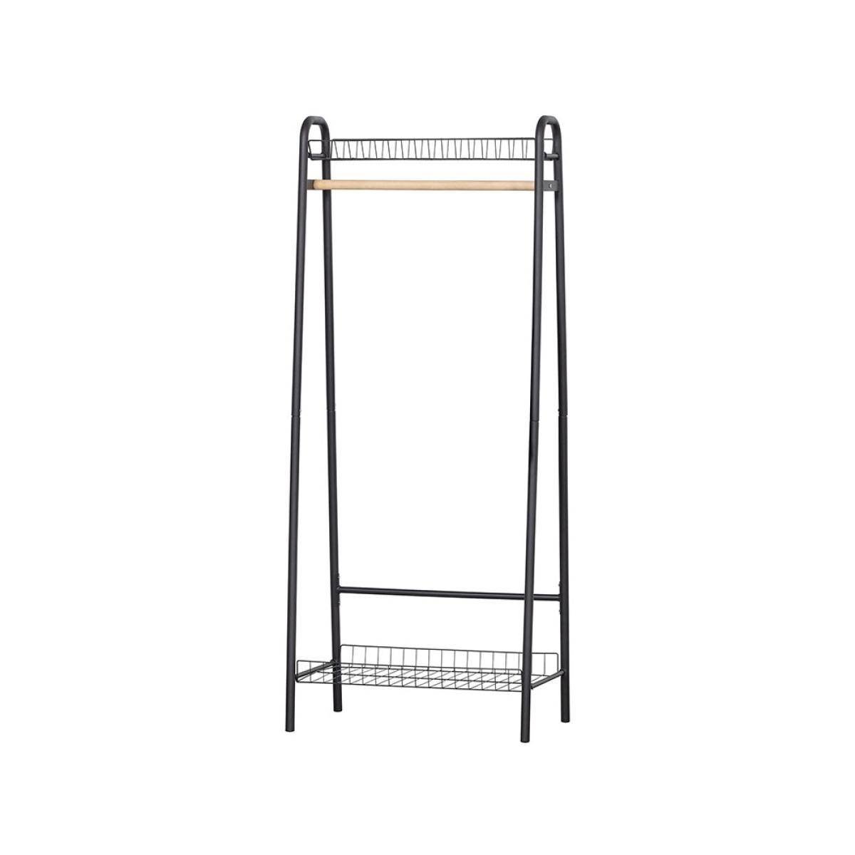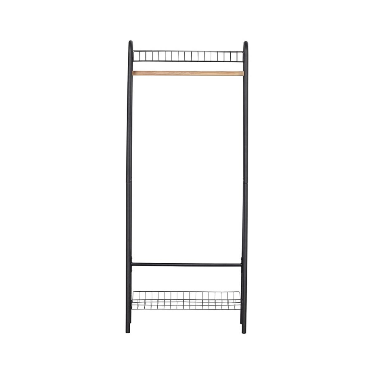 From boot rooms to bedrooms - the Woood Jovi Clothing Rail keeps homes organised! Wherever the Jovi clothes rack ends up, the strong metal frame with matte black finish will fit in with your chosen colour scheme. The wire shelves make better use of your space - store hats, bags, shoes and boots on each and keep floors clear. Hang coats and clothes on the full width wooden rail and scarves and accessories have a home at the ends. As the design is open, you'll have no trouble finding your favourites before you run out the door!.