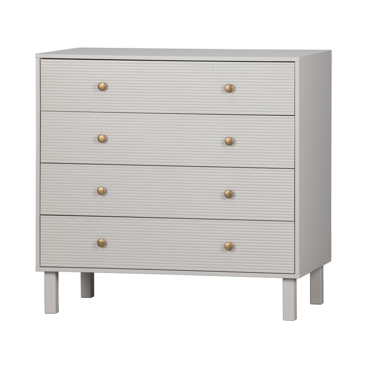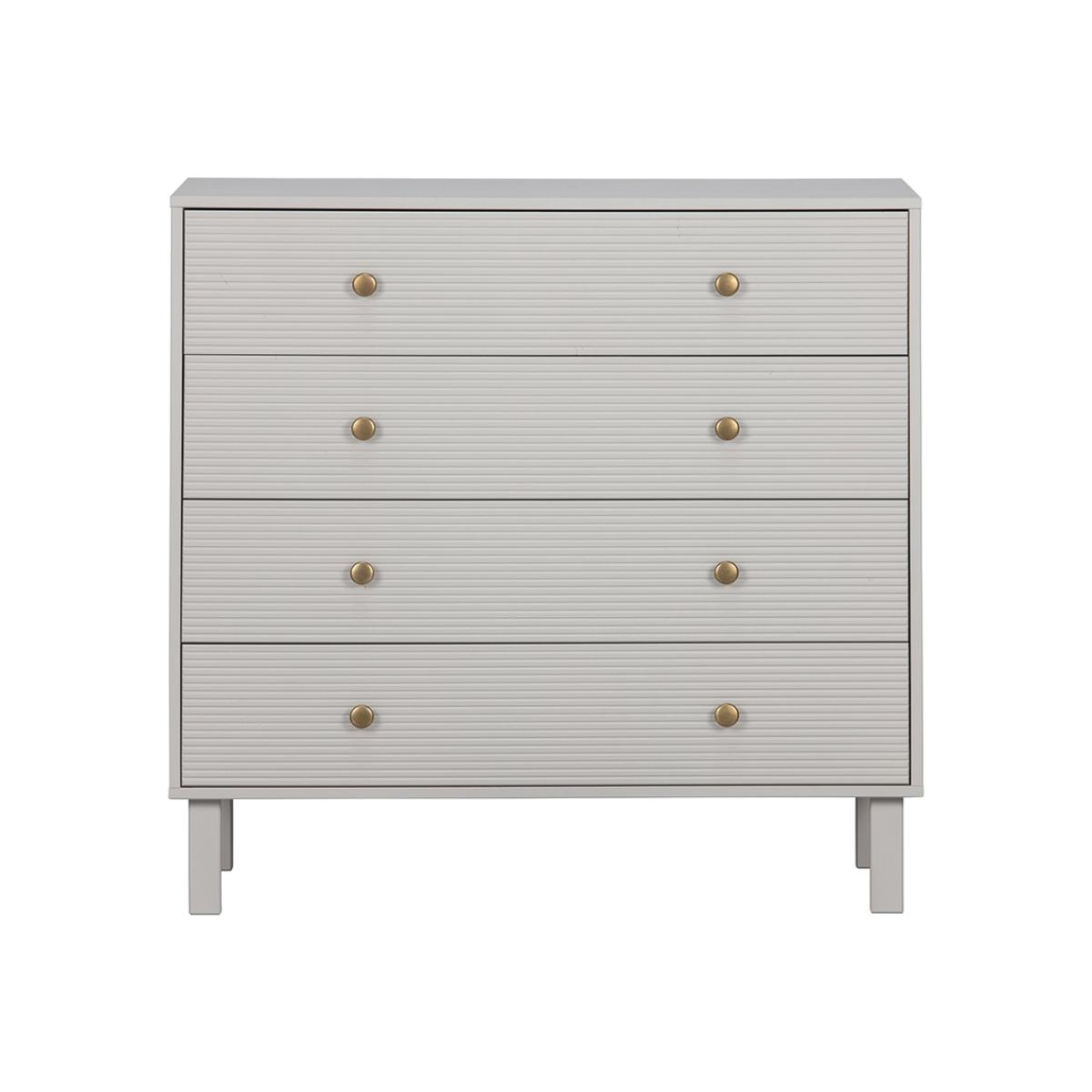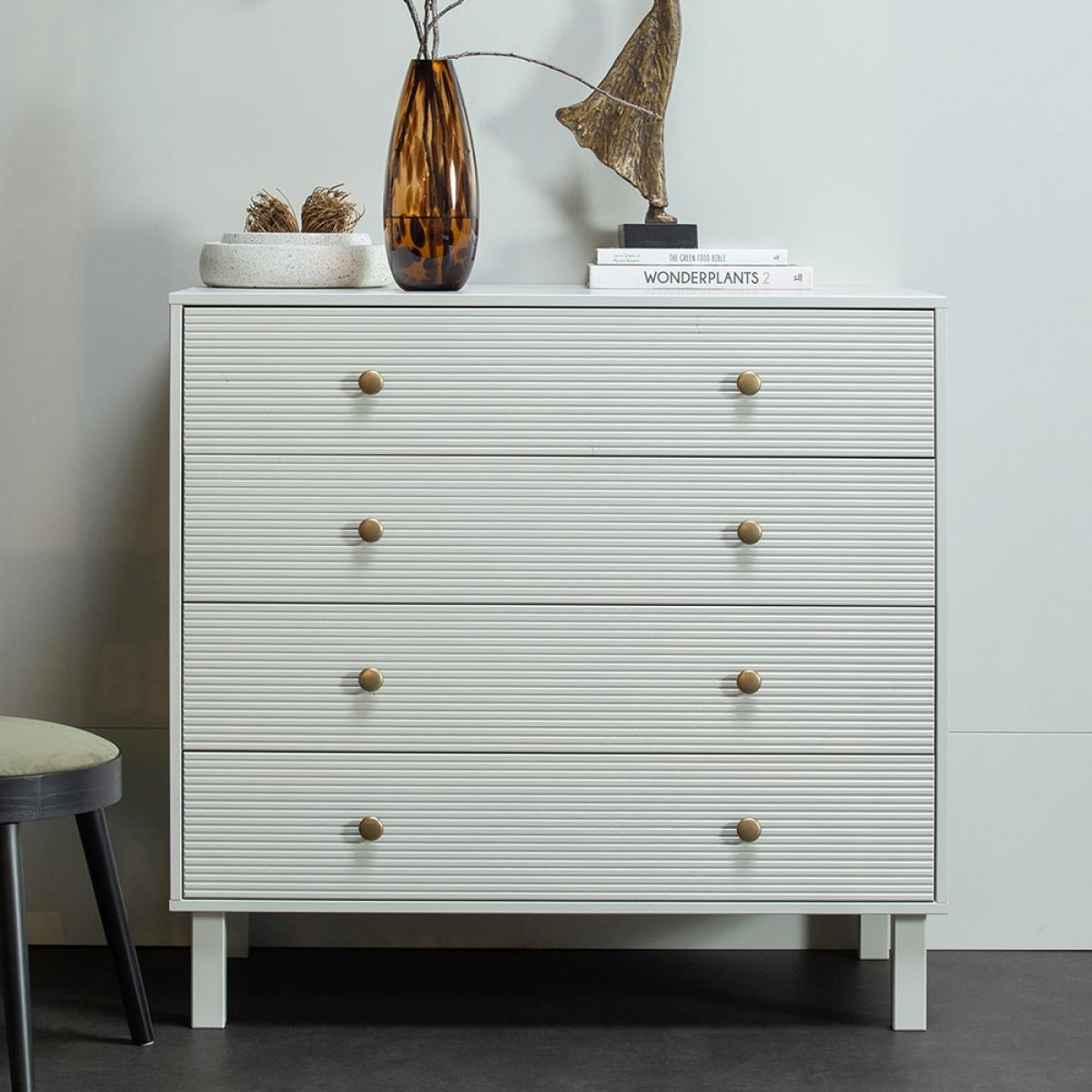Add some modern glamour to your home with the Madu Chest of Drawers from Woood. Crafted from FSC Pinewood in a timeless cloud grey finish with statement ribbed drawers and gold handles, this chic and sturdy cabinet is perfect for storing clothes and accessories in your bedroom or for your living room to keep clutter at bay. Pair this with other products from the Madu range for a chic and contemporary interior.