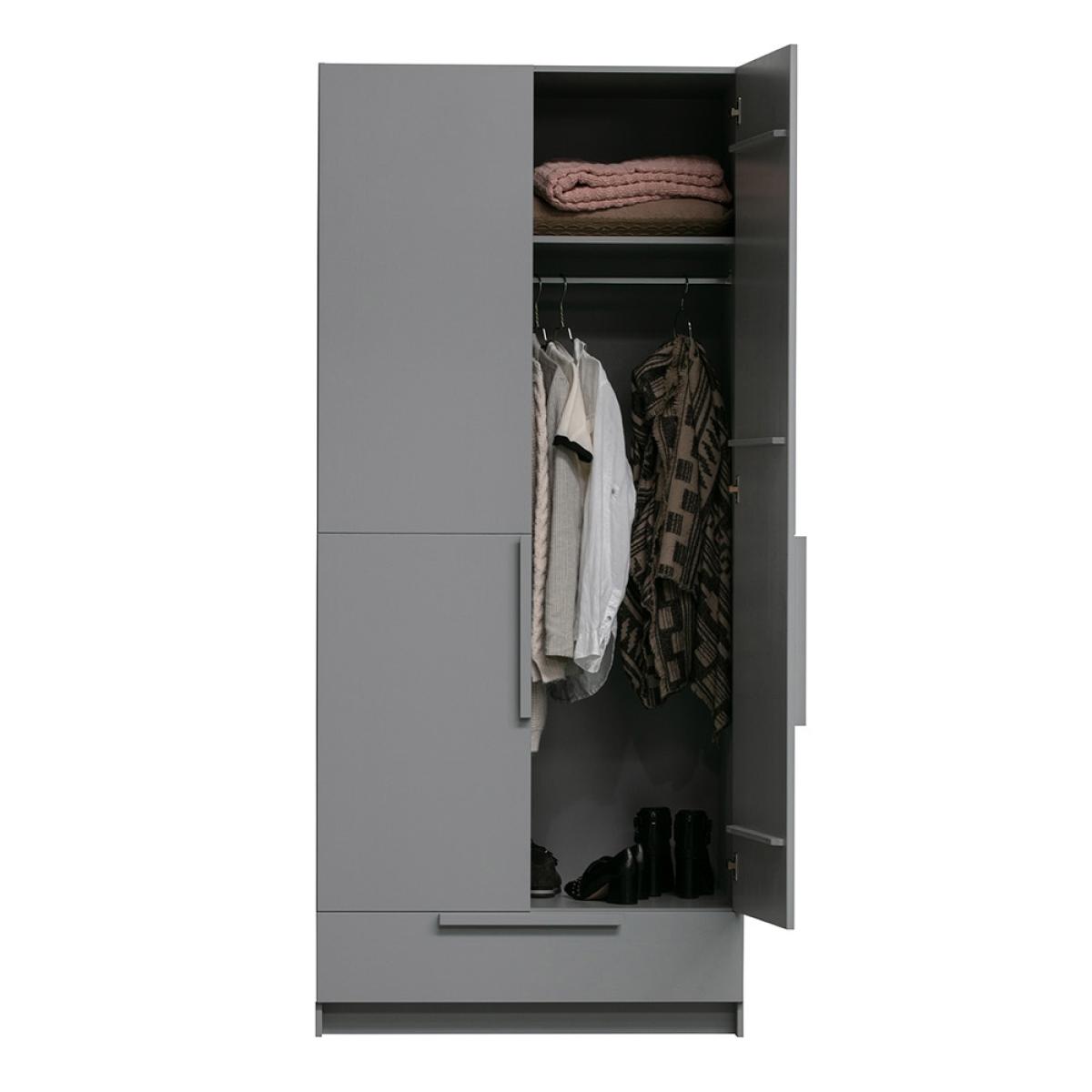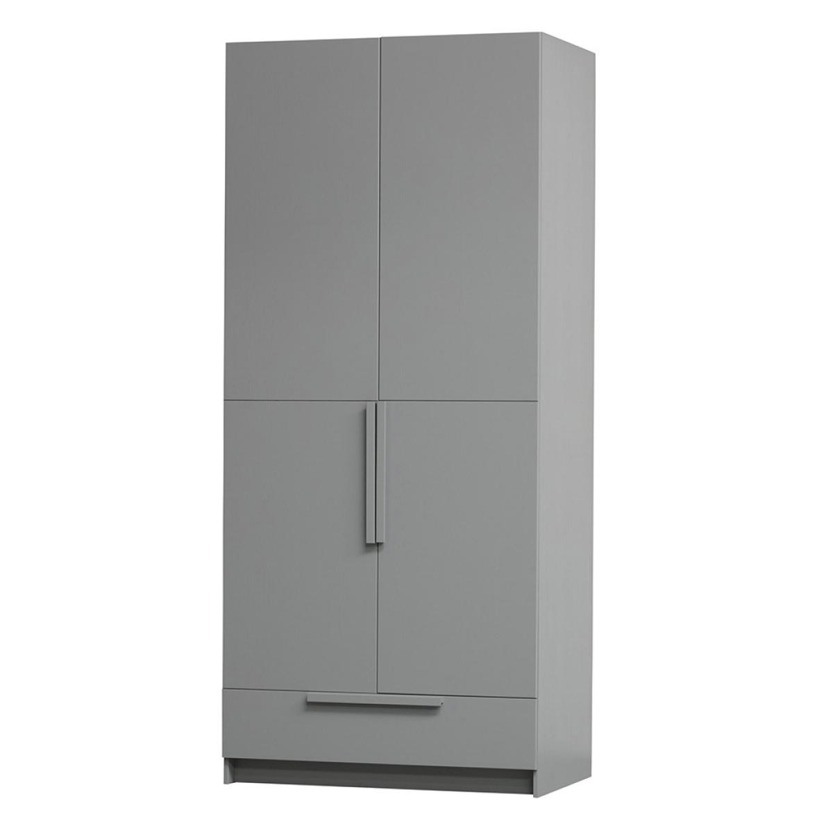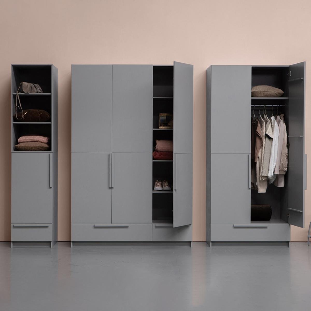 The Pure Collection from Woood is a stunning contemporary range of bedroom storage solutions. The Pure 2 Door Wardrobe is constructed from sustainable FSC pine by our friends in the Netherlands and finished in an on trend dust or concrete grey sanded finish giving it a super sleek look. The 2 doors feature a groovy little groove across the front which creates the impression of split doors for added interest. There is a useful double width drawer at the bottom and it, along with the wardrobe doors, all have robust handles and soft close hinges. This double wardrobe internally has a full width hanging area with full width shelf above. If more storage is required you could build a wall of Pure Wardrobes – take a look at the three door triple wardrobe and single width cupboard, get the measuring tape out and see how many you can fit in to give you a customised wardrobe wall!.